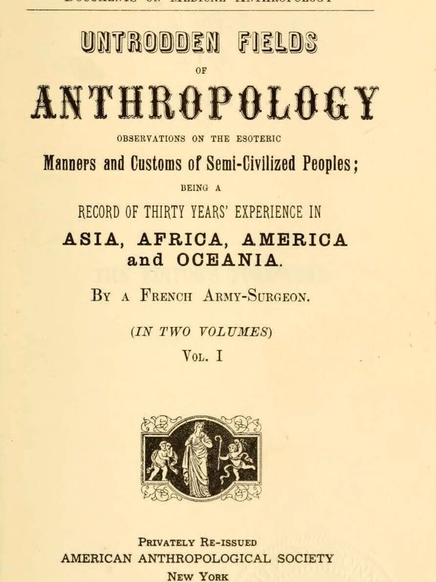 - [as ‘A French Army-Surgeon’] Untrodden Fields of Anthropology — Observations on the Esoteric Manners and Customs of Semi-Civilized Peoples; being a Record of Thirty Years Experience in Asia, Africa, America and Oceania, Laon, 1896; repr. as ‘New York, ‘Privately re-issued by the American Anthropological Society’, 1896, 2 vols., 768 p.; 2d ed. Paris, Librairie de Médecine, Folklore et Anthropologie [C. Carrington], 1898, 2 vols, 845 p. [preface by C. Carrington] [email hidden; JavaScript is required]; repr. New York, Falstaff Press, 1937.
