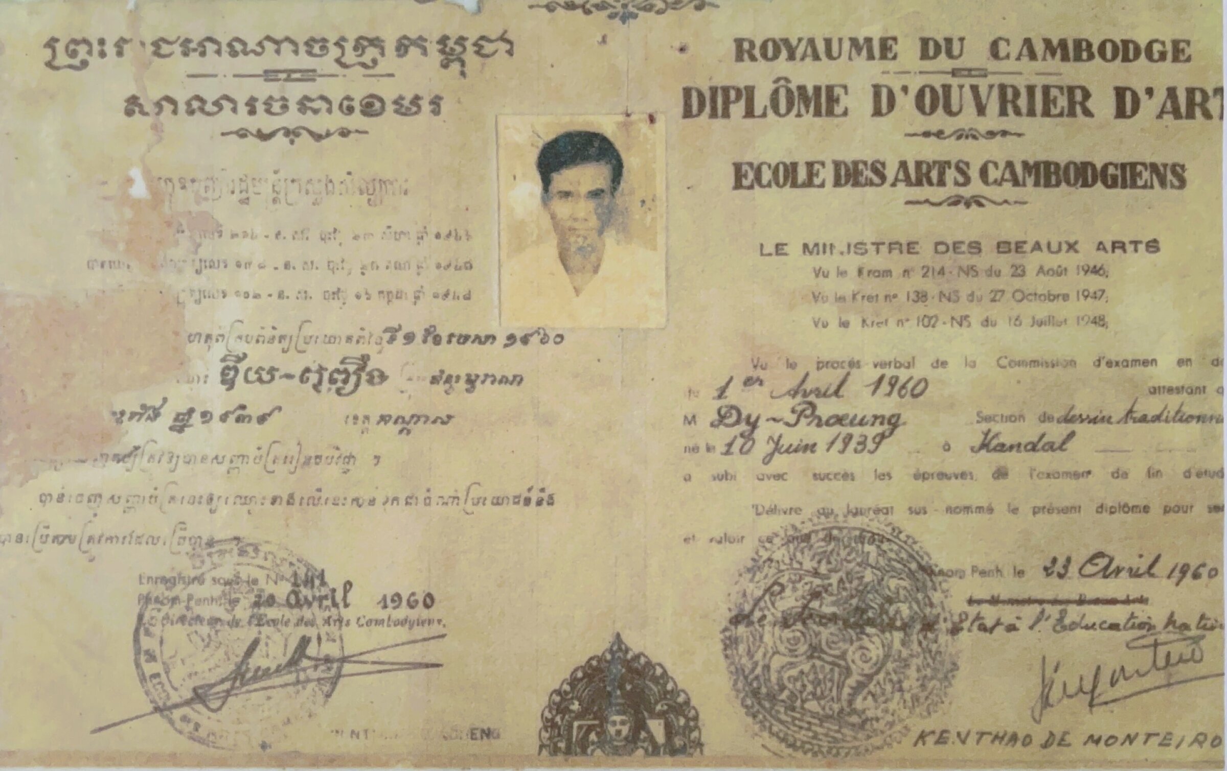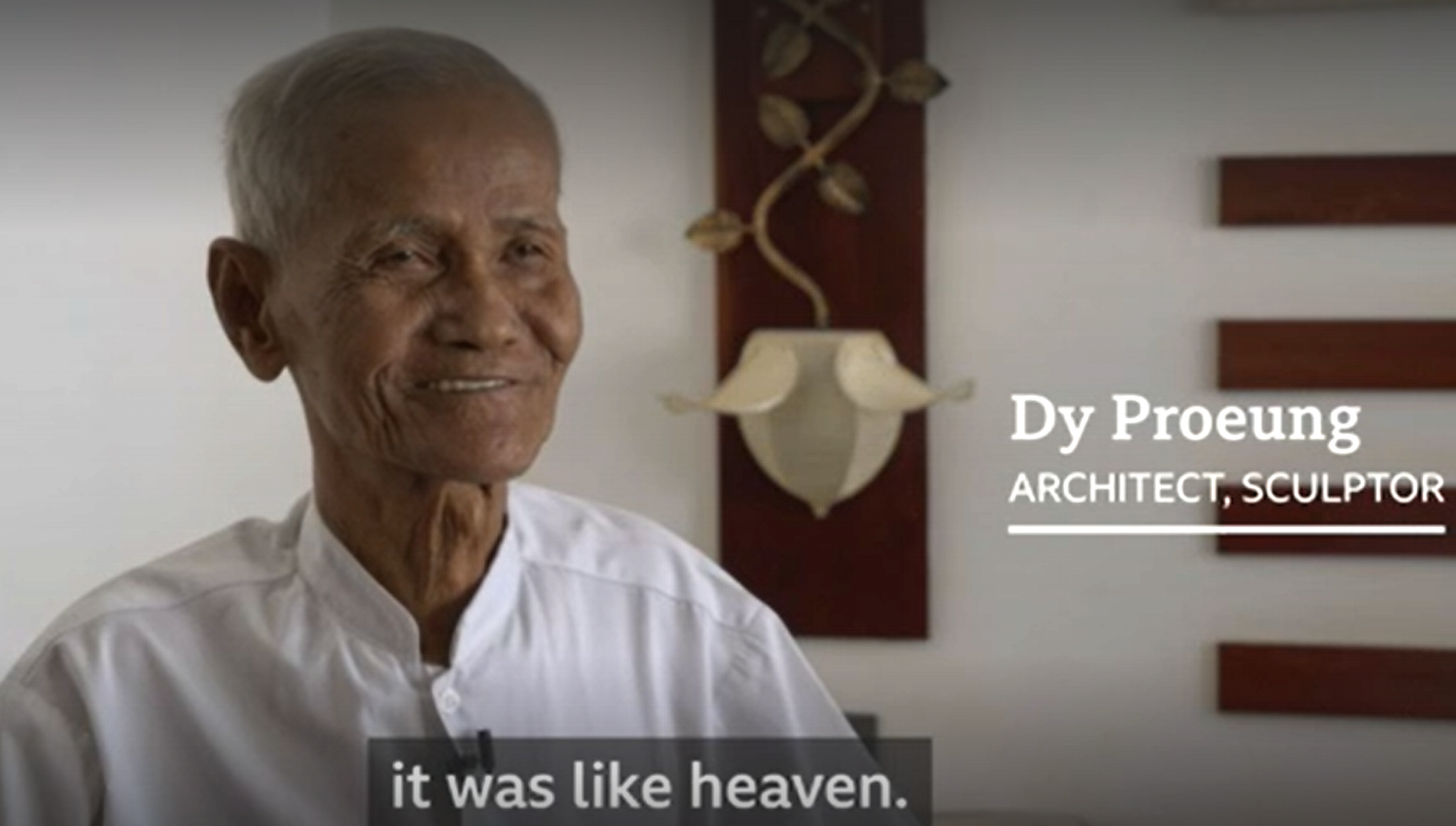1) Diplome d’ouvrier d’art granted to Dy Proeung on 23 April 1960 and signed by then State Secretary of National Education, Kenthao de Monteiro. [Dy Proeung’s Collection at Angkor Database (DPCADB6)] 2) “The first time I saw Angkor Wat, it was like heaven”, recalled Dy Proeung shortly two years before his death for BBC reporter Naotomo Umewaka [“Cambodia’s ‘hidden’ Angkor Wat: The secret drawings of Cambodia’s ancient temples”, BBC, 18 June 2020, screen capture].