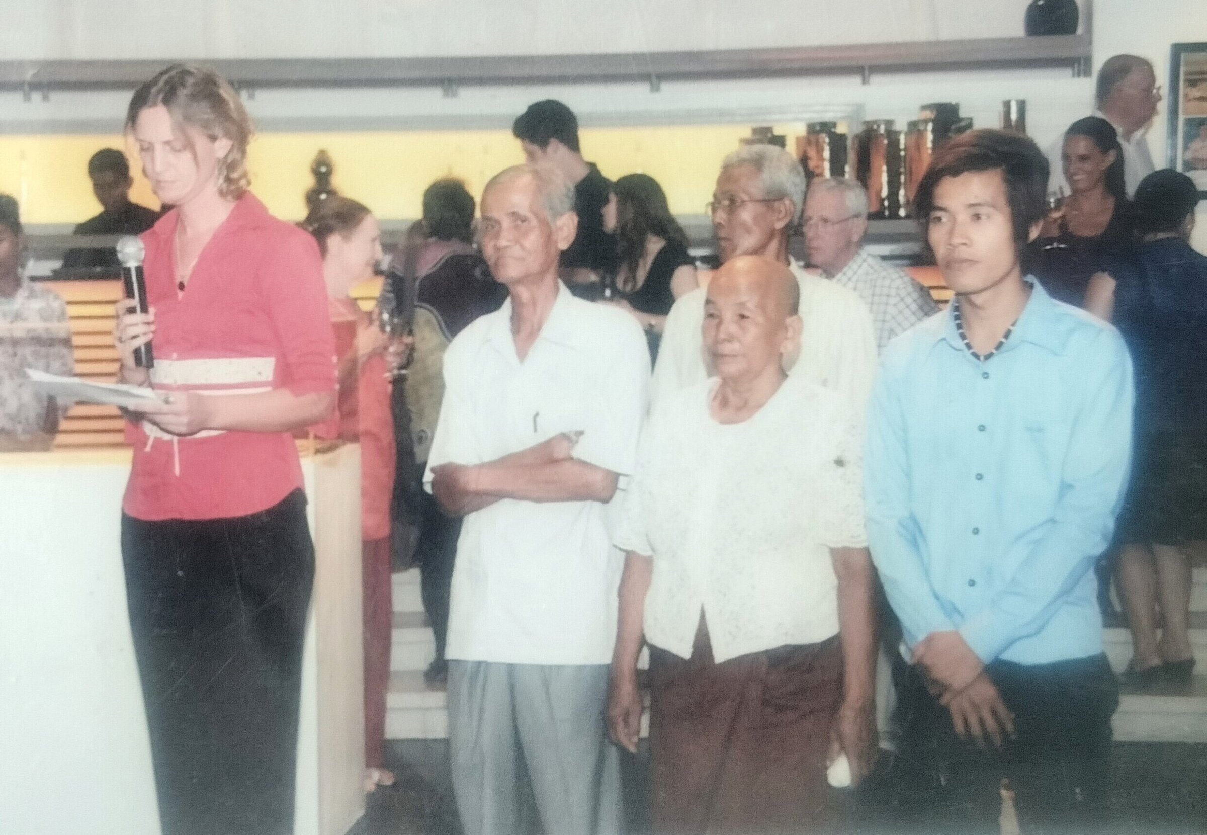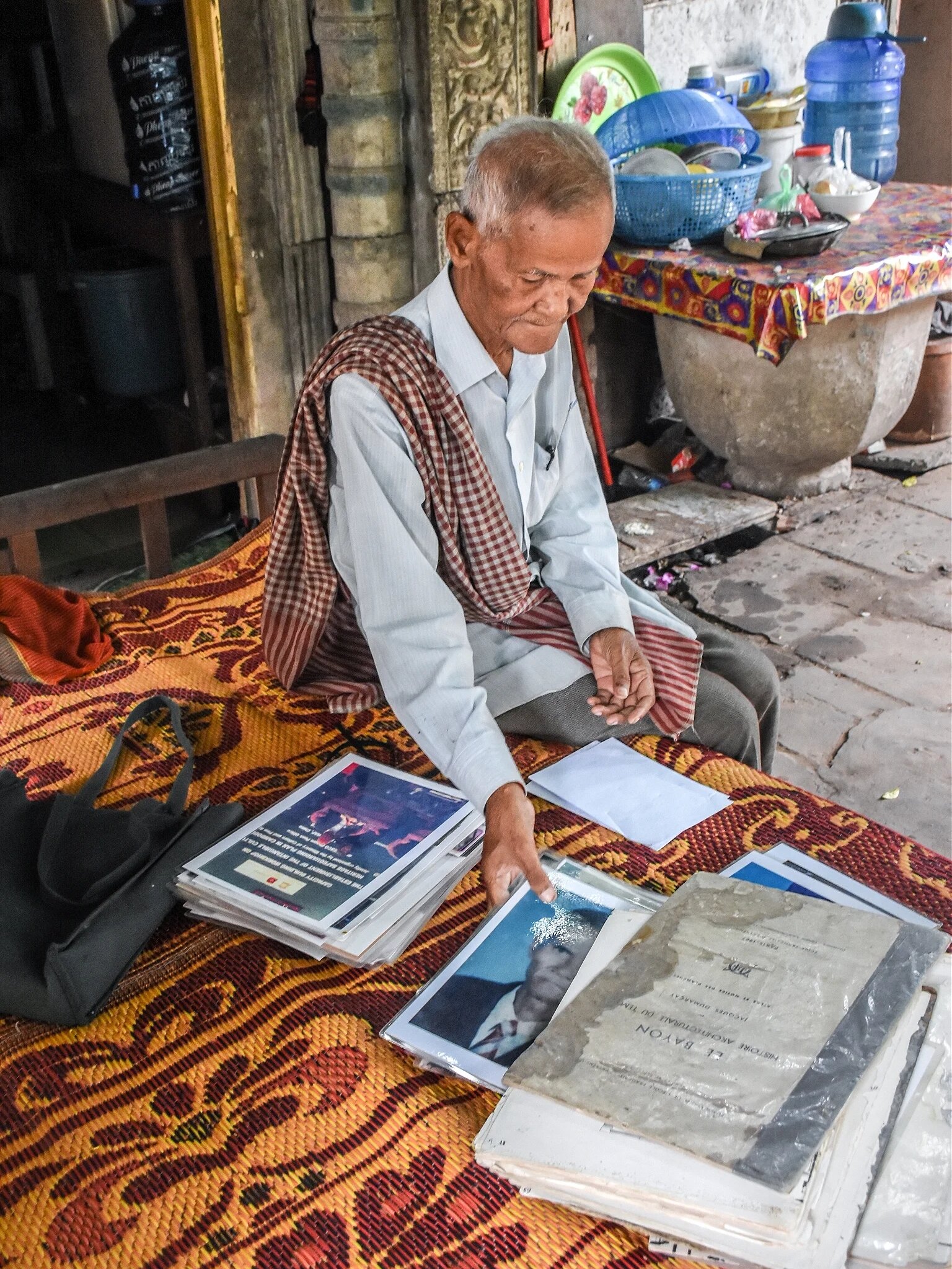 1) Receiving the Pisnuloka Trophy in 1995[DPCADB10]. 2) Sorting some personal papers during an interview with Roads&Kingdom, 5 Nov. 2018 [photo by Zoe Osborne].