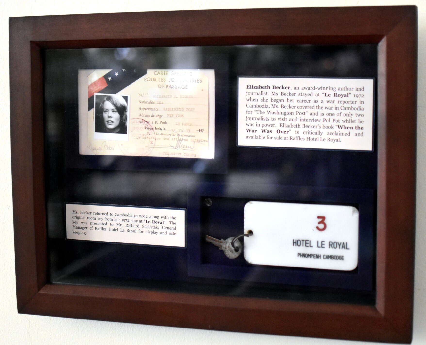 1) Elizabeth Becker with Long Boret in 1974 (author’s collection). 2) A display commemorating her stay at The Royal (now Raffles Hotel), Phnom Penh. [photo by Phallegra Mendelson/Globe].
