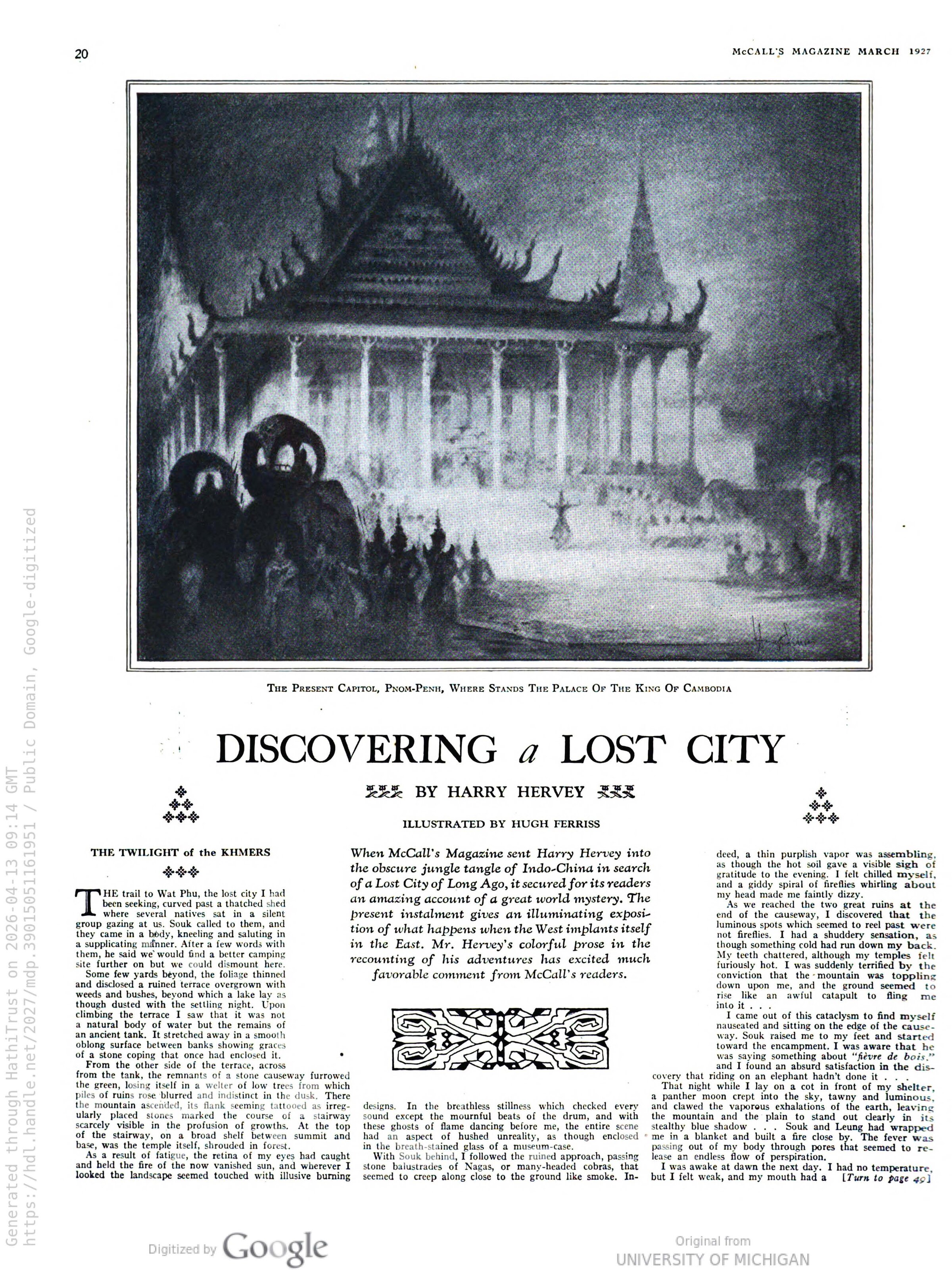 - Illustrations for Harry Hervey, “Discovering a Lost City” [about Ancient Cambodia], McCall’s Magazine, Jan., Feb., March, Apr. 1927.