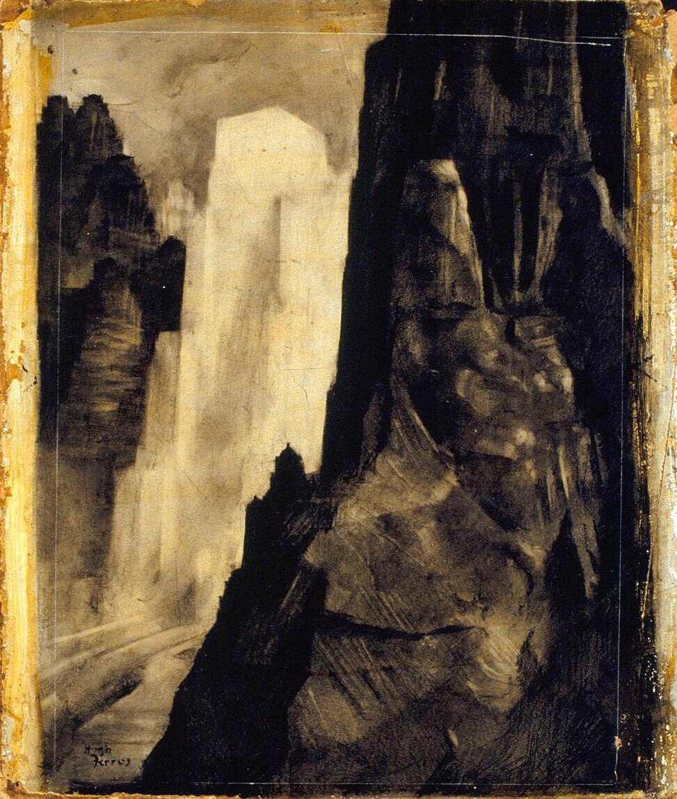 Hugh Macomber Ferriss (12 July, 1889, St Louis, Missouri, USA – 28 Jan. 1962, New York City, USA) was an American architect, architectural artist, and poet who found inspiration in ancient cities, Angkor among others, in his visual exploration of modern urban life.