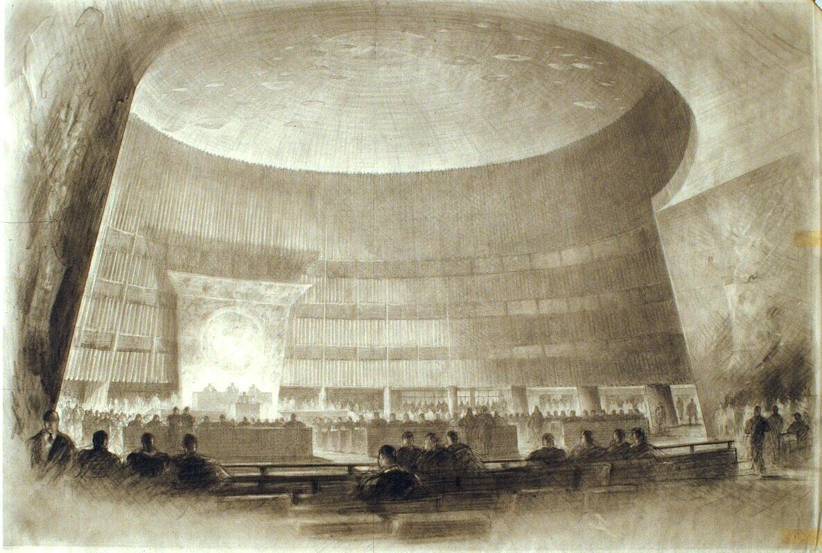 In 1955, he was elected into the National Academy of Design as an Associate member, becoming a full Academician in 1960. Afrer his death in 1962, his professional drawings and papers were deposited at the Drawings & Archives Department of the Avery Architectural and Fine Arts Library, Columbia University. The Avery Library team confirmed to us that five photostats of Ferriss’ 1927 drawings for Harry Hervey’s article were kept in their repository, while many of the artist’s “Ancient World” and travel-related sketches were donated separately by his estate to the Cooper Hewitt, Smithsonian Design Museum in New York.