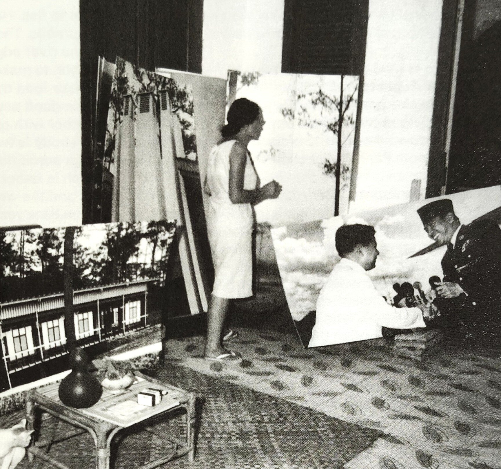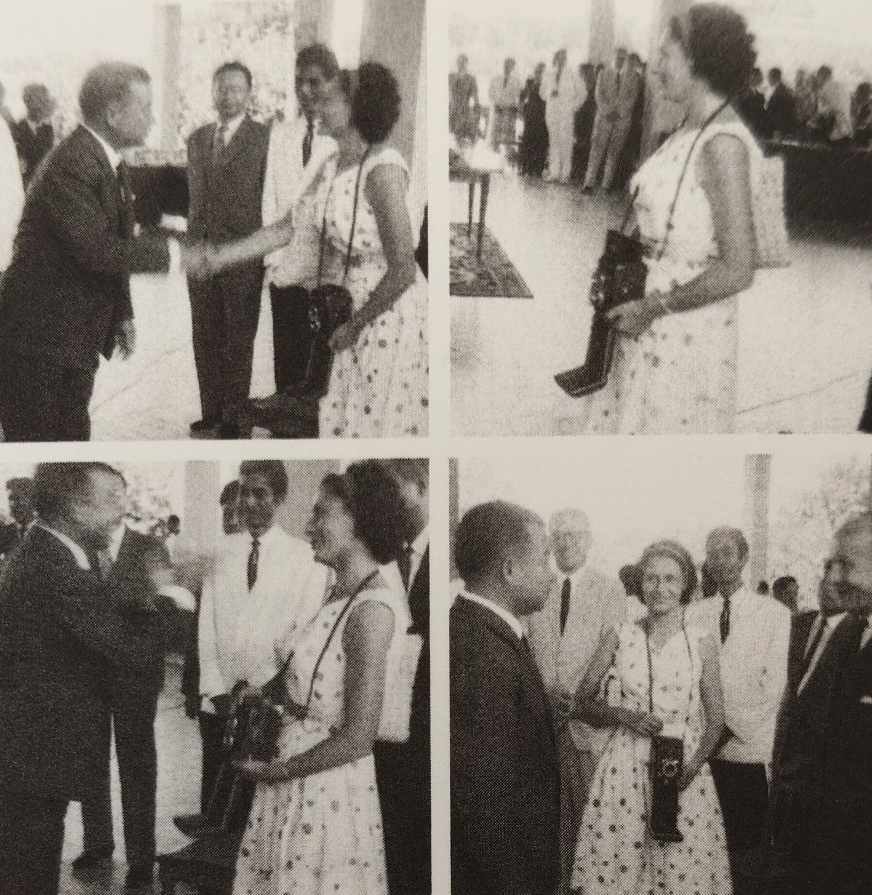 1) Prince Norodom Sihanouk greeting Micheline Dullin during a reception at the Royal Palace, 1963. 2) With Prince Sihanouk at Angkor. 3) At her Phnom Penh apartment-workshop. 4) Checking on the giant prints of her photographs of Prince Sihanouk welcoming Indonesian President Sukarno during one of his several visits to Cambodia. [all photos by Robert Favard, from Cambodge 1958 – 1964, Une vie de photographe, 2012)