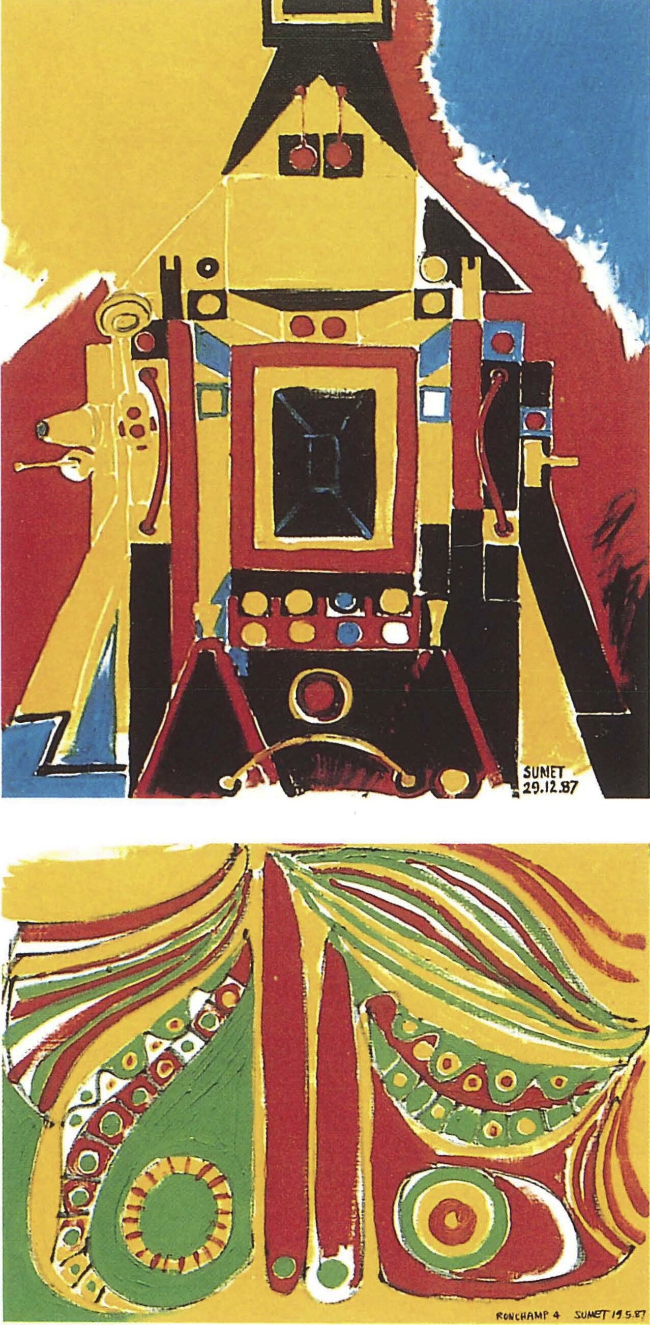 1) Bank of Asia (Robot) Building in 1986 after completion [photo by Sumet Jumsai]. 2) Two paintings by Sumet Jumsai, Robot (top) and Ronchamp 4 (bottom), 1987.