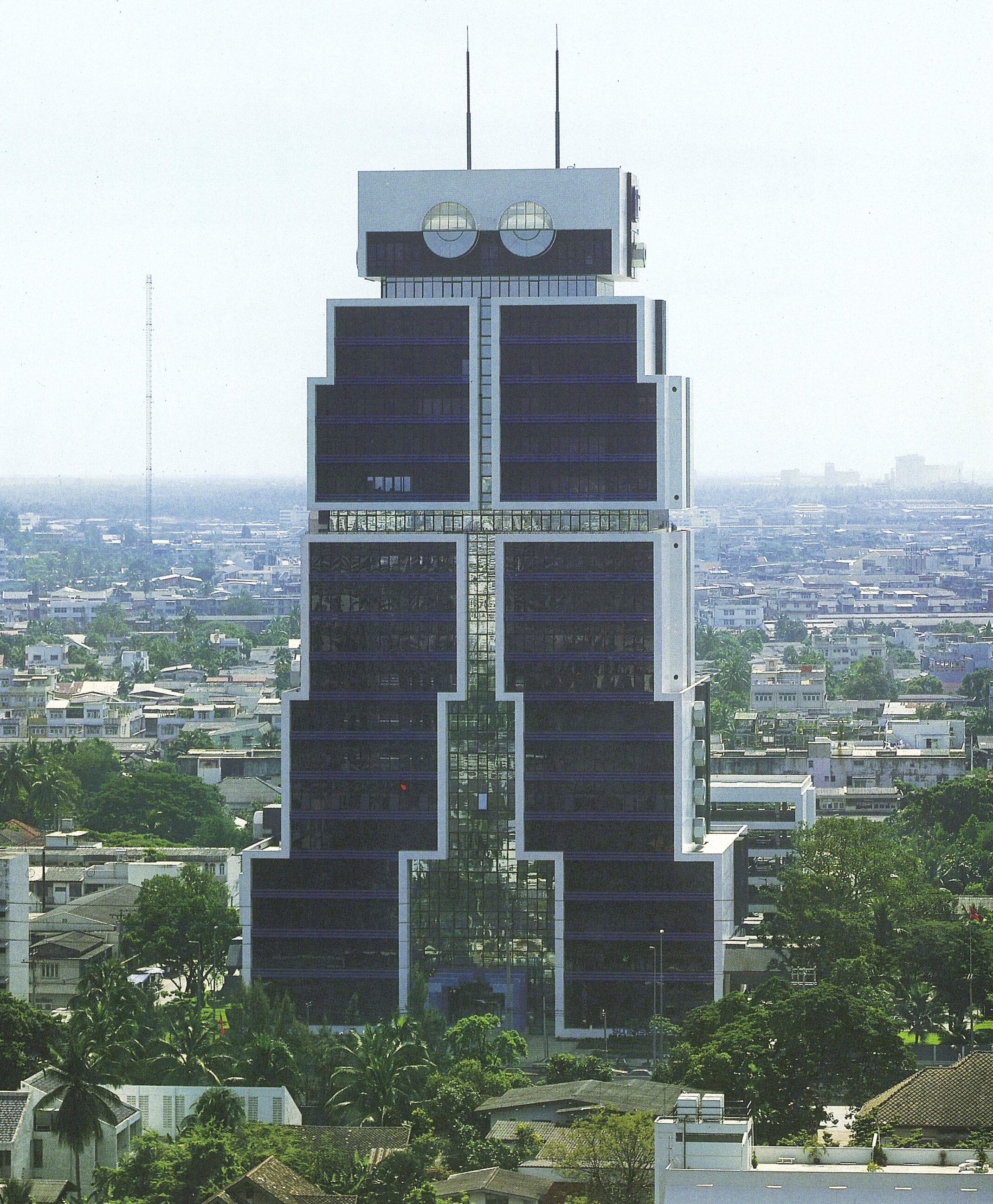 1) Sumet Jumsai in the 1990s [author’s collection]. 2) The Bank of Asia headquarters, a 20-storey high-rise on Sathorn Road inaugurated in 1986 and known as The Robot Building, one of the architect’s iconic realizations and a Bangkok postmodernist landmark. In November 2023, Jumsai posted on social media: “We must not let this “Legend” gone forever!” [photo Timeout.com].