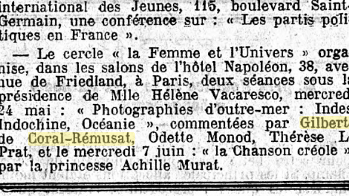 On 24 May, 1939, Le Prat joined Gilberte de Coral-Rémusat and Odette Monod in Paris for the conference Photographs from India, Indochina and Oceania [source: Le Temps/BNF].