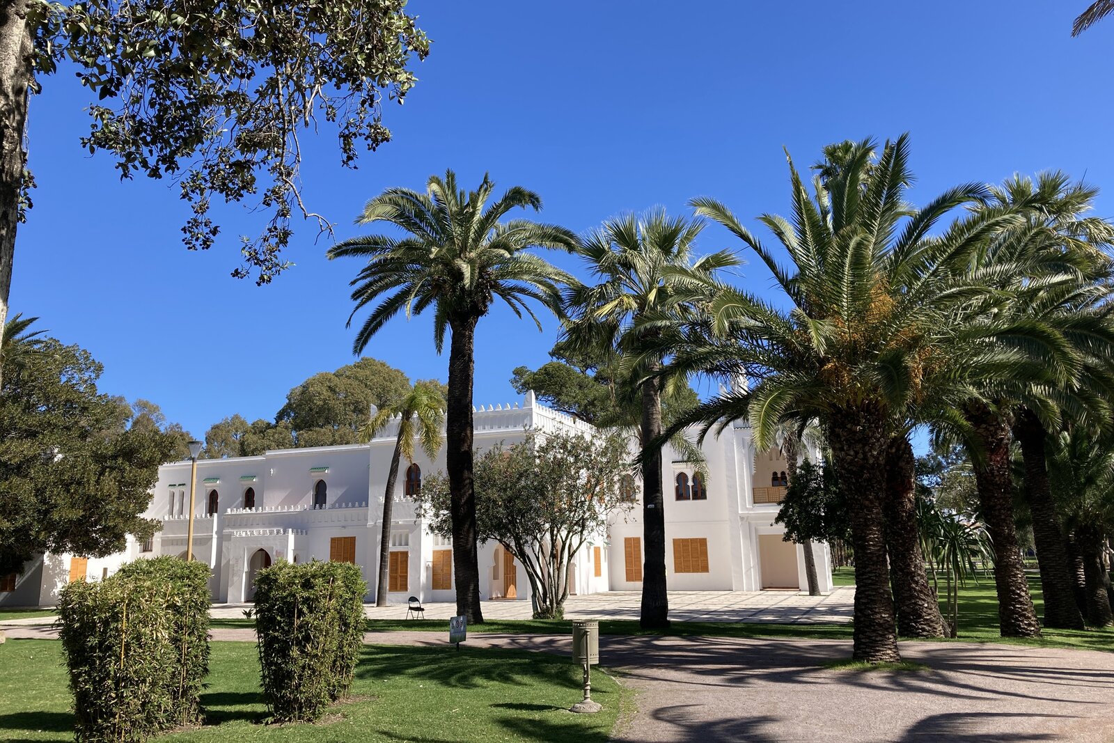 1) ‘Villa Harris’ in Tangiers, on the road to Cape Malabata [1909 postcard reproduced on TangerRetro blog]. 2) Used as a casino, then as a Club Med resort until 1992, the villa was abandoned during two decades before being restored and converted into a museum in 2021[photo by Stelmaris via Wikicommons, 2024].