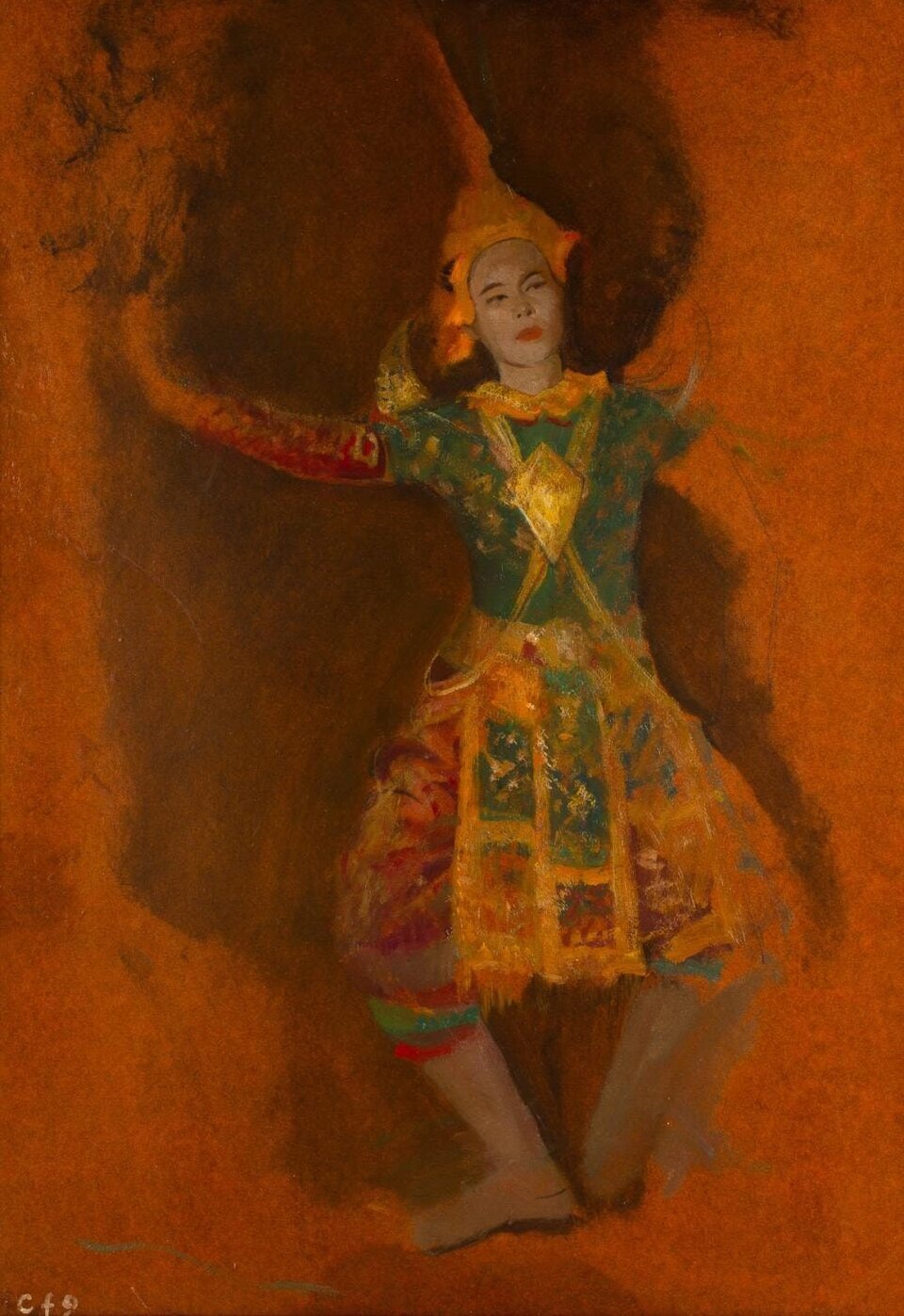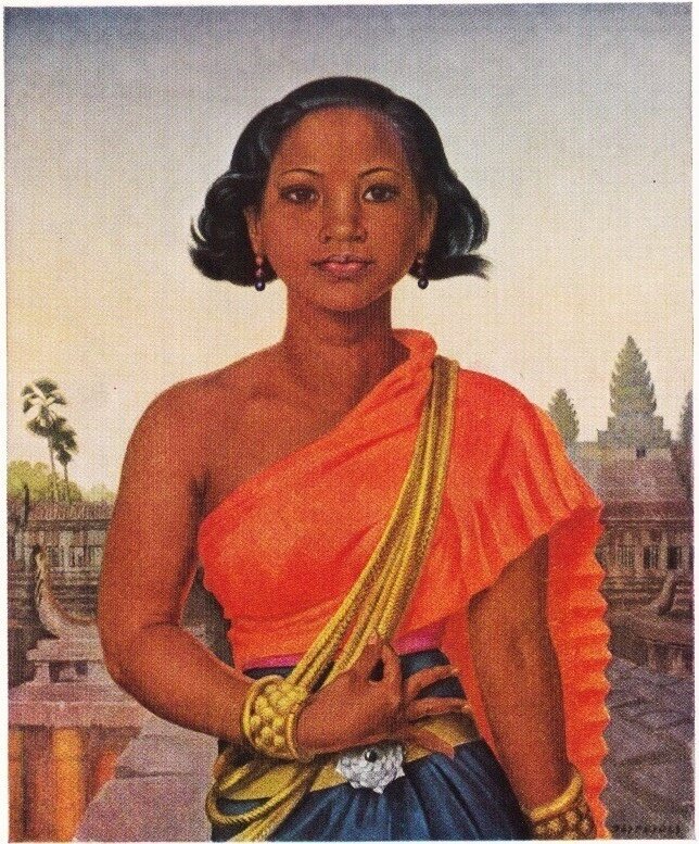 The visiting dancer and authoress of the book remarked, without naming her, “the star of Princess Say Sangvann’s troupe in flying attitude, right hand in hamsasya, left hand pataka.” At about the same time, Sir Gerald Kelly was painting sketches of the same dancer, ‘Sem’, Saem សាអែម, whom the princess had adopted as a foster child. And, also in 1937, French artist Jean Despujols portrayed Saem on a bridge at Angkor Wat, as researcher Kent Davis was able to identify her on a iconic painting.