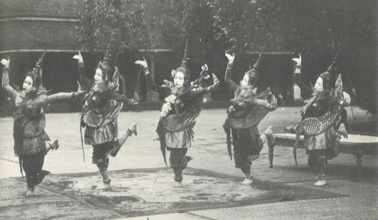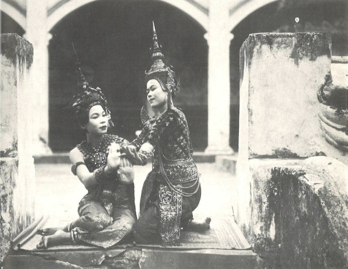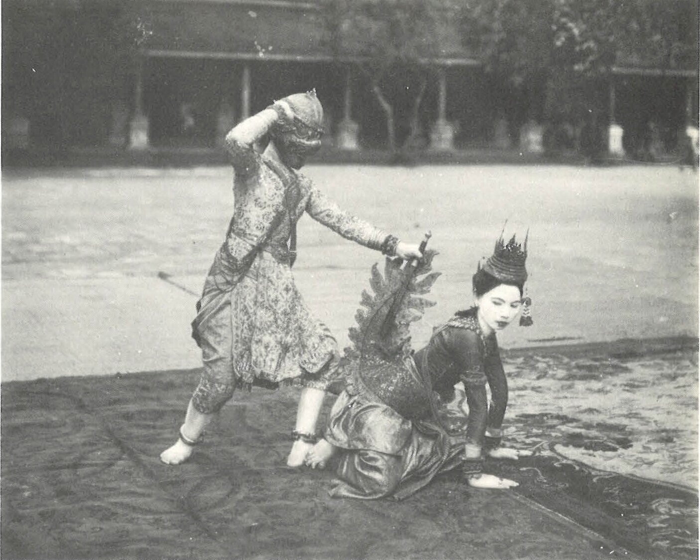 The King was especially delighted with the girl, a real beauty, who played the part of the prince. He watched her, constantly smiling, and many times during the ballet, beckoned to one of the two guardians, who came hurrying across the dance floor, crouching amid the dancers as inconspicuously as possible, to the King, where she knelt before His Majesty with her hands in Anjali. The King then handed her a package of money, indicating the dancer on whom he wished to bestow it. The old woman would place it on a silver tray, and crouching again inconspicuously among the dancers, would kneel before the chosen one, proffering the tray and the present. The dancer, with no sign of recognition other than a lowering of the eyes to rest for a brief second upon the offering, danced straight on. The old attendant then carried the tray and package to the exit door where the dancer would claim it after the ballet.