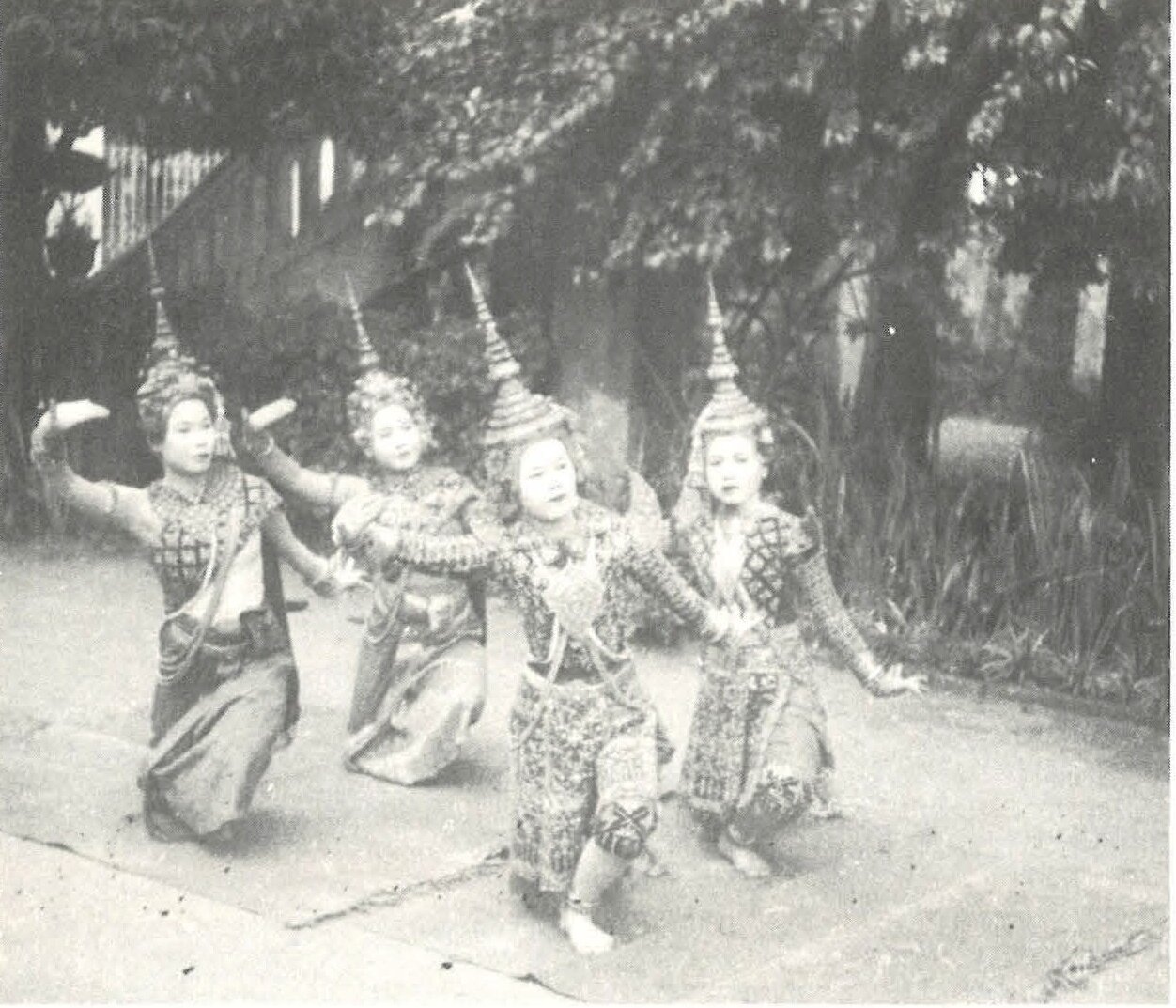 This elaborate ceremony takes place inside the Royal Palace. At Princess Say Sang Van’s, the same ceremony in simpler form is enacted. My own lessons were accomplished thus : After watching the ballet practice in slow and fast tempos, and rehearse dances or a ballet dance drama for a coming performance, I had a private lesson in slow tempo, fast tempo, and in excerpts from dances and miming. The Prima Ballerina danced and I followed, Madame Say Sang Van following me and correcting my positions as I danced. This was an excellent system, and I learned rapidly in a short time. Later the Princess invited me to follow the dancers during their rehearsals. This was extremely interesting and valuable as training, for I suddenly found myself part of a group, coordinating my movements with theirs and with the music. The Prima Ballerina [certainly Saem, then] was an exquisite dancer, kind and helpful as well. We became very good friends although we could hardly converse. I could understand and speak only a few words of Cambodian; she, who had gone to Paris to dance in the Colonial Exposition of 1931, knew about as much French as I knew Cambodian. However, the dance is an international language, and we understood each other perfectly in that. After my lesson, at Princess Say Sang Van’s request, I would demonstrate and teach her and the Prima Ballerina classic European ballet.