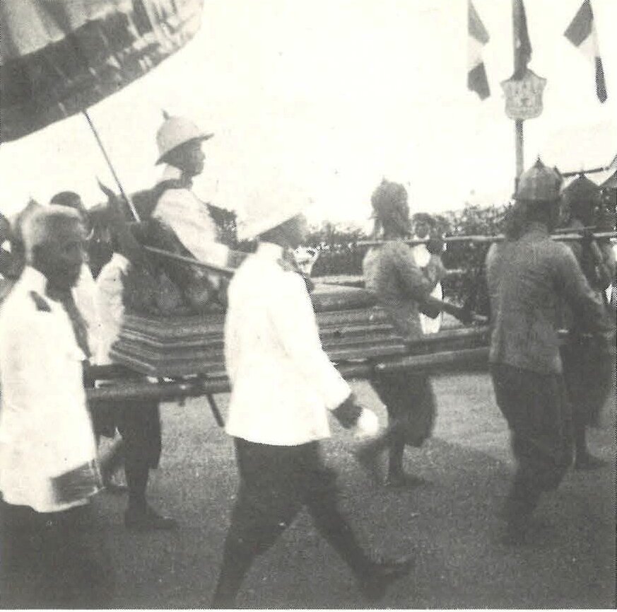 The King changes his residence from the pink-walled palace to the royal houseboat on the river. In a procession of elephants in elaborate trappings, beflowered motorcars, and decorated officials, His Majesty is carried on a golden throne on a gold-lacquered platform borne on the shoulders of many servitors. High over the King is carried the traditional golden parasol, symbol of royalty and sanctity since ancient times throughout the East. The sculptured kings of Angkor have identical parasols over their precious heads. The Achaemenidian kings of Persia, 2,500 years ago, sat under such parasols, and they took their customs from Bablyonians, Assyrians, and Egpytians whose kings were also sheltered by parasols. In the palaces of Java today, the sacred texts and the books wherein the dance and music are recorded are carried under parasols even for rehearsals.