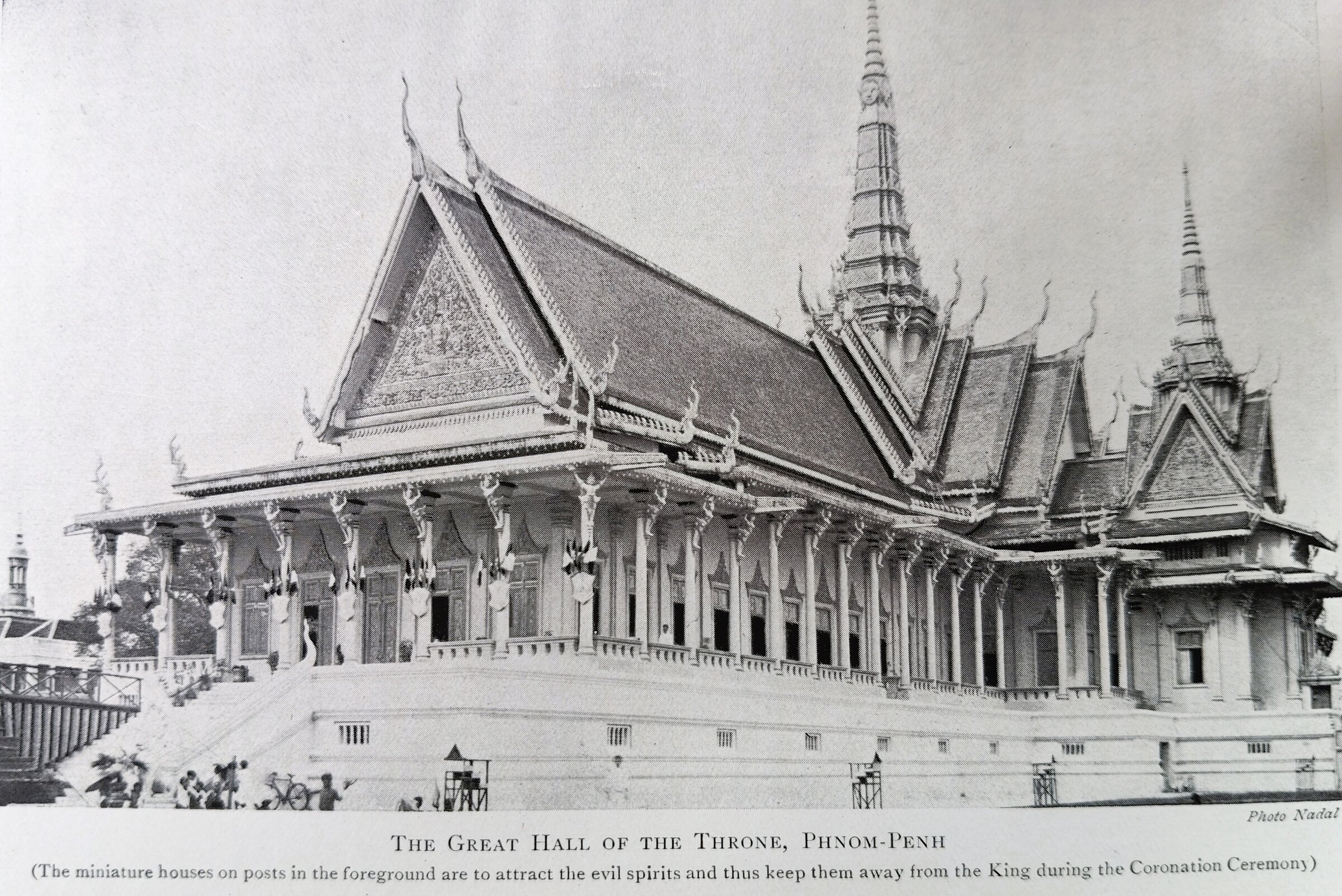 About the Palace grounds were erected gaily painted model houses, a foot or more square, perched on poles a yard or more high, in which offerings of fruit and flowers were made to the evil spirits of earth and air in which every Cambodian so firmly believes. By tempting them into these attractive little shrines the ubiquitous, naughty devils were kept away from the royal abode and its inmates. The astrologers had decided that July 23rd was the propitious day for the Coronation, and at dawn the salutes of cannon and the strains of military bands announced that the ceremonies were about to begin. The French Governor-General of Indo-China, the Resident at the Court of Cambodia and the Governor of Cochin-China, with a large suite of military and naval officers, represented the French Republic. The King’s guests were shown on arrival onto the terrace of the “Great Hall of the Throne”, where were already collected a number of Cambodian dignitaries in the most gorgeous of raiment, silks and velvets and brocades of many colours, richly woven with silver thread or em-broidered with gold.