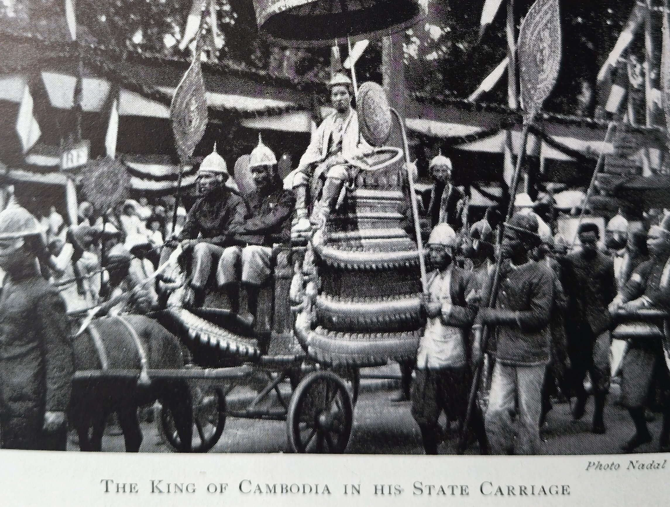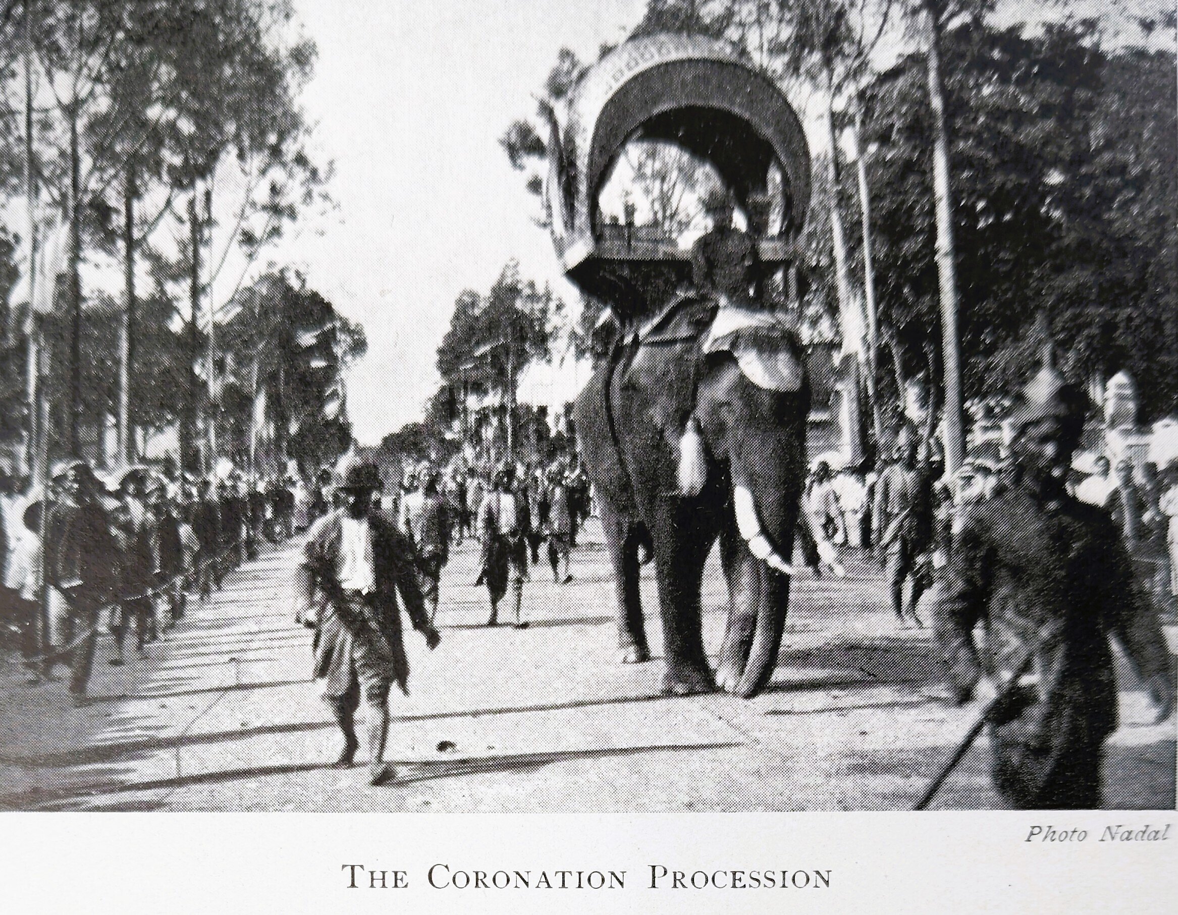 At the gateway of the Residency, with its guards of troops and sailors, the King mounted a State elephant, taking his seat in a domed howdah of much magnificence, and returned to the Palace. It was, indeed, a wonderful procession, a mixture of Oriental splendour and Oriental untidiness, with its flags and banners and religious emblems, its gorgeously attired courtiers seated cross-legged on their gilded palanquins in the shade of flat parasols of every size and colour held over them by their attendants; its antique little cannon on rough wooden carriages, pulled along at the end of long ropes; its long line of elephants amongst them the sacred white one-with gay howdahs and many-coloured trappings; its host of Palace servants, some in new silks and satins, others almost in rags, and most of them smoking; its Chinese and Indian delegations; its priests in yellow robes, and its soldiers and policemen in uniform, and its bands of music with every imaginable kind of instrument and all pro-ceeding with very little attempt at order, a leisurely throng sauntering through the streets, chatting pleasantly as they went as though unconscious of the crowd of admiring native men and women, and of the open-eyed, happy, thrilled children that lined the roadways. And from the howdah of his elephant the good-natured King smiled and waved his cigarette in answer to the people’s acclamations‑a small, dark figure wrapped in gold brocade. The greatness of the Cambodian race may have departed, but they still know how to crown a King in Phnom-Penh. [p 306 – 13].