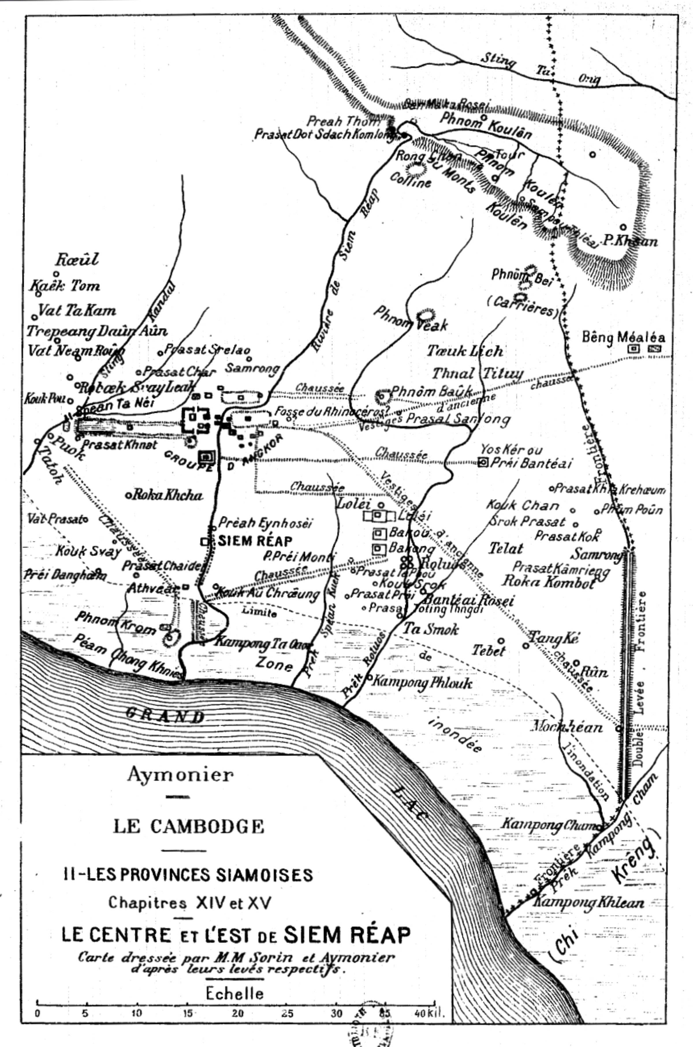 [The city of Siem Reap. — Travelers who come by the Great Lake and wish to visit the ruins of Angkor follow the meanders of the river in the jungle, and in the open plain of rice fields which extends beyond to reach the city of Siem Reap. Or, at the other season, they take an old levee, a more direct land route, which begins at the stopping point of the boats during low water, that is to say two or three kilometers from the mouth, which soon leaves the jungle to cross the open plain and end at the bottom of the city where the ground rises rapidly. In both cases they leave Phnom Krom and the monument of Athvea on the left. Siem Reap “Siamese flattened, tamed, vanquished” must take this name from a defeat suffered by the invaders at one of their first invasions of their former dominators.
