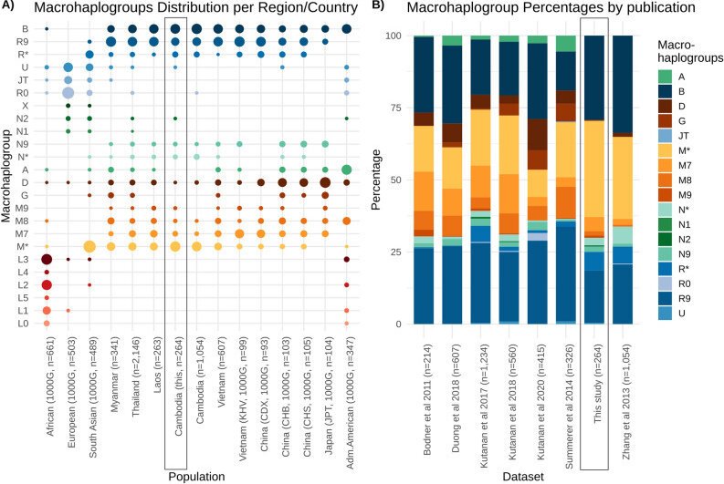 Haplogroup distribution in different populations/data sets. (A) Frequency plot of macrohaplogroups in different populations, including 1000 Genome Project data. The super populations are given for African ancestry, European ancestry, South Asian ancestry and admixed American ancestry. East Asia is reported individually as Vietnam (KHV = Kinh in Ho Chi Minh City, Vietnam), China (CDX = Chinese Dai in Xishuangbanna, CHB = Han Chinese in Beijing, CHS = Southern Han Chinese) and Japan (JPT = Japanese in Tokyo). (B) Haplogroup distribution by publication, Bodner et al. (Laos), Duong et al. (mostly Vietnam), Kutanan et al. (mostly Thailand), Summerer et al. (Myanmar), Zhang et al. (Cambodia). “This study” indicates the present work’s data set. Macrohaplogroups represent M (yellow), N (green) and R (blue) groups. [source: Anita Kloss-Brandstätter, Monika Summerer, David Horst, Basil Horst, Gertraud Streiter, Julia Raschenberger, Florian Kronenberg, Torpong Sanguansermsri, Jürgen Horst & Hansi Weissensteiner, “An in-depth analysis of the mitochondrial phylogenetic landscape of Cambodia”, Nature.com-Scientific Reports, 24 May 2021.