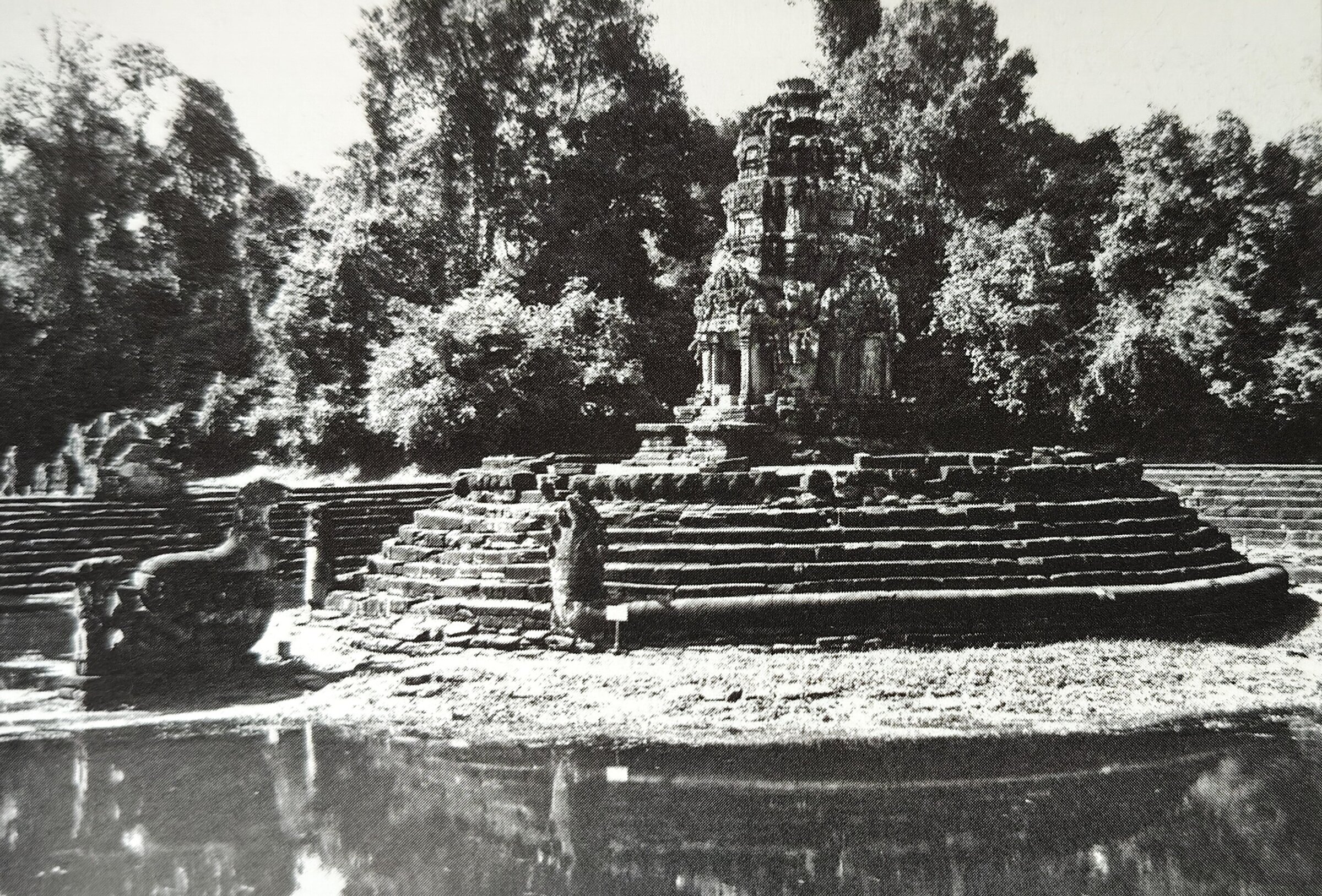 A rare photograph of Neak Pean temple with the basin depleted at the peak of dry season.