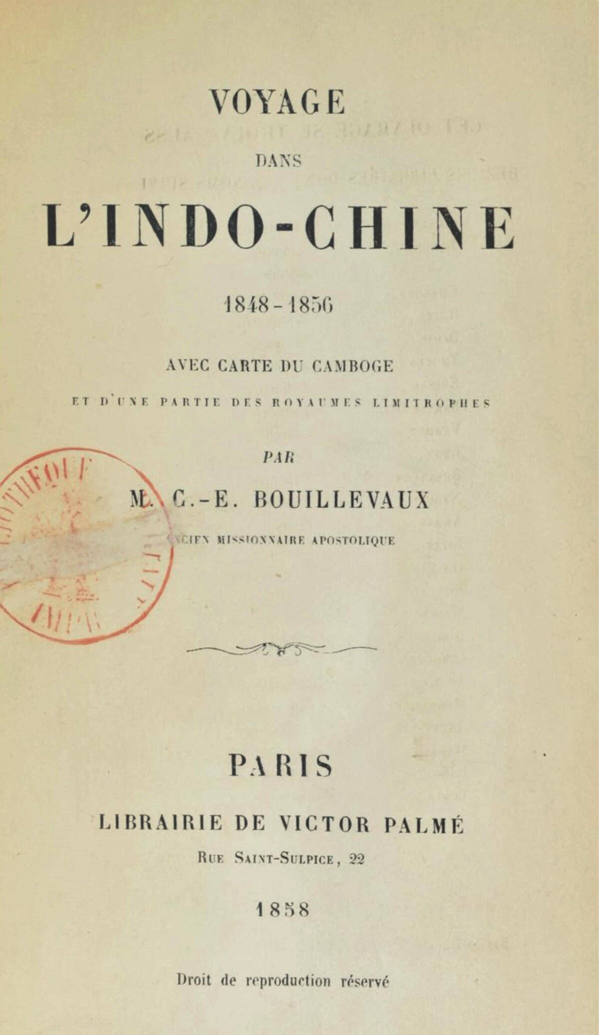 Contributing several articles to the periodical Courrier de Saigon, Bouillevaux published a Map of Cambodia, two relations of his travels in ‘Indochina’ (Voyages dans l’Indochine, 1848 – 1856 (Paris, Victor Palmé, 1858) and L’Annam et le Cambodge, Voyages et notices historiques (Paris, Victor Palmé, 1874).