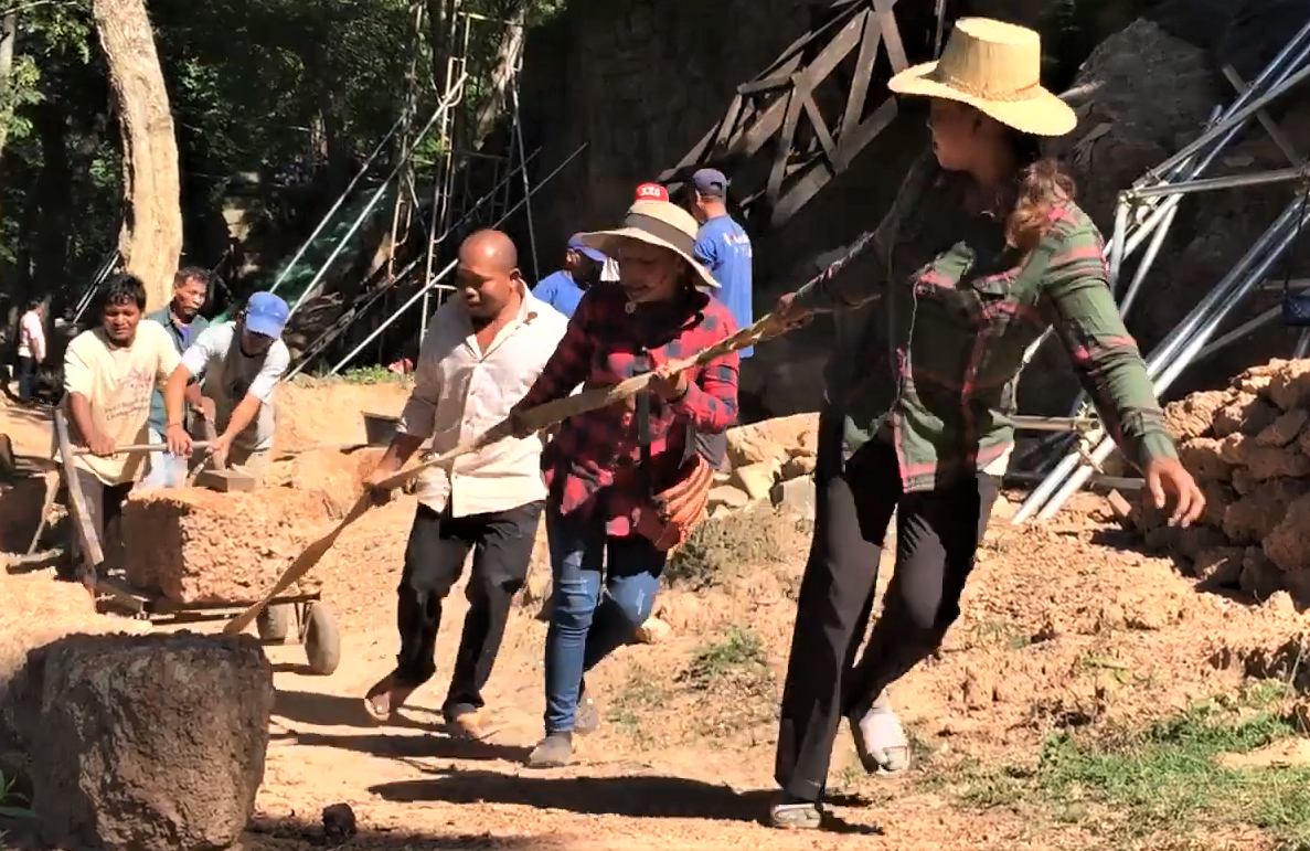 Architects Ros Visoth and Mao Sokny explain the planning and technique applied to renovating the Kam Paeng (traditional stone walling), including the use of Bay Or (បាយអ), the local mortar made of sand, clay powder, pulverized laterite and some mountain limestone powder.