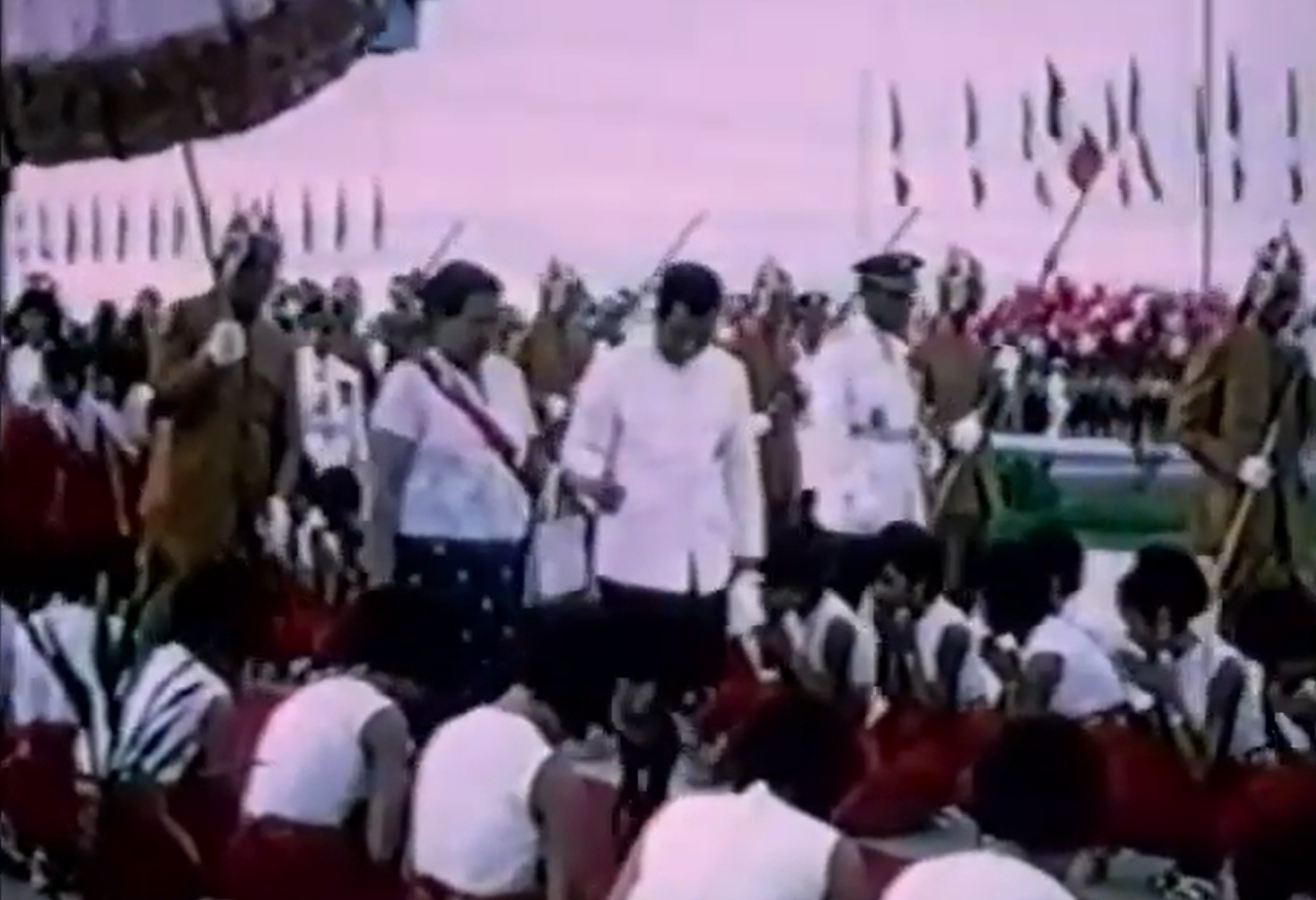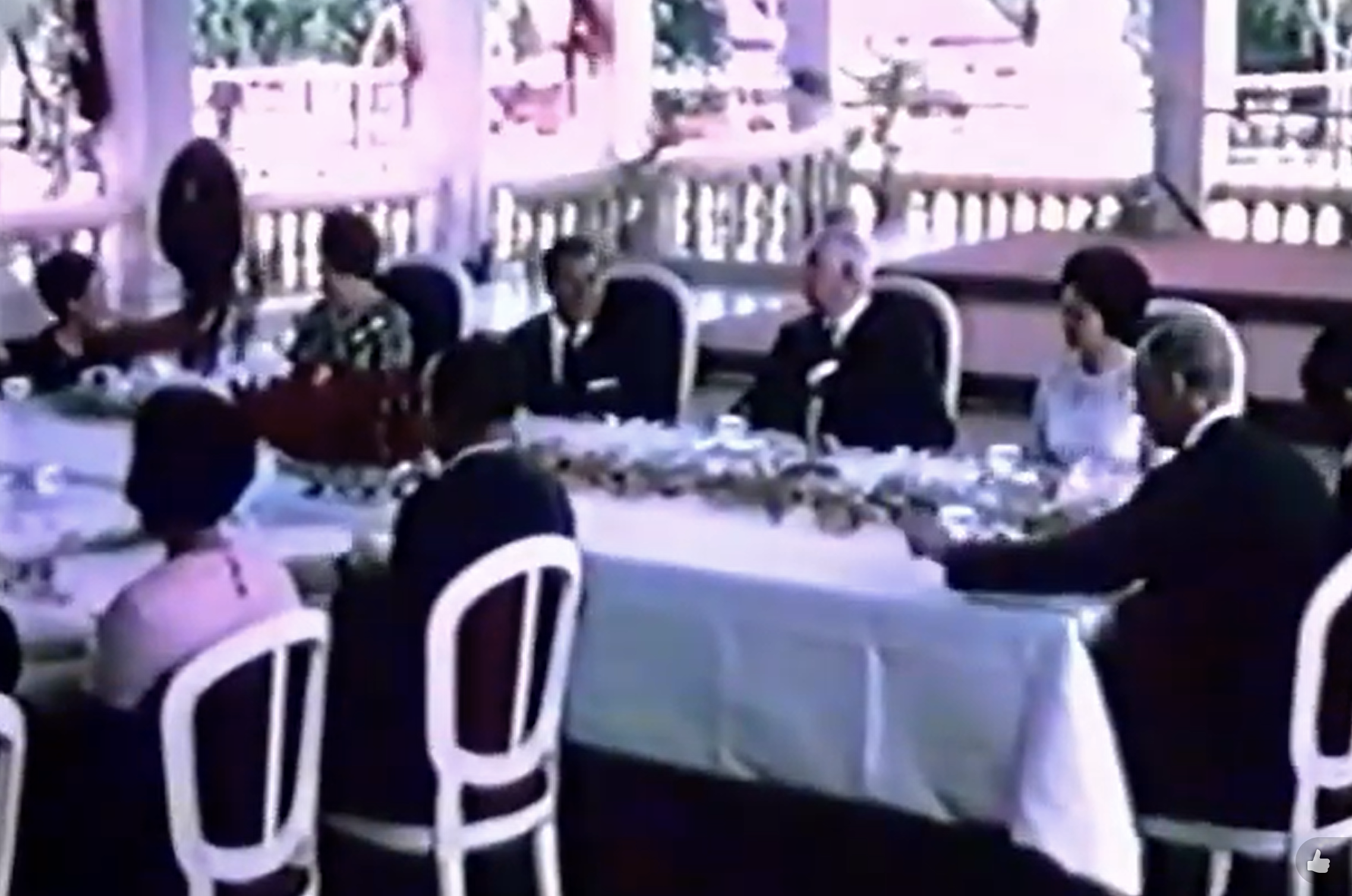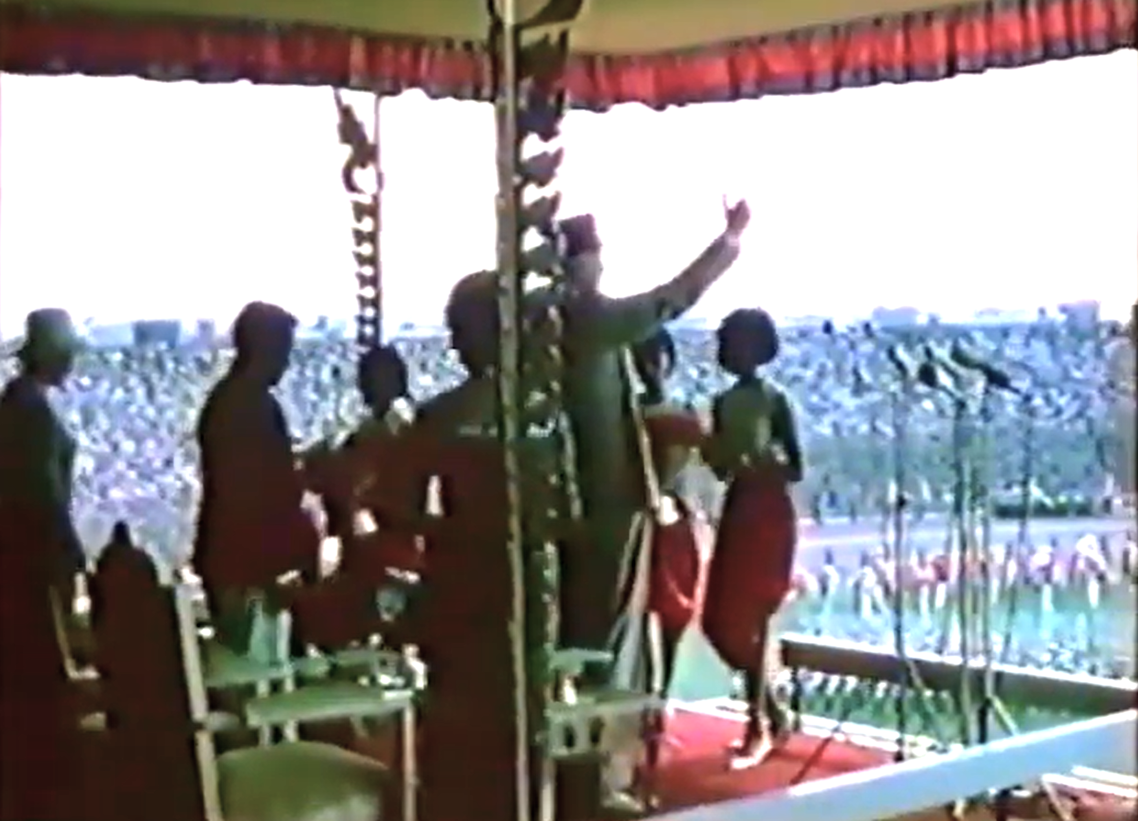 1) At the Royal Palace [Life Magazine, 16 Sept. 1966]. 2) Part of the crowd and a giant painted panel at the National Sports Complex [Life Magazine, 16 Sept. 1966]. 3) Princess Monineath on the last day of the de Gaulle’s visit [screen capture from the film]. 4) Banquet at Chanchaya Pavilion [screen capture from the film].