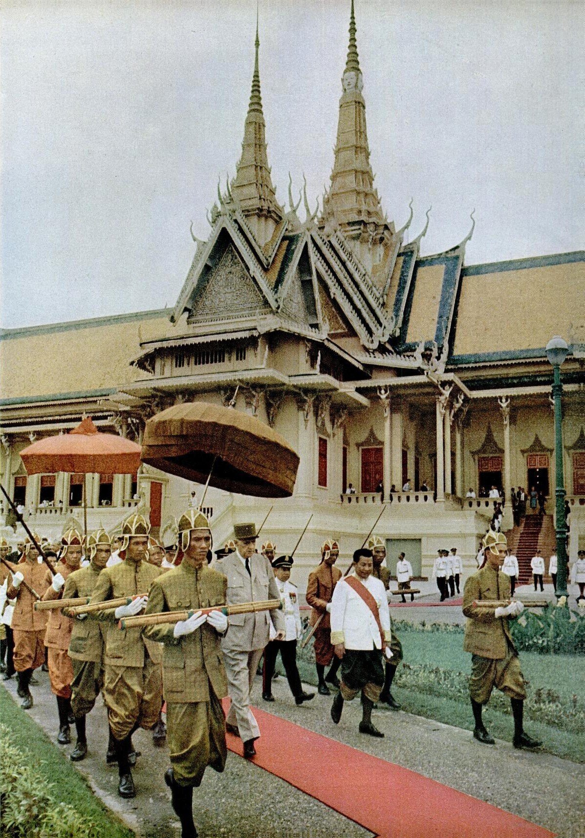Charles de Gaulle’s historic visit to Cambodia (30 August — 3 September 1966) was the occasion for Prince Norodom Sihanouk, accompanied by a radiant Princess Monineath, to show the world the prosperity and success brought by his neutralist stand in the midst of the growing military escalation and political turmoil in Southeast Asia.