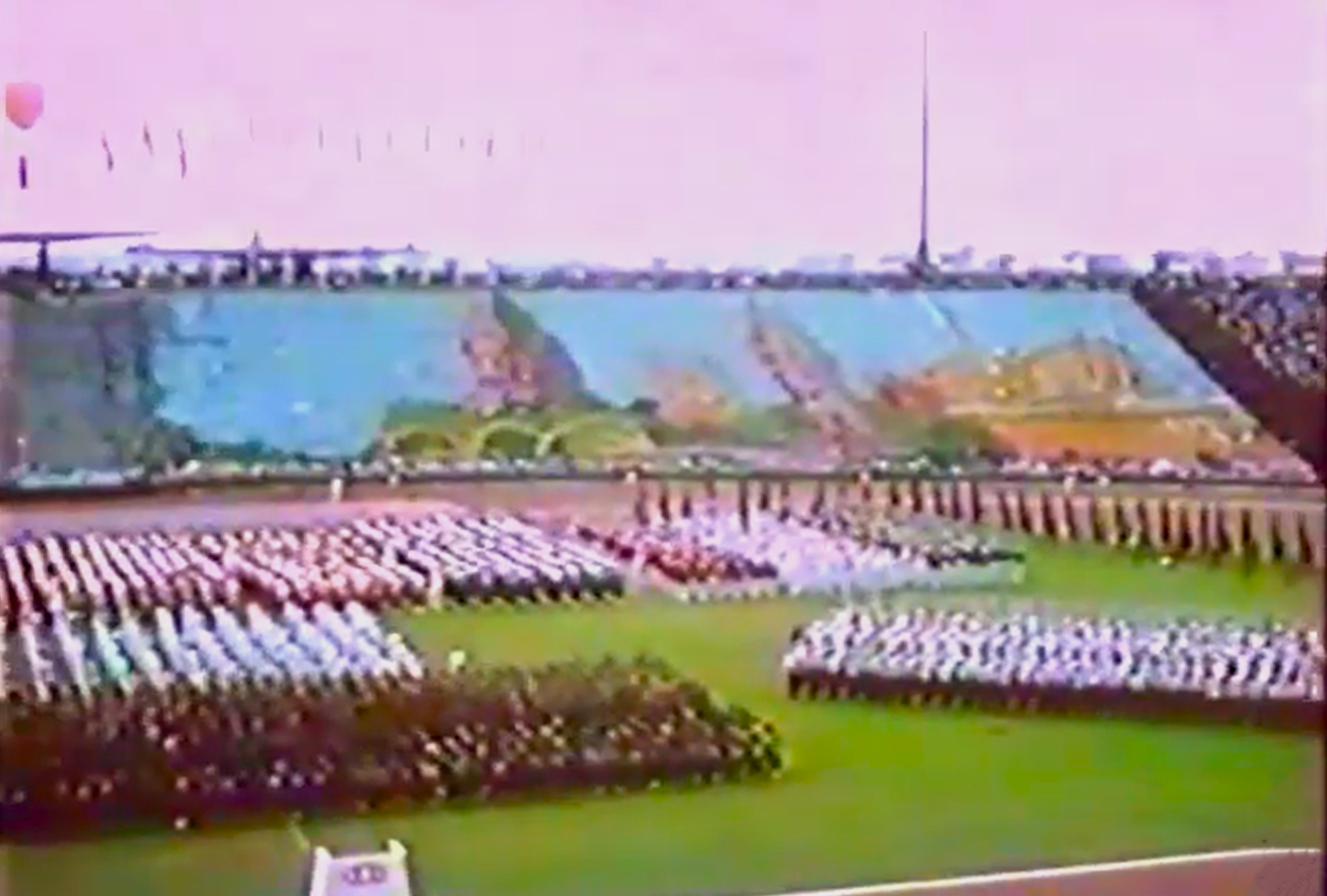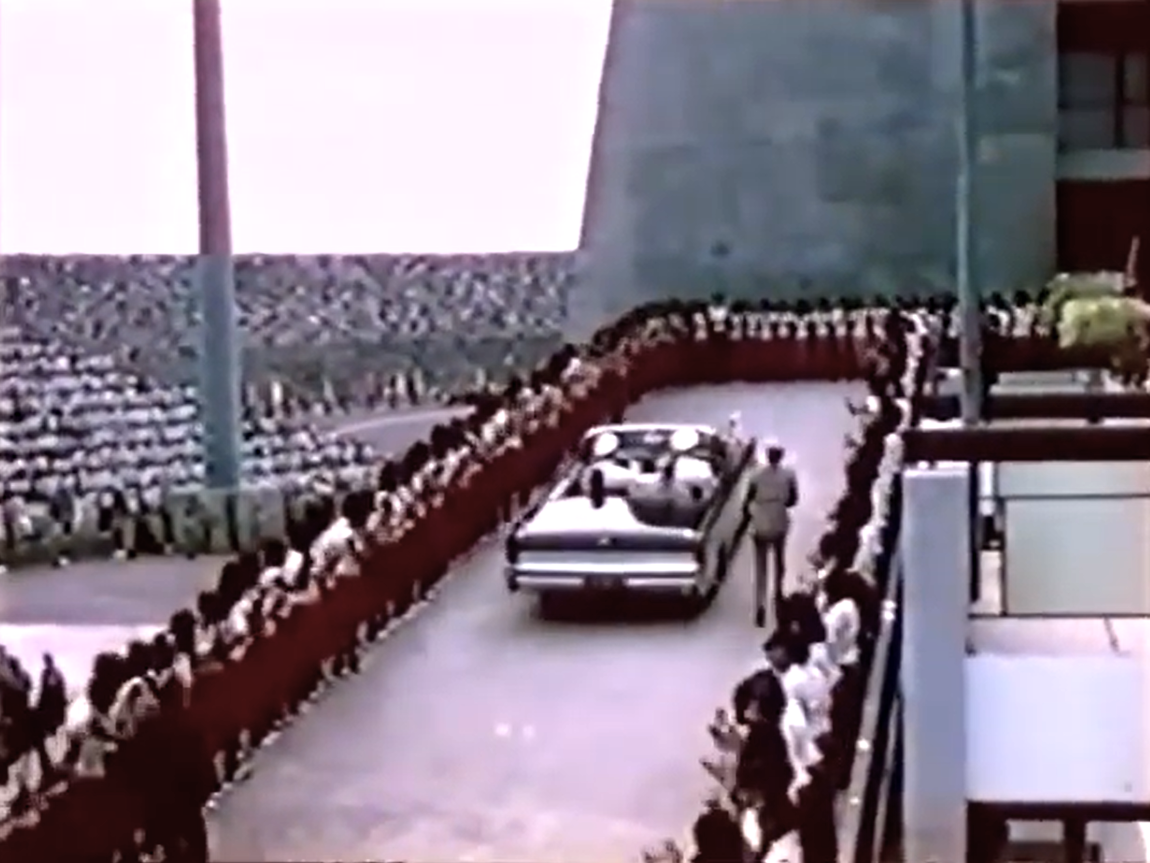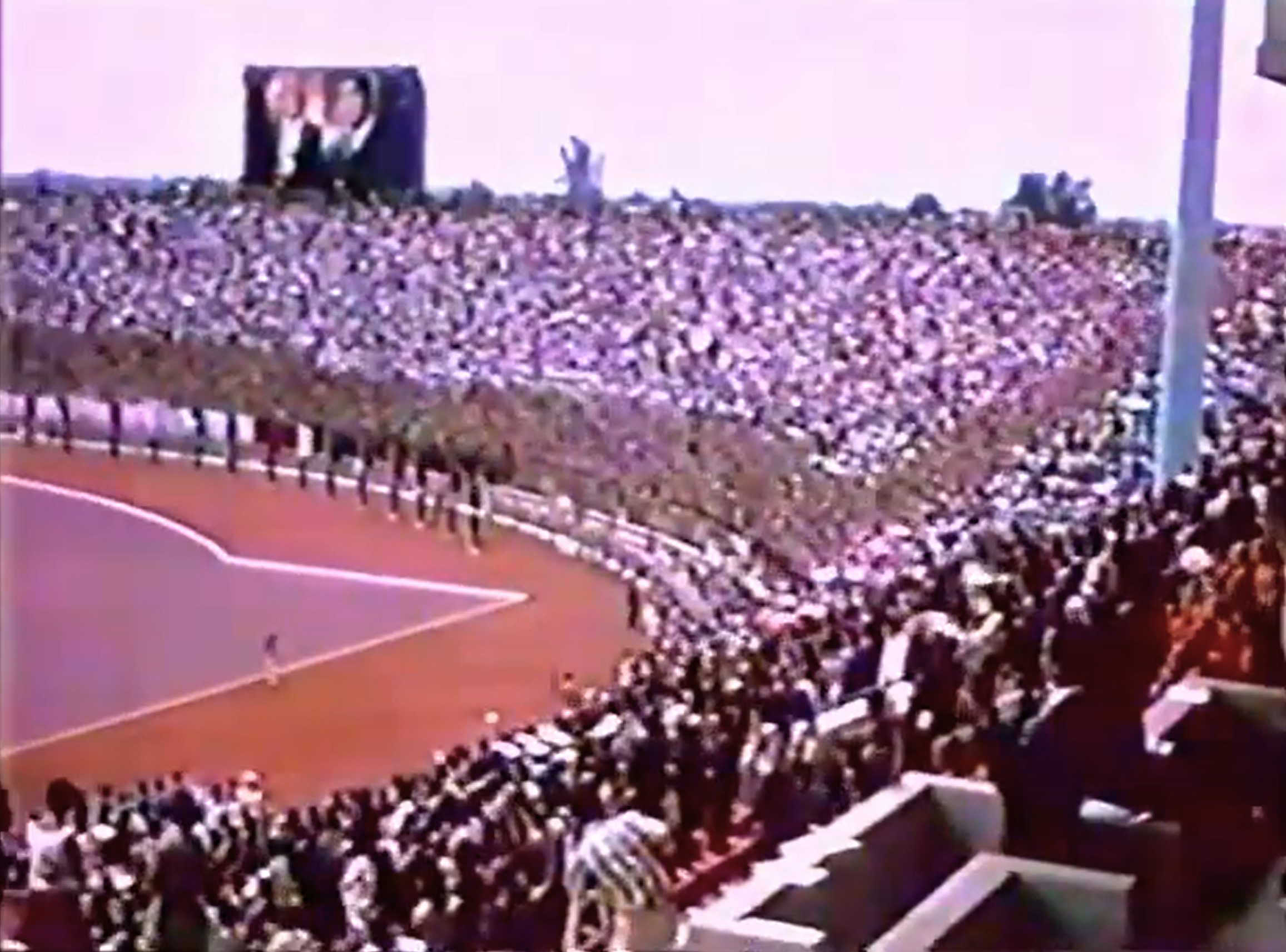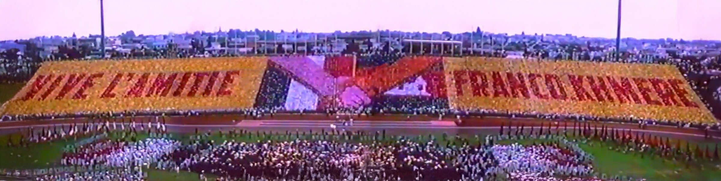 For the public event at what was later called ‘Olympic Stadium’ — the complex, also by Vann Molyvann, had been inaugurated in 1964 -, where a crowd of 100, 000 cheered the French president as ‘Pa Tua’ ប៉ា ទូអា, lit. “Godfather”, an elaborate staging was perfectly performed. A chanted prayer by 1,000 monks was followed by a young royal princess reciting a poem of friendship and peace in French alexandrines while thousands of balloons and pigeons were released in the sky. All the while, the crowd in the bleachers artfully shifted colorized placards to form slogans and images. The stunned reporter for American Life magazine wrote about “an enormous card-stunt mosaic”. This visual mass performance had been rehearsed at the stadium before, and was to be repeated, on a lesser scale, at the November-December GANEFO games.