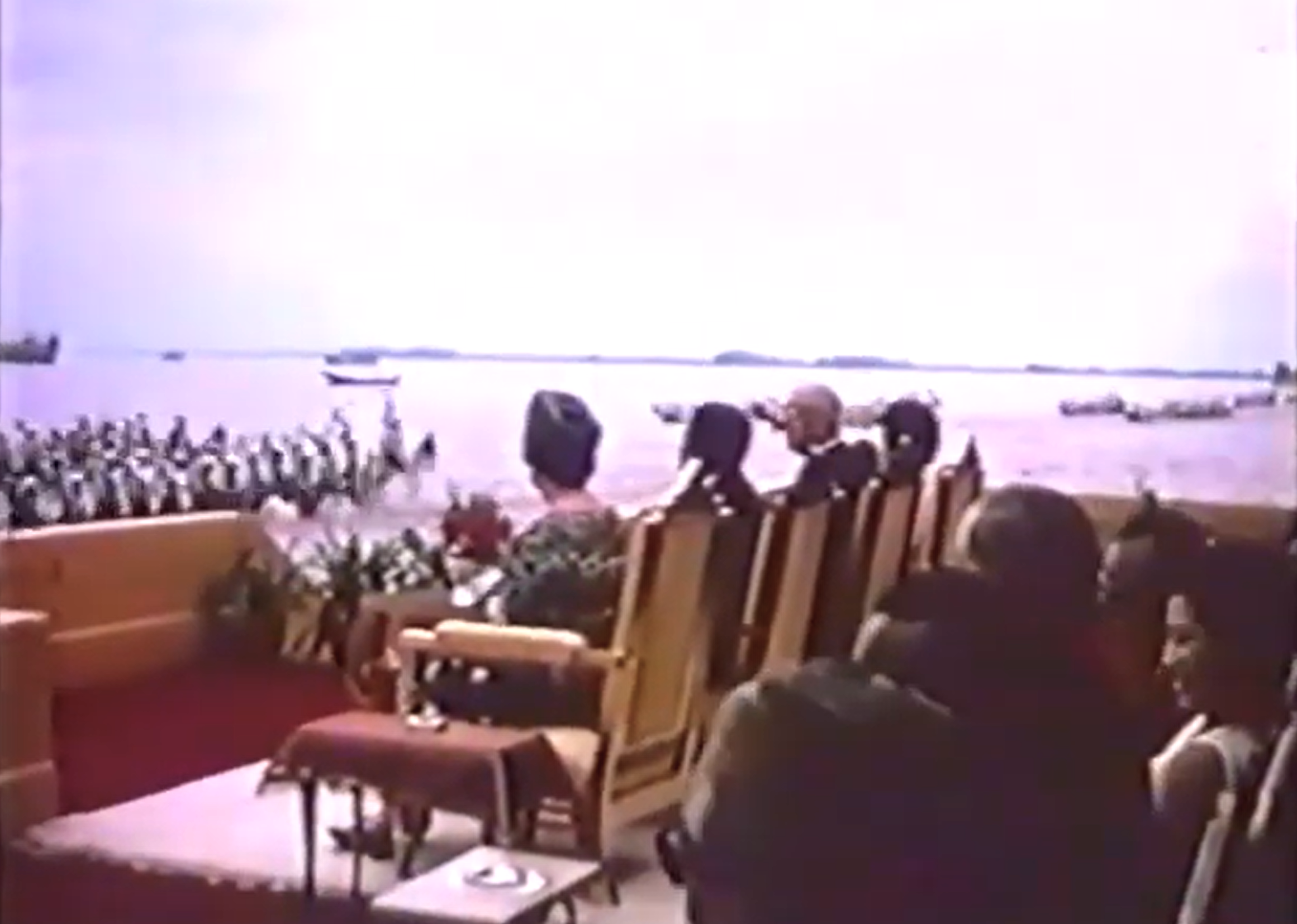 Soon after their arrival aboard France’s presidential airplane, the president and his spouse, Yvonne de Gaulle, were invited to seat at the Royal Floating Pavilion at Chaktomuk — the Four-River junction — to admire a boat race (some 100 rowing teams were competing) and floating illuminations at a scale of a typical Bön Om Touk (Water Festival) celebration, even if the actual festival would happen only two months later, in November.