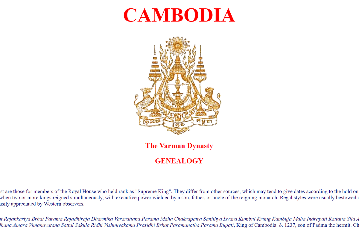 - Kambujadesa, the land of कम्बु Kambu: according to 10th-century traditions, the union between hermit Kambu Swayambhuva and the celestial nymph Mera founded the Cambodian solar royal dynasty (Kambu-Mera), beginning with Chenla ruler Srutavarman and his son Sreshthavarman.