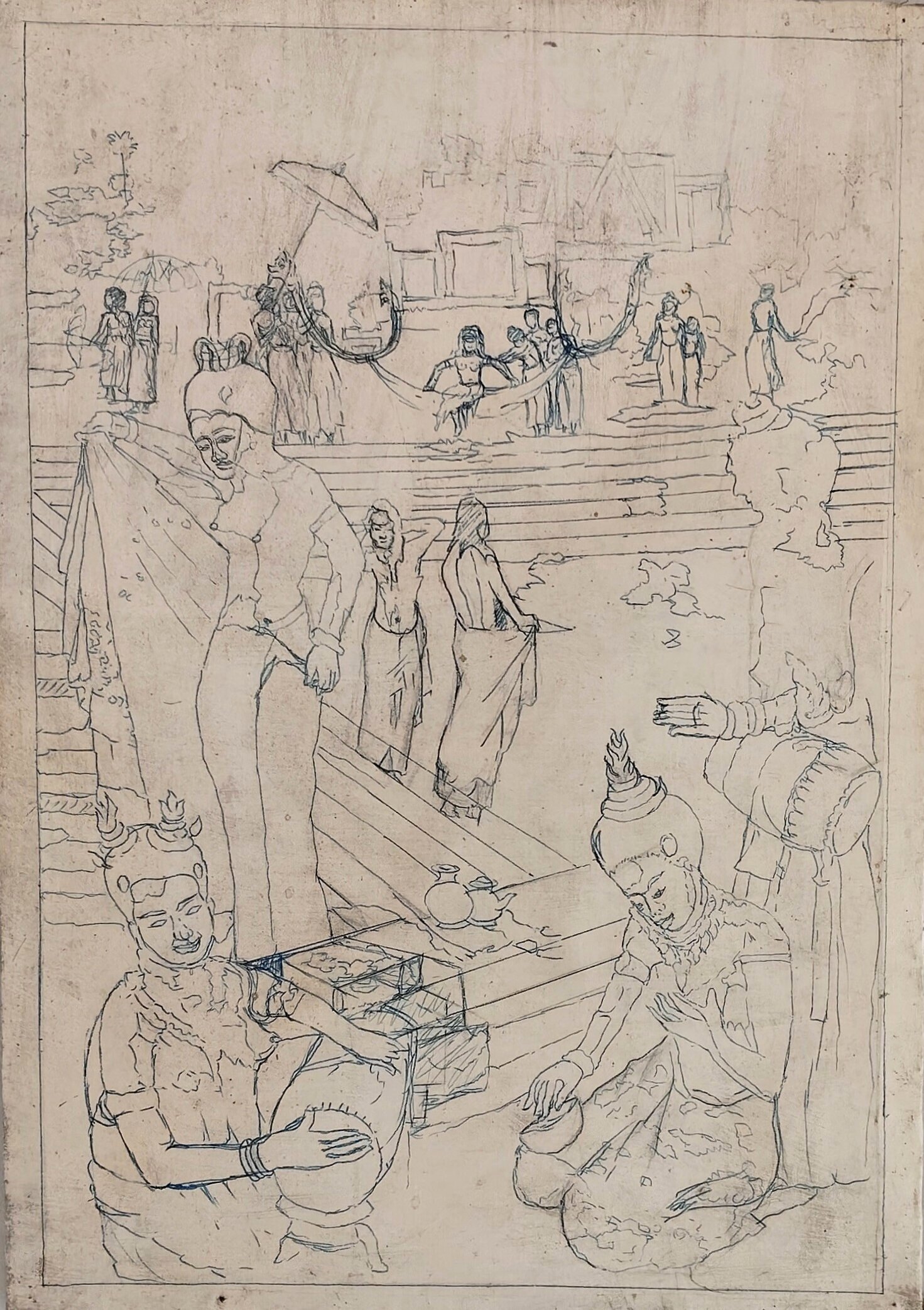 Sketch by architect and artist Dy Proeung for a painting inspired by one of Maurice Fievet’s scenes in ancient Angkor, undated. [source: Museum of Cambodian Modern Art — SAR — ស collection, Siem Reap]
