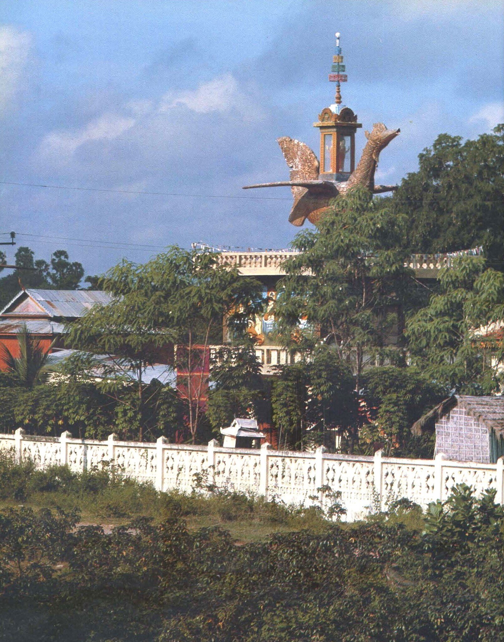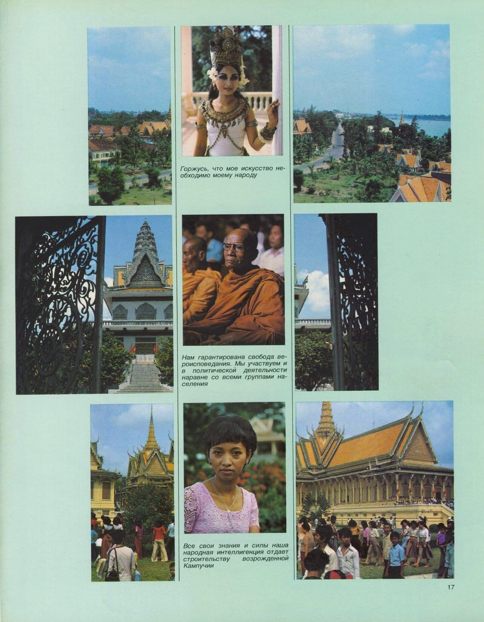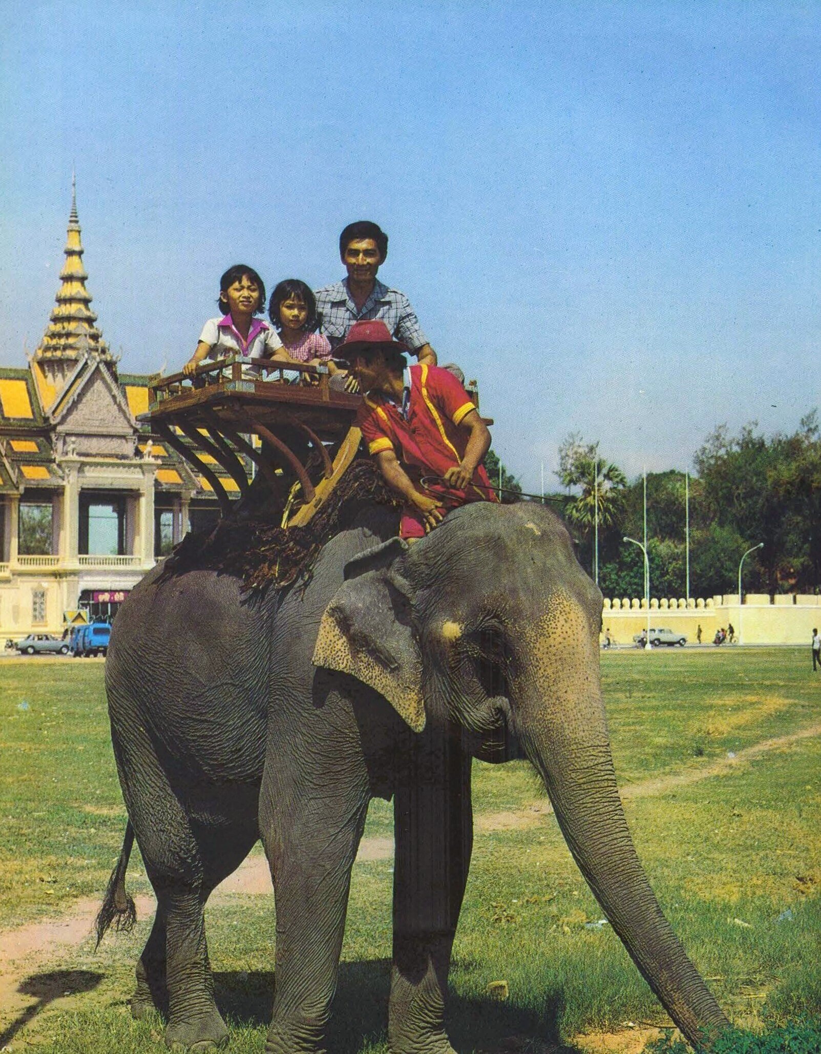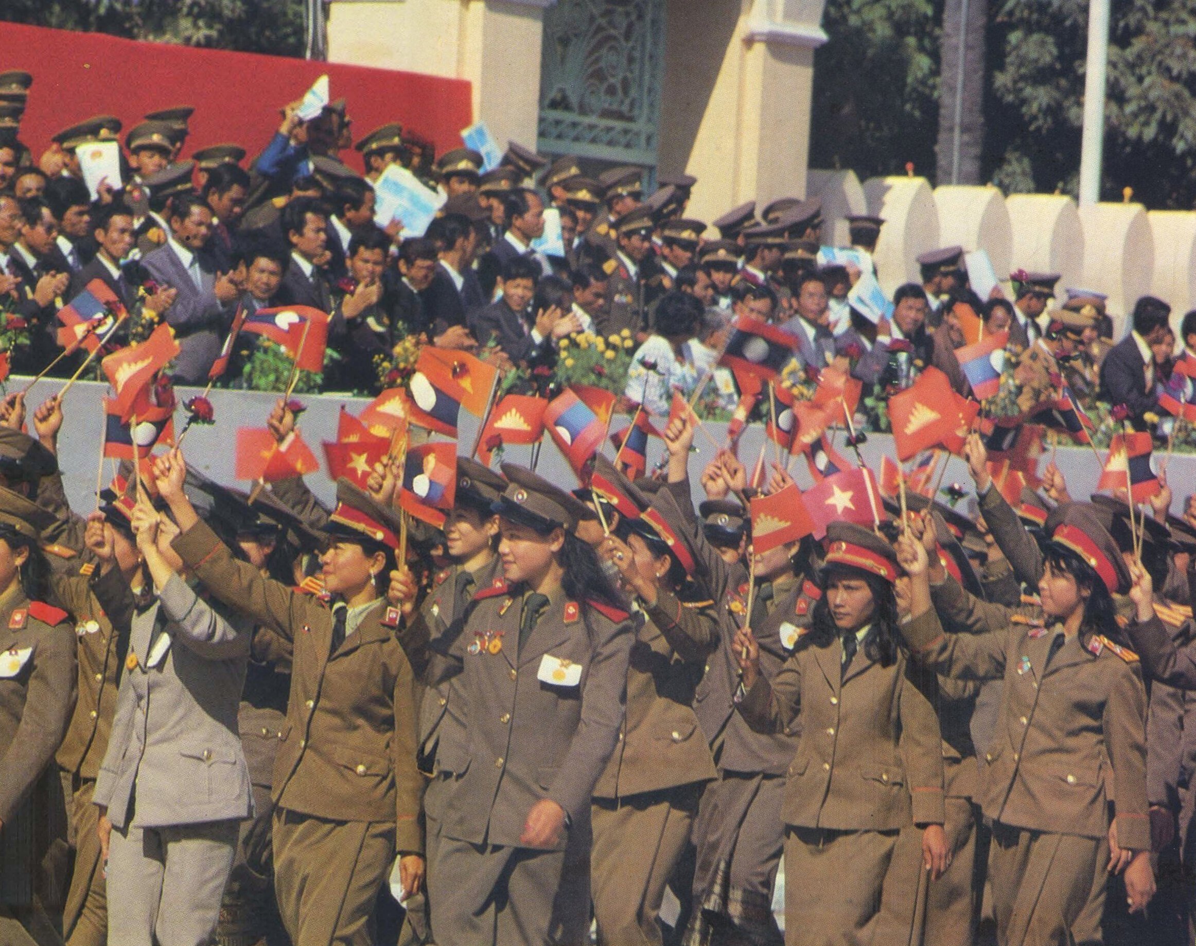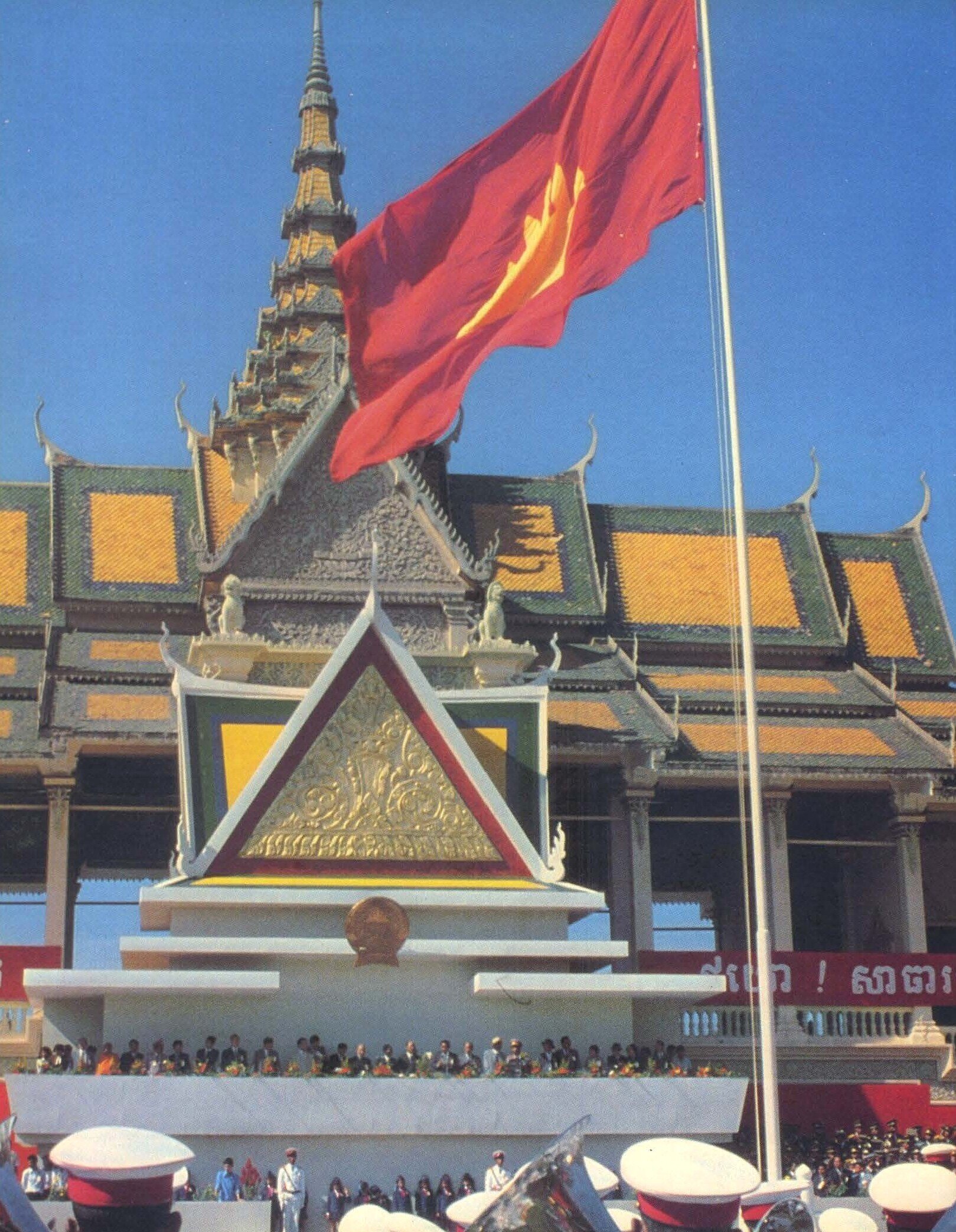 - ‘Shielding Angkor’: even as the Vietnamese troops were still in Cambodia, withdrawing in September 1989, the threat from Khmer Rouge irrendentists was still real, in particular along the border with Thailand, and the government attempted to rebuild a regular army. Hence the definitely martial tone of the 1984 parade commemorating the 5th anniversary of the People’s Republic of Kampuchea, with a tribute in pure Soviet style erected right in front of the (“former”, as it was called until the return of King Norodom Sihanouk in 1991) Royal Palace. At some point in the album, we read, “at two kilometers from the city of Aranyaprathet [a Thailand town around which were established the main Cambodian refugee camps] was established an operational headquarters called “Special Group Cambodia,” a group of the United States intelligence agency (CIA)”, seen by one of its leaders as “a continuation of our war in Vietnam.”