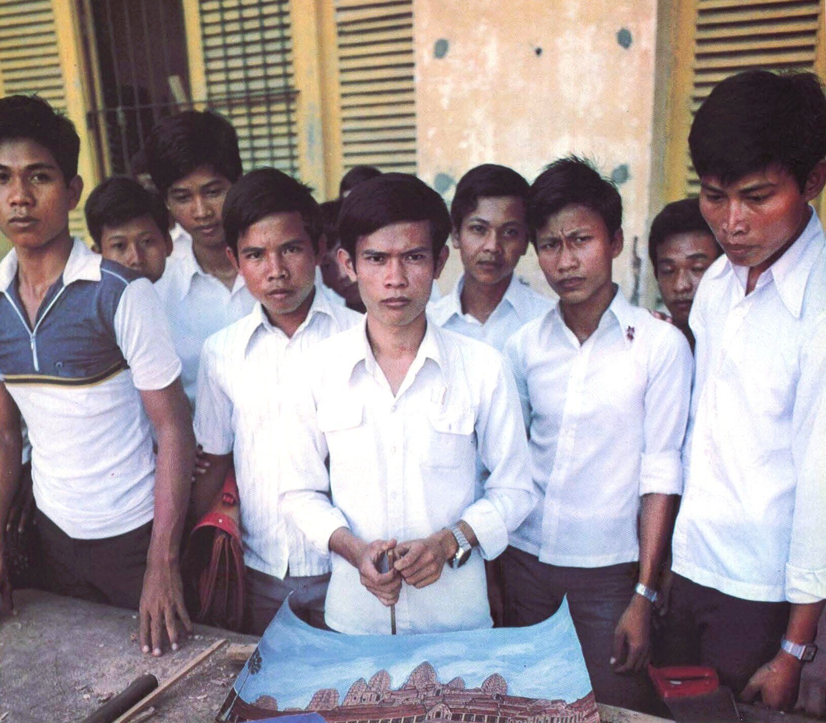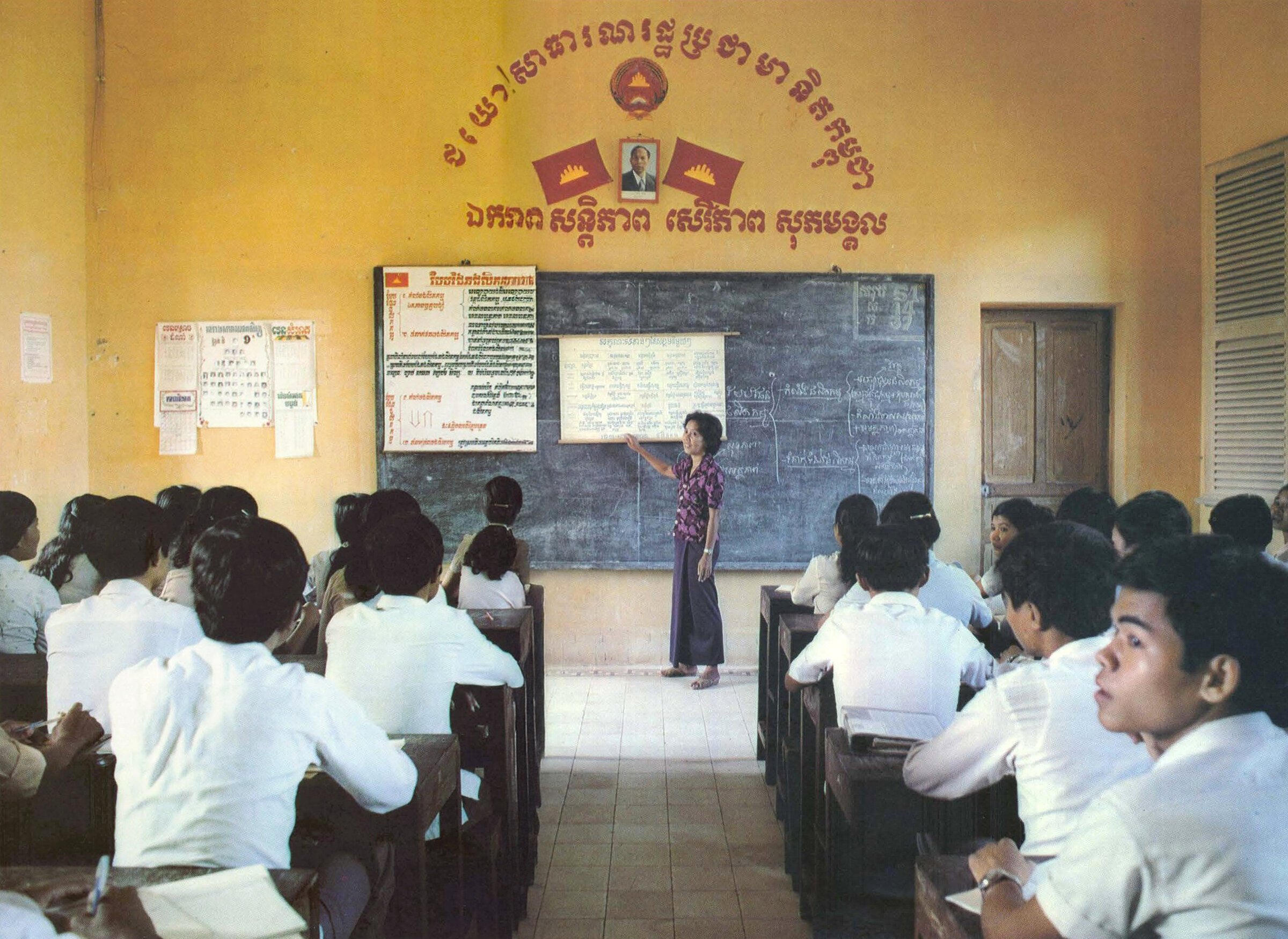 - Education: indoctrination was being replaced with general learning and acquisition of technical knowledge. To quote the caption of one photo [n 14 in our gallery], “ ‘We will not allow the return of the bloody hydra!’ say these young men, whose childhood was shattered by Pol Pot’s régime.”