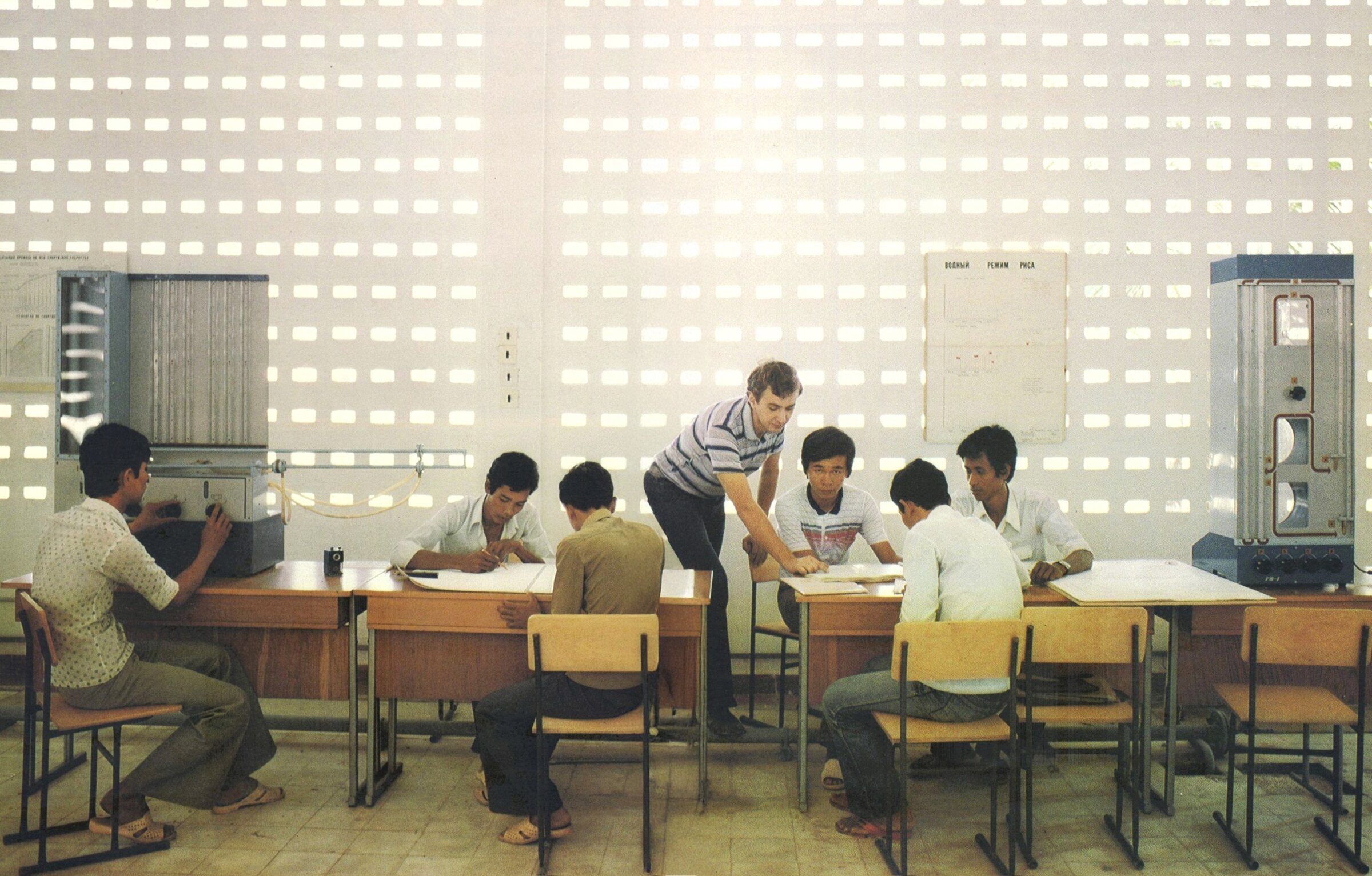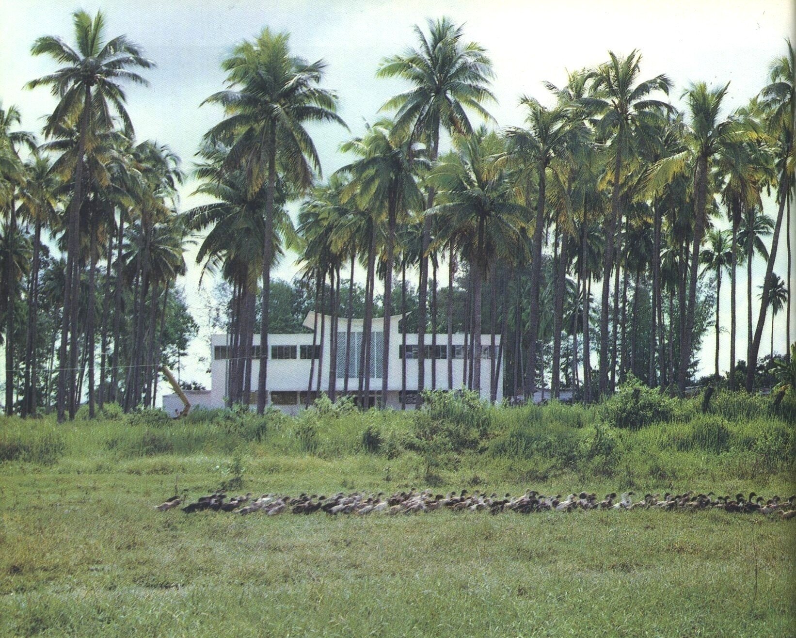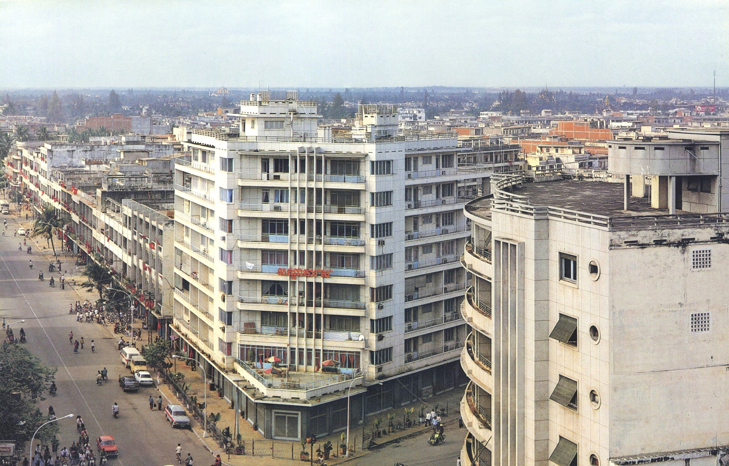 - The city: the Khmer Rouge had annihilated urban life, yet it was regaining momentum, buildings were restored. In the photos reproduced here, we can see a) Monivong Boulevard and the two corner hotels at the intersection of Charles de Gaulle Bd, Paradise Hotel សណ្ឋាគារ ប៉ារាដាយ (definitely closed after the 2020 – 2022 pandemic) and Sor Hotel សណ្ឋាគារ ស (latest renovation in 2023); b) The Institute of Higher Technology វិទ្យាស្ថានបច្ចេកទេសជាន់ខ្ពស់ មិត្តភាព កម្ពុជា សួរទៀត, completed by two Russian architects; c) The Royal University of Agriculture (RUA) សាកលវិទ្យាល័យភូមិន្ទកសិកម្ម, Khan Dangkor, Phnom Penh, presented in the book as a ‘Center for experimental poultry breeding’ (hence the ducks parading in front). This building still exists, part of a large complex of period buildings, some seemingly disused [thanks to Walter Koditek for this information].