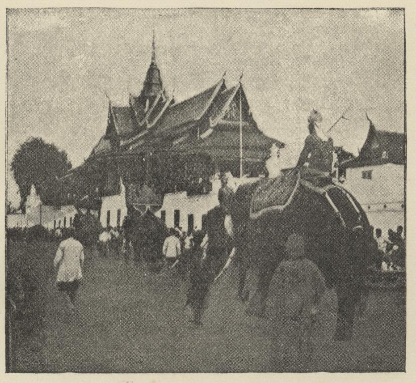 Le prince Chandalekha porté sur le yanamat d’or ; à ses côtés, coiffé du lamphac, se tient Essara Vinicchay, le Tiang-vang Sala- Utor ou président de la Cour suprême ; dans la main droite du prince est une feuille de latanier dorée sur laquelle sont inscrites quelques formules de pàli, destinées I à conjurer les démons. Le kiev-jat, en forme de petite tiare, rassemble et abrite ses cheveux, sur le sommet de la tête. Un large collier d’or à multiples rangs couvre ses épaules. Le cordon brahmanique (sang-var) est croisé sur sa poitrine ; à son intersection reluit un beau bijou formé de losanges d’or disposés en trémie et incrustés de diamants. Le prince est couvert de tout un costume tissé et plaqué de lames d’or. A ses chevilles, de lourds anneaux (kang-chueung) de même matière. Il avance, immobile comme une idole, sur son yanamat orné de Garudas, à travers la foule étendards et des parasols, au-dessus des torses nus de ses porteurs vêtus sur les reins d’une légère ceinture blanche. Un peu plus tard les derniers rayons du soleil à son déclin noieront dans une brume de pourpre et de cuivre toute cette vision réalisée de la vieille Asie. [Prince Chandalekha is carried on the golden yanamat; at his side, wearing the lamphak, stands Essara Vinicchay, the Tiang-vang Sala-Utor or President of the Supreme Court; in the prince’s right hand is a golden latanier leaf on which are inscribed some Pali formulas, intended to ward off demons. The kyiv-jat, in the form of a small tiara, gathers and shelters his hair on the crown of his head. A wide gold necklace with multiple rows covers his shoulders. The Brahmanic cord (sang-var) is crossed over his chest; at its intersection gleams a beautiful jewel formed of gold lozenges arranged in a hopper and encrusted with diamonds. The prince is covered with a whole costume woven and plated with gold plates. At his ankles are heavy rings (kang-chueung) of the same material. He advances, motionless as an idol, on his yanamat adorned with Garudas, through the crowd of standards and parasols, above the bare torsos of his bearers dressed around their waists in a light white belt. A little later the last rays of the setting sun will drown in a mist of purple and copper this completely realized vision of old Asia.]