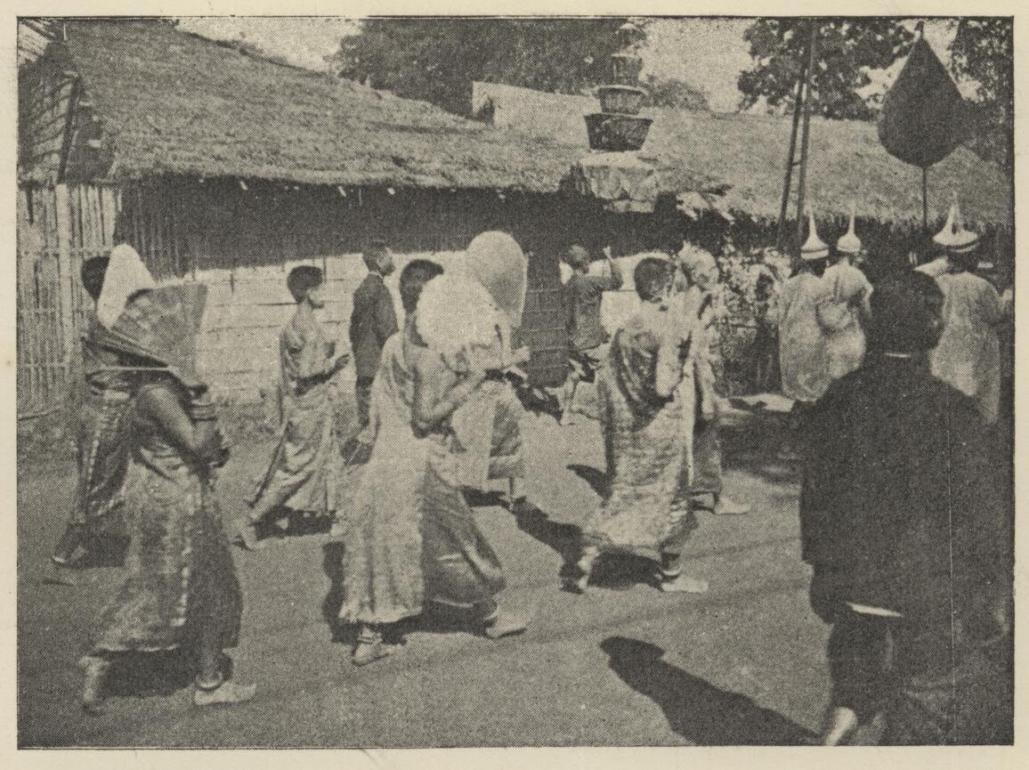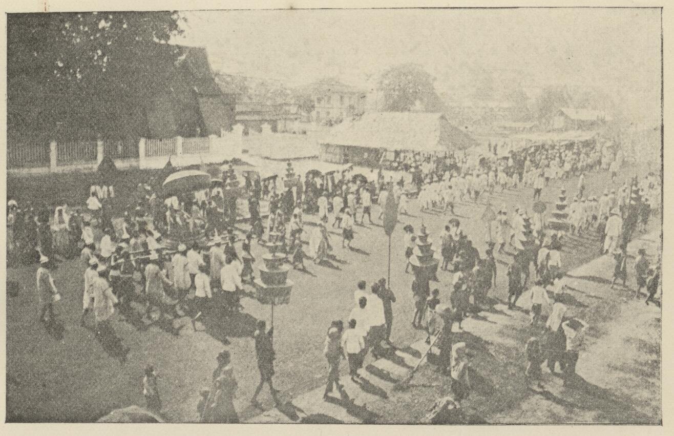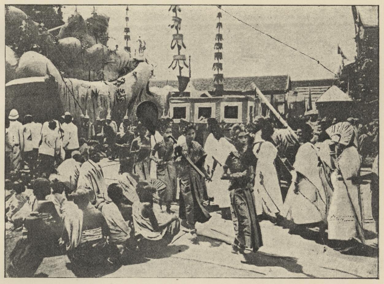 Ensemble du défilé précédant le yanamat ; il est encadré par de nombreux parasols de cinq étages (aphirom), spéciaux à la famille royale ; le violet, le vert clair et l’or dominent l’ornementation de ces parasols. La grande case de l’éléphant blanc s’aperçoit sur la gauche, abritée en partie par un gros manguier. [The entire parade preceding the yanamat, surrounded by numerous five-tier parasols (aphirom), special to the royal family; purple, light green and gold dominate the ornamentation of these parasols. The large hut of the white elephant can be seen on the left, partly shaded by a large mango tree.]