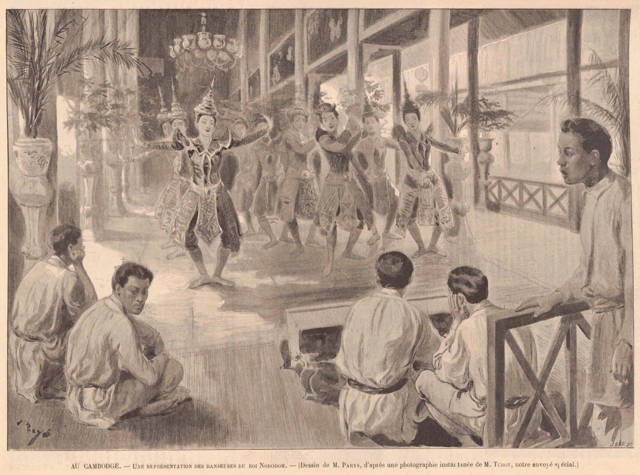 “Those velvety, bold and intelligent eyes…” In this rehearsal at the Royal Palace photographed by Henri Turot in 1899, could the preeminent dancer be Nou Nam? [source: drawing by M. Parys after Turot’s phototgraphy, Le Monde illustré, 22 April 1899, via gallica.bnf.fr]