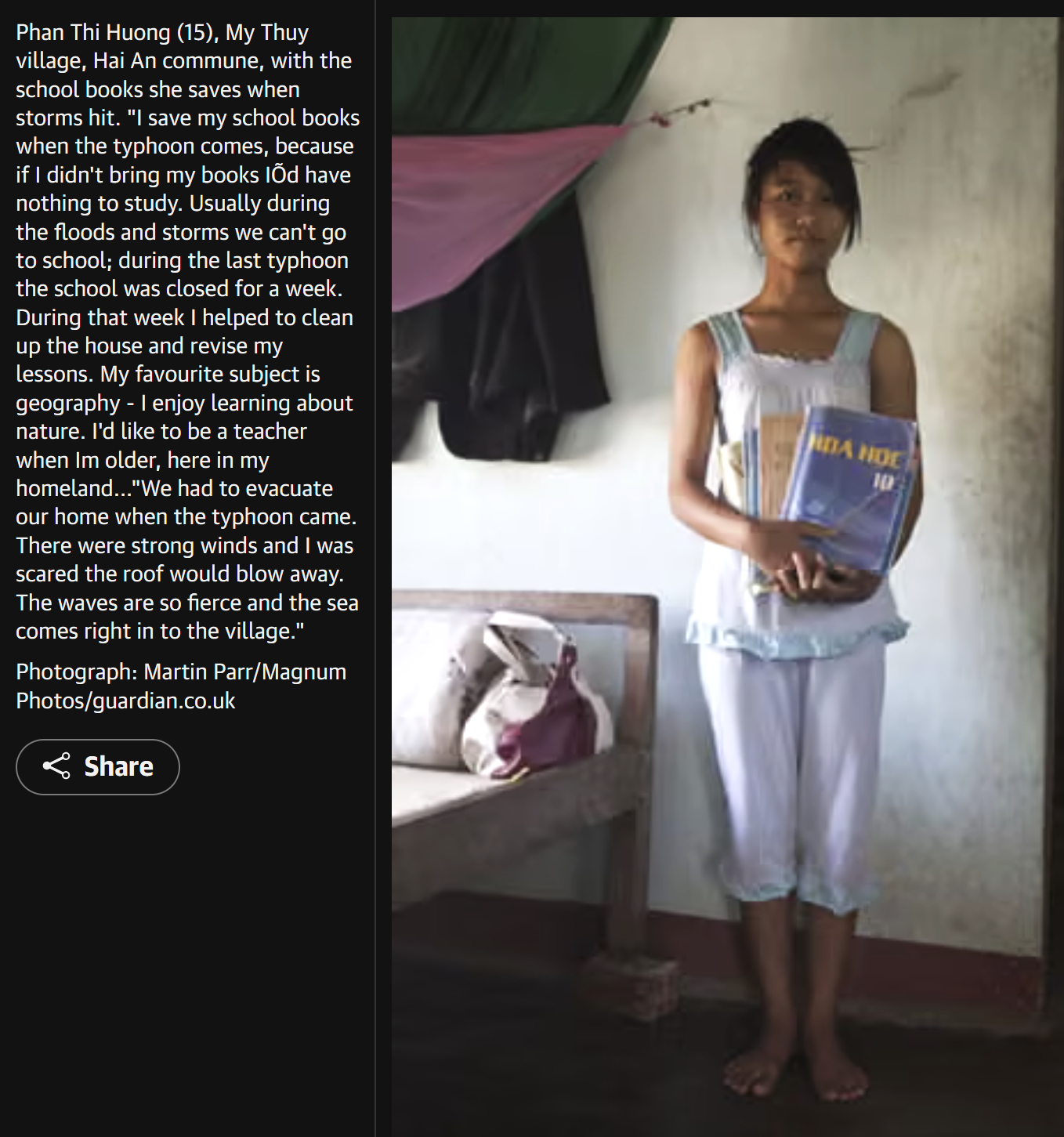 Three years before Angkor, in 2009, Martin Parr had been invited by the global organization Oxfam to go to the province of Quang Tri and photograph the local families confronted to the ever more drastic consequences of floods and typhoons due to climate change. “Many people are getting into serious debt as they borrow huge sums of money to replace crops, repair houses and send their children to school,” noted the editorial comment to the series published in The Guardian, 8 Dec. 2009. It was an eye opener, and one decade later, in 2021, he would remark — “I can see now how nearly all the images I have recently taken are related to climate change.”