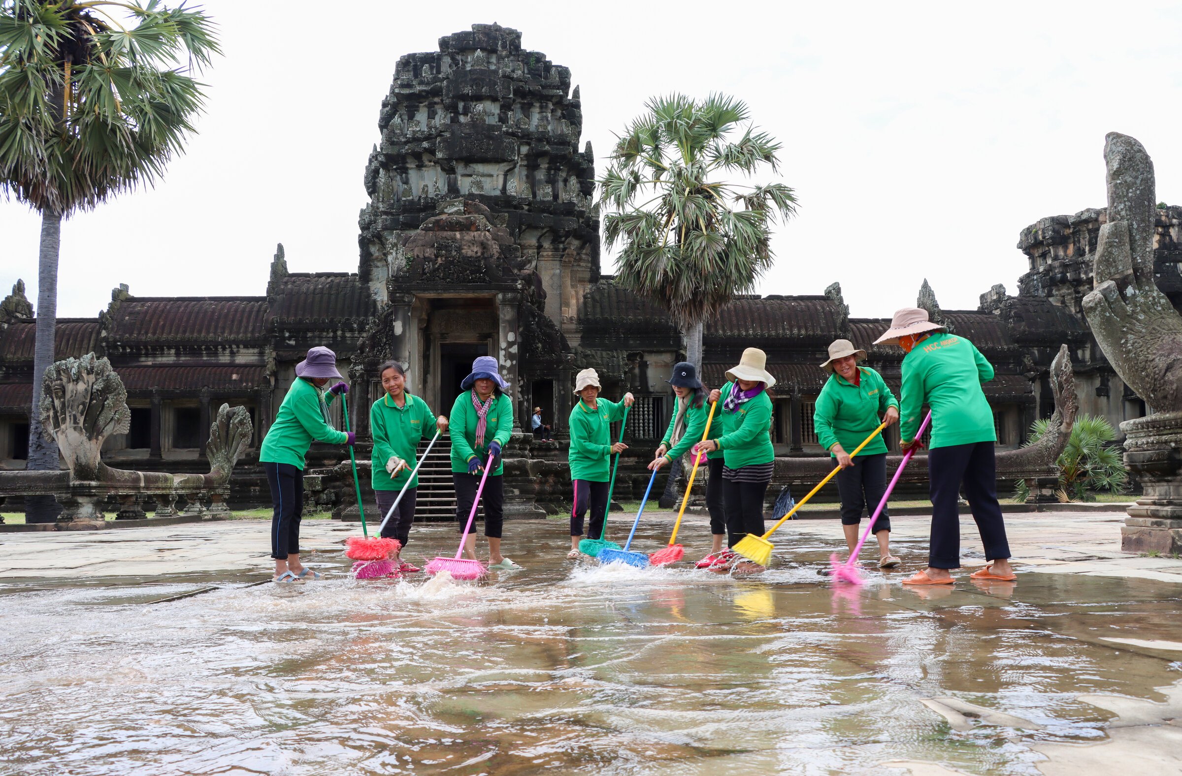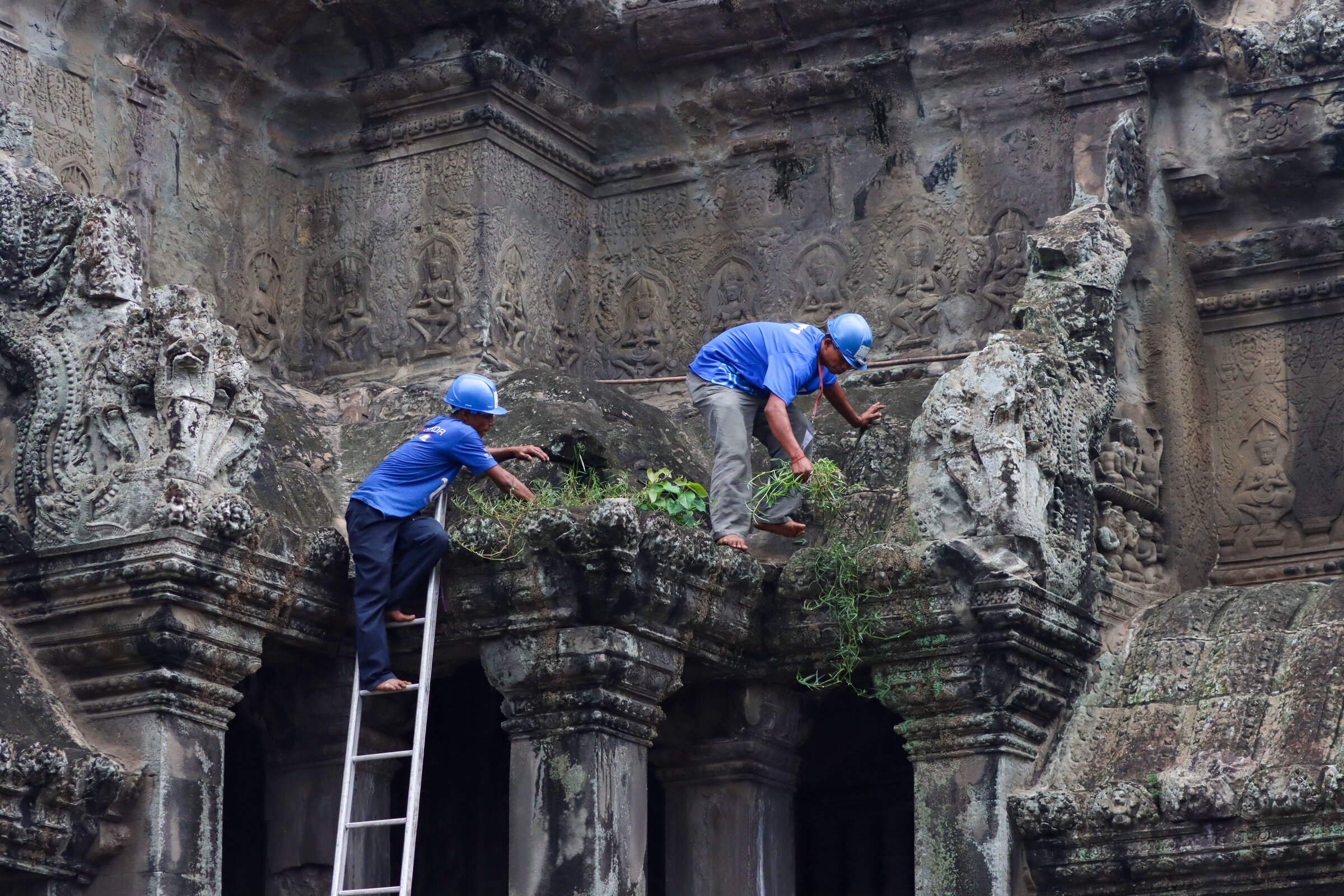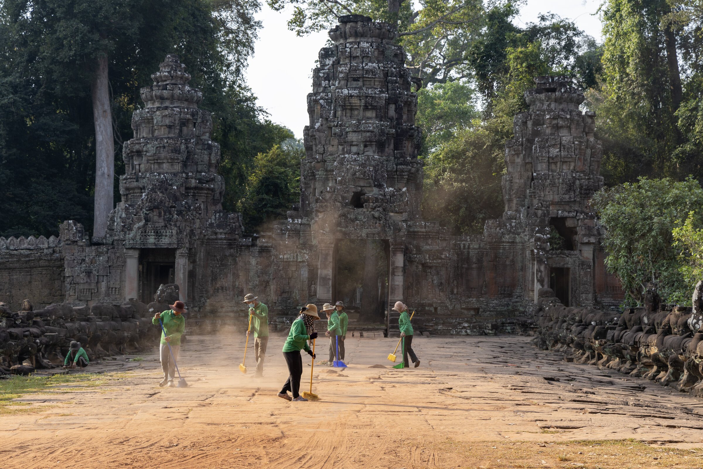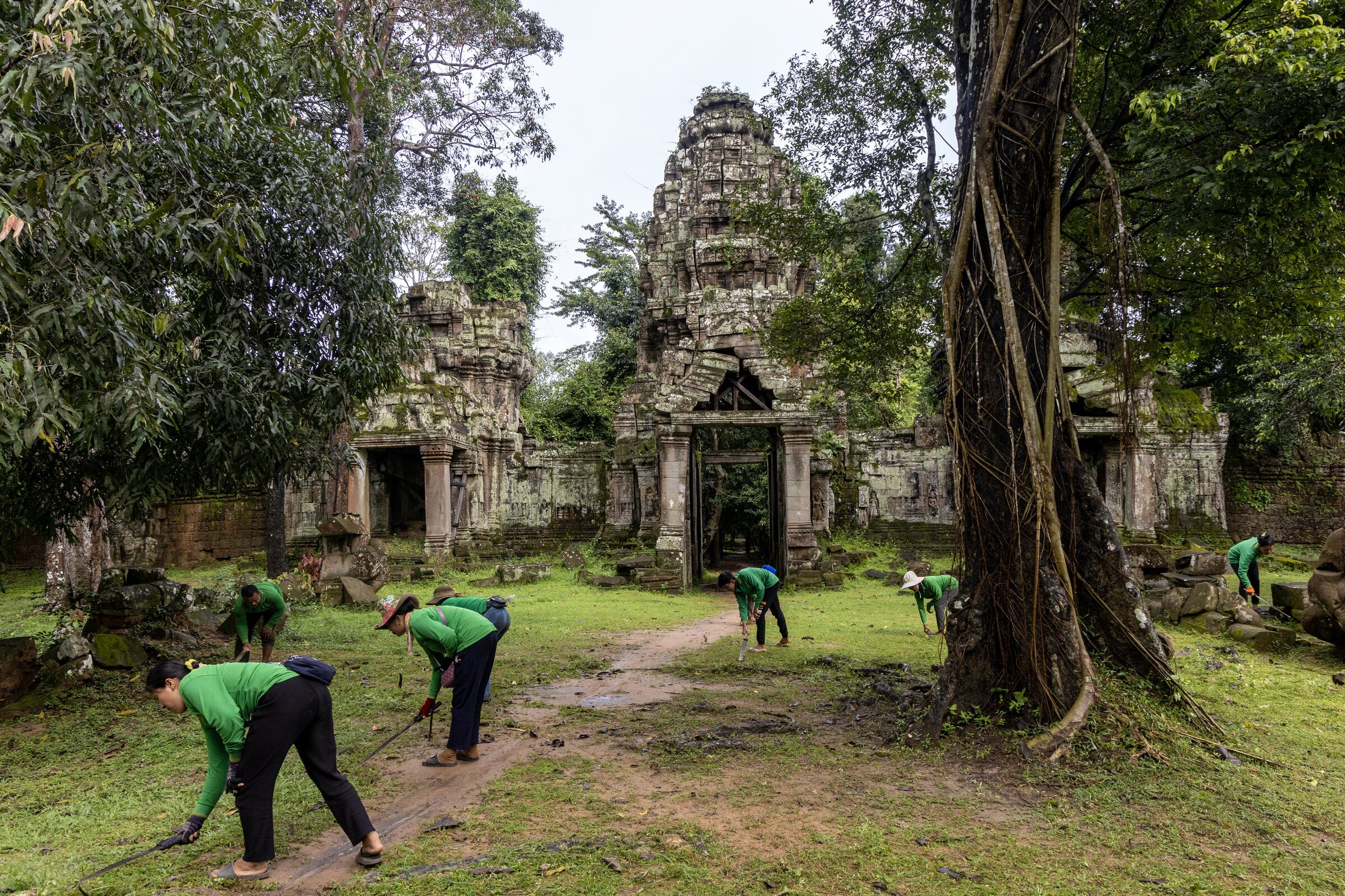 Nowadays, APSARA National Authority works again with cleaning companies to ensure the cleaning and maintenance of the area. HCC, a private cleaning company whose uniforms can be seen on these photography, has been replaced by VGreen, part of the Cambodian company Sonavith, employing in 2025 some 551 workers, 80 pc of them women. APSARA technical services are in charge of the clearing of the monuments proper, and coordinate with the Forest Research Institute of India (FRI) for the conservation and maintenance of large trees.