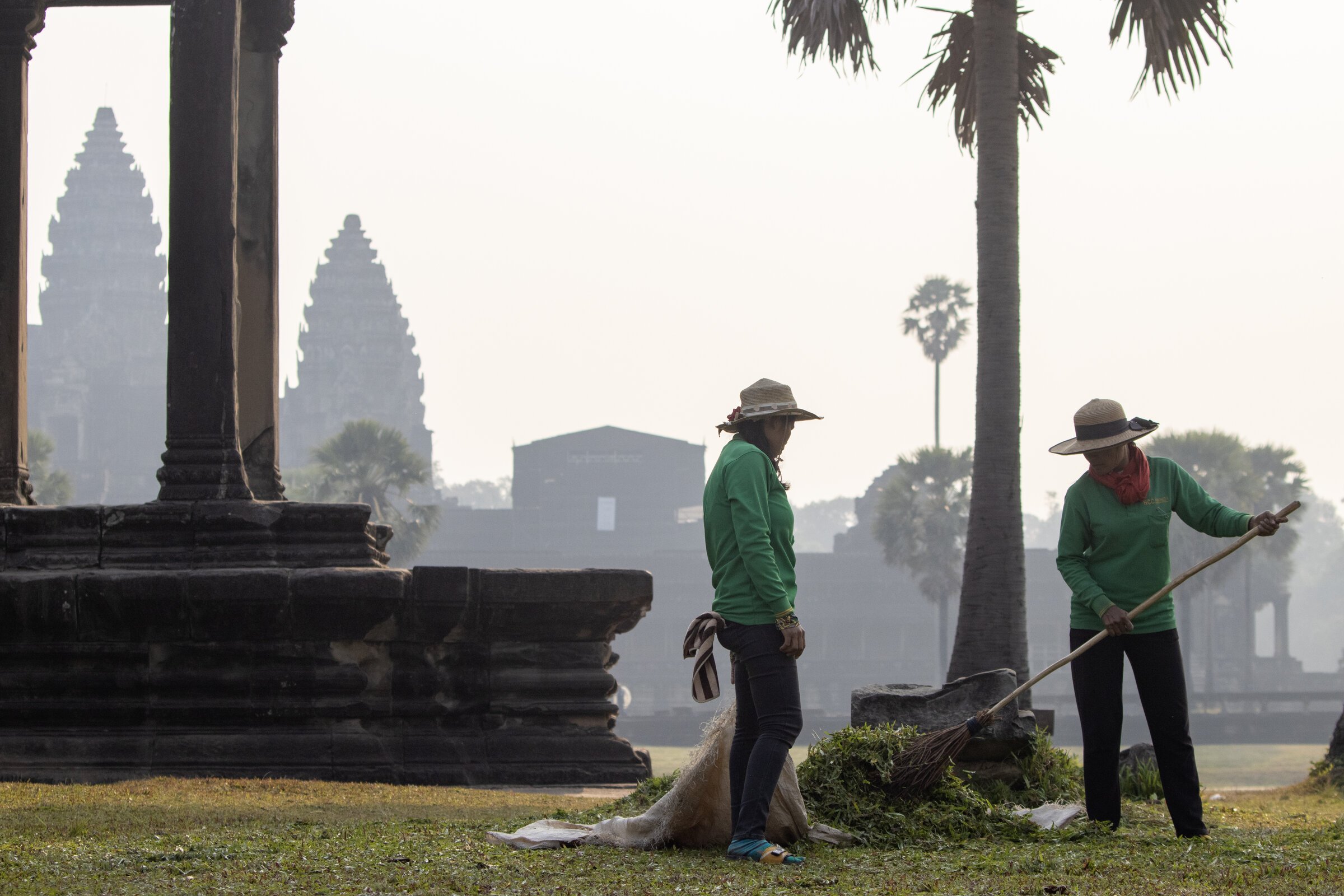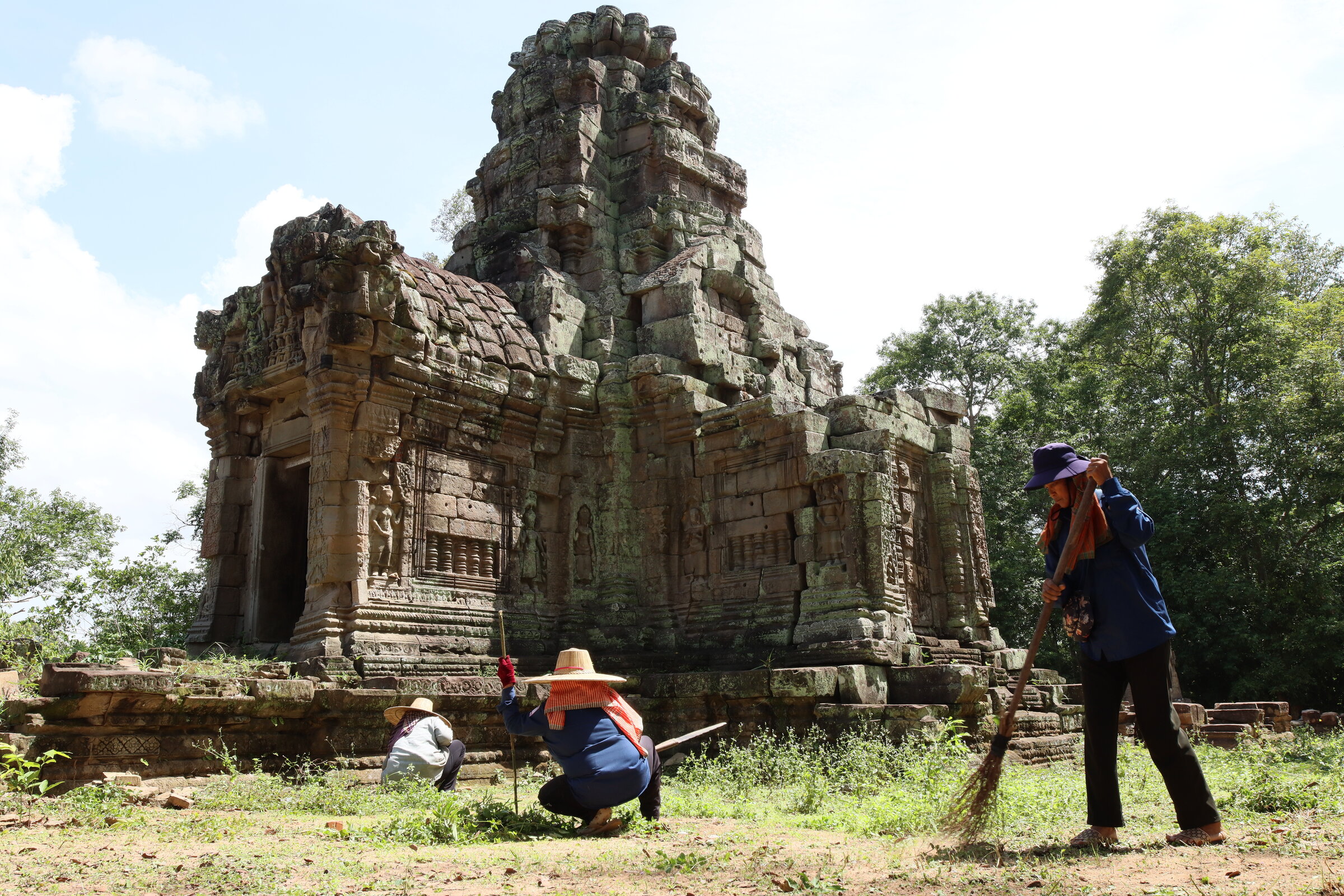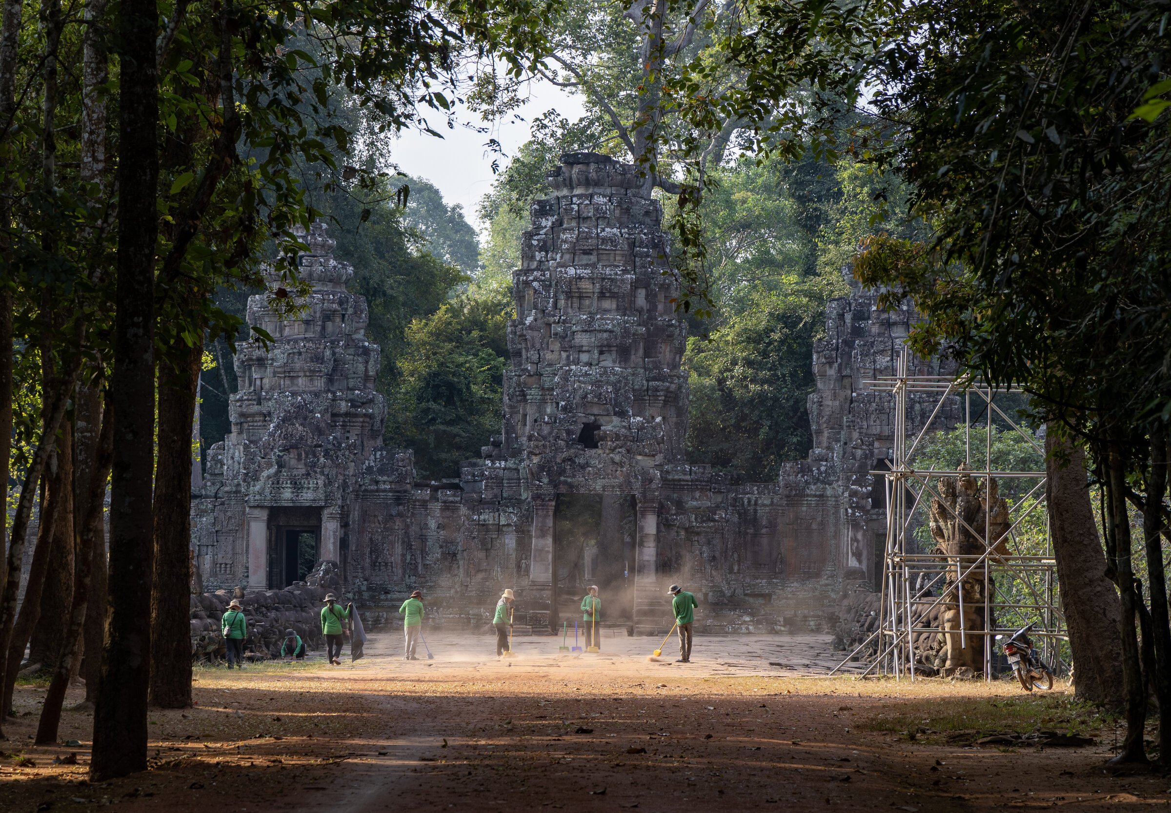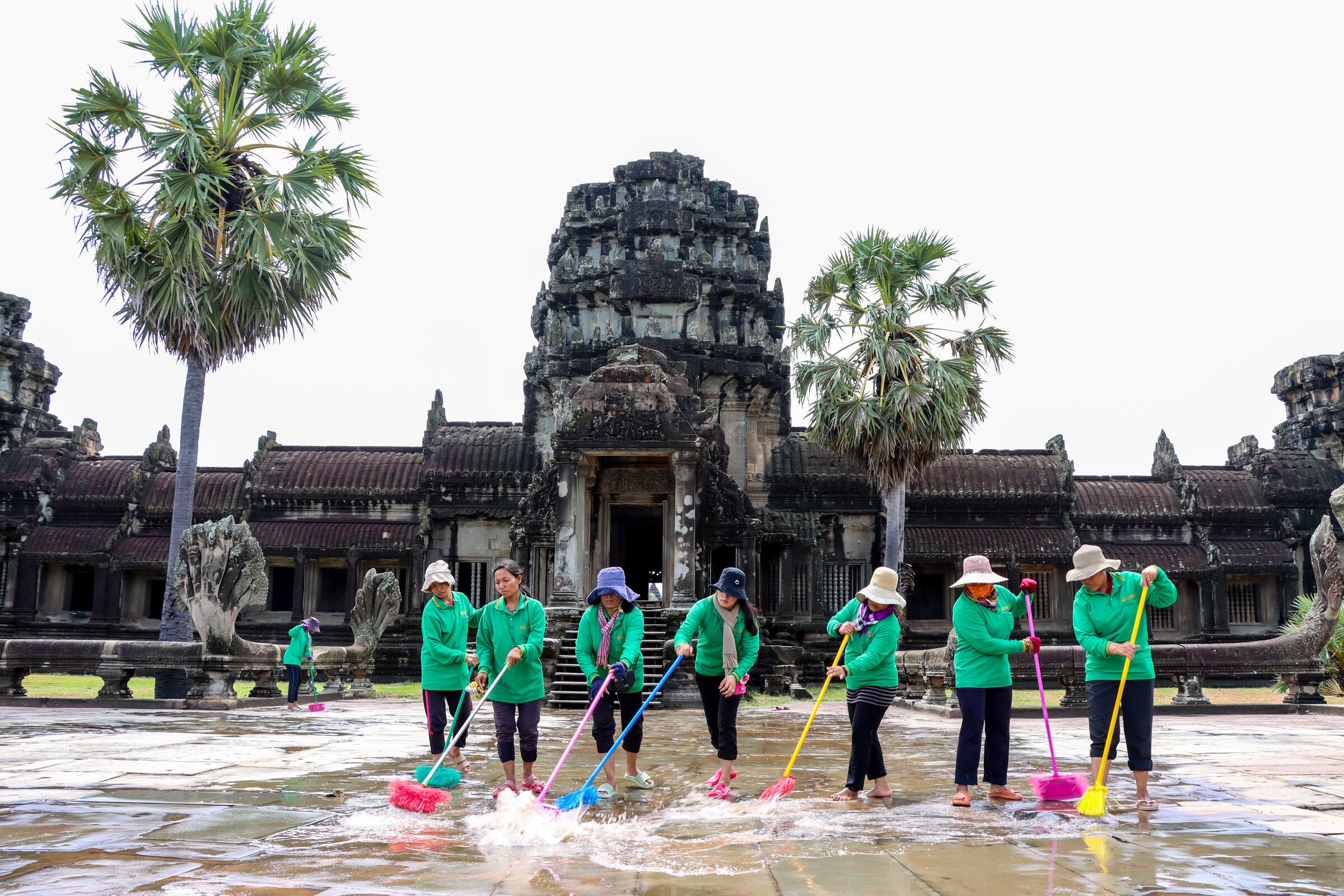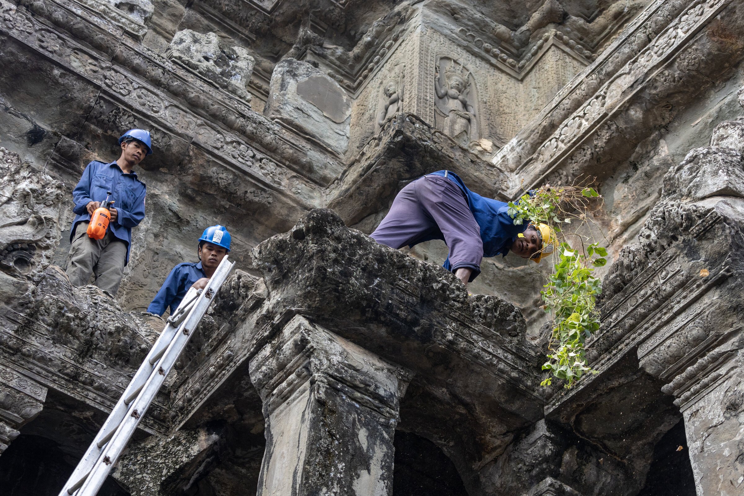 Nowadays, APSARA National Authority works again with cleaning companies to ensure the cleaning and maintenance of the area. HCC, a private cleaning company whose uniforms can be seen on these photography, has been replaced by VGreen, part of the Cambodian company Sonavith, employing in 2025 some 551 workers, 80 pc of them women. APSARA technical services are in charge of the clearing of the monuments proper, and coordinate with the Forest Research Institute of India (FRI) for the conservation and maintenance of large trees.