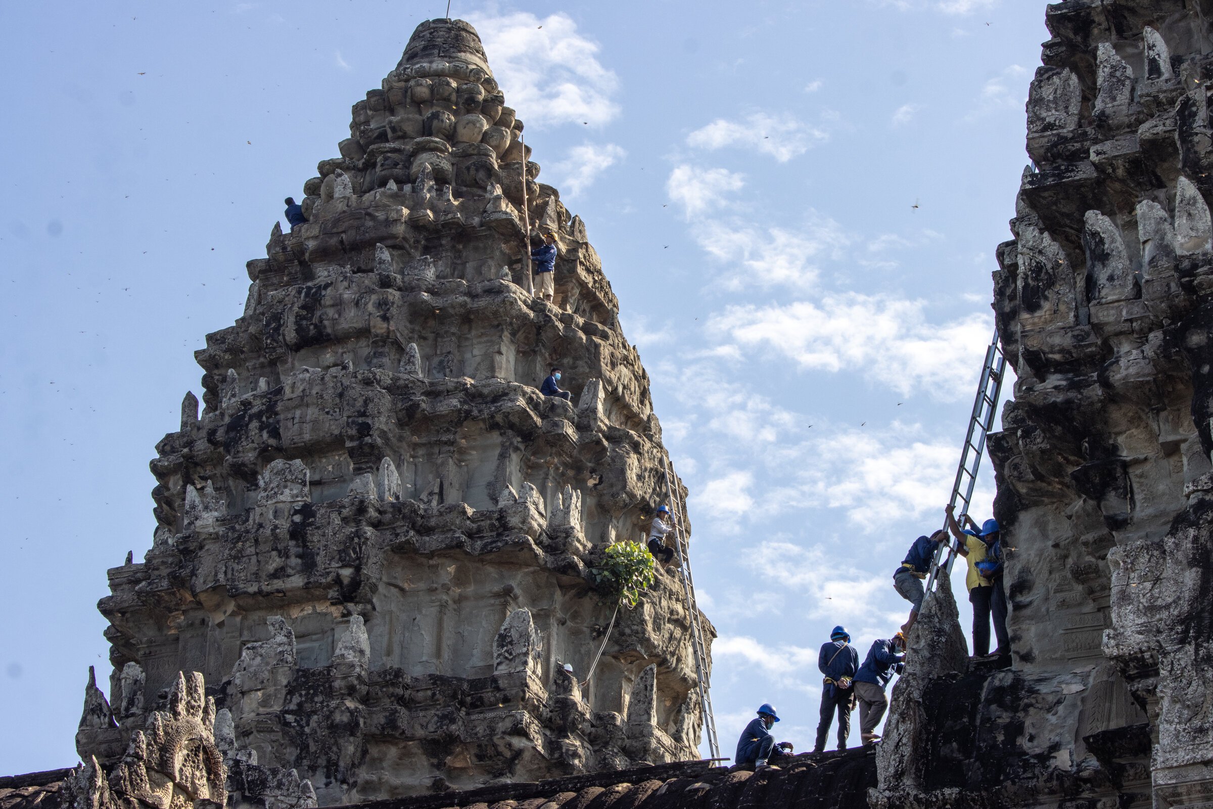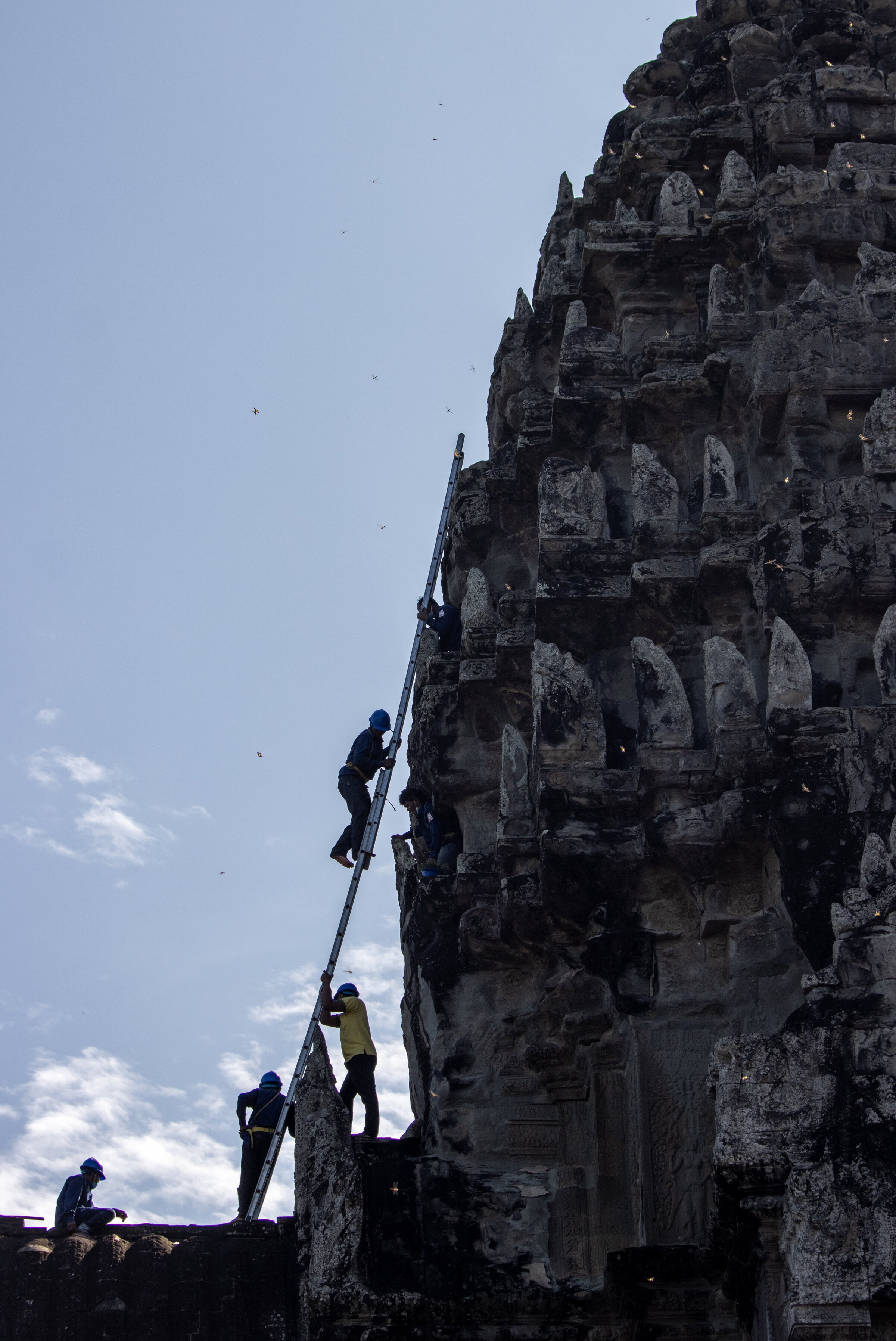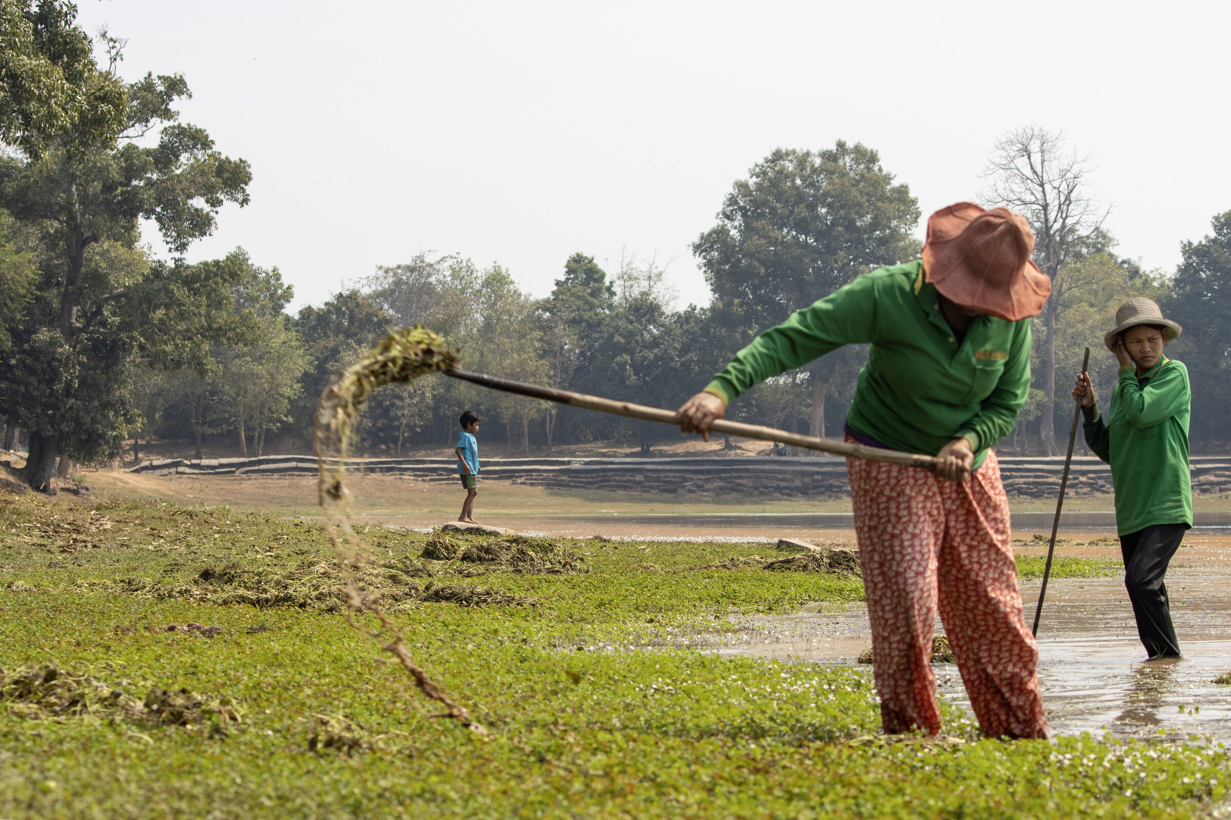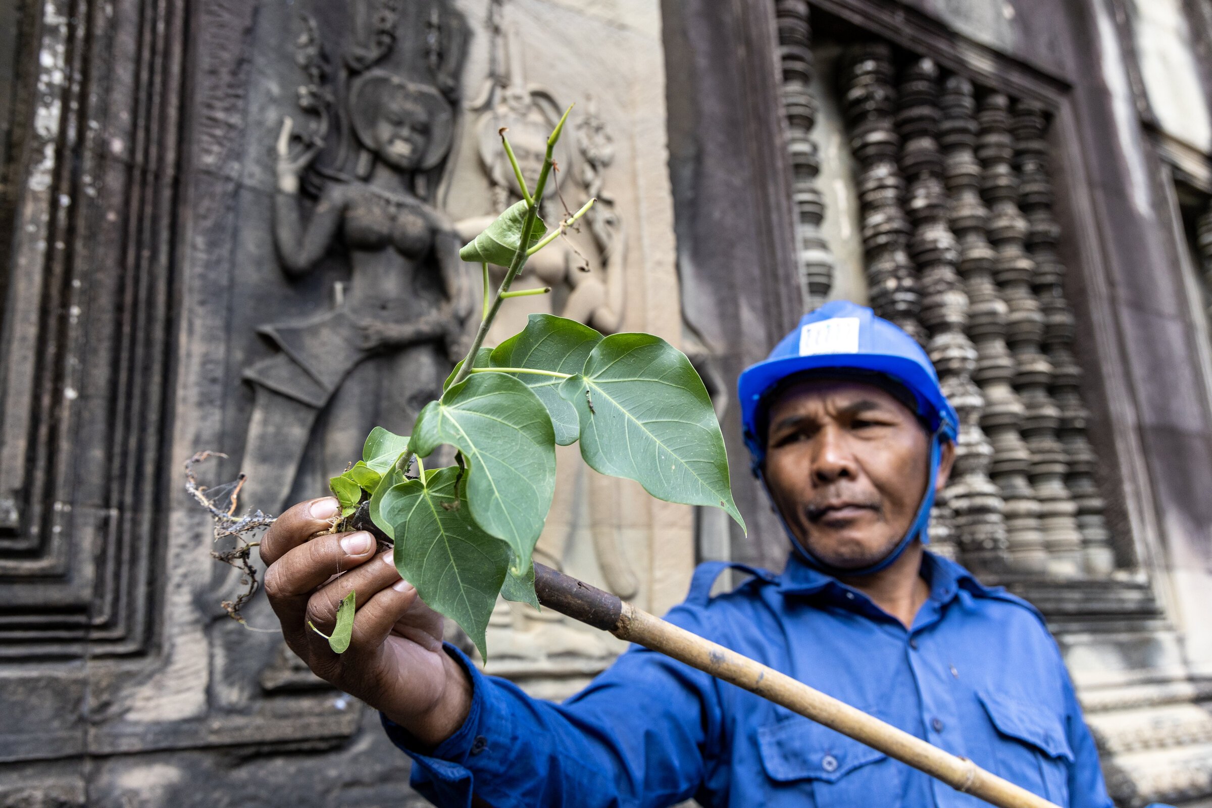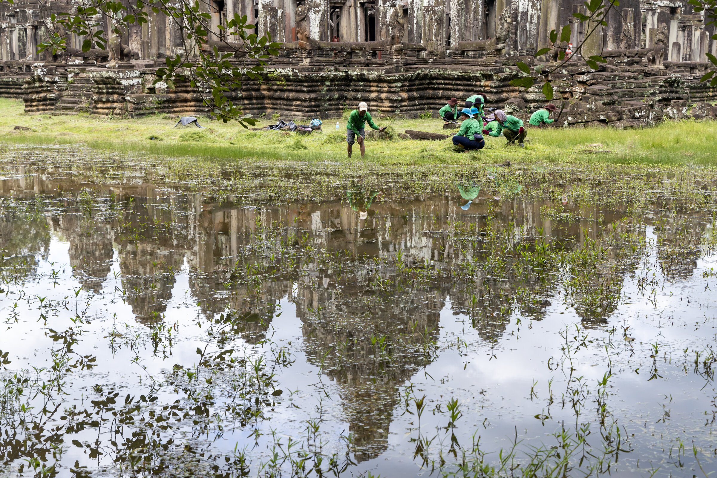 Across 400 square kilometers (about 154 square miles), the maintenance and preservations teams of APSARA Authority and, in the last decades, various service companies under contract, are each and every day at work to keep Nature at bay from hundreds of temples and monuments in a non-aggressive, eco-responsible way. Photographer Lim Bunhong has documented this effort for over two years, from acrobatic prowess when reaching the upper structures to the humble yet essential task of keeping the numerous bodies of water clear of invasive vegetation.
