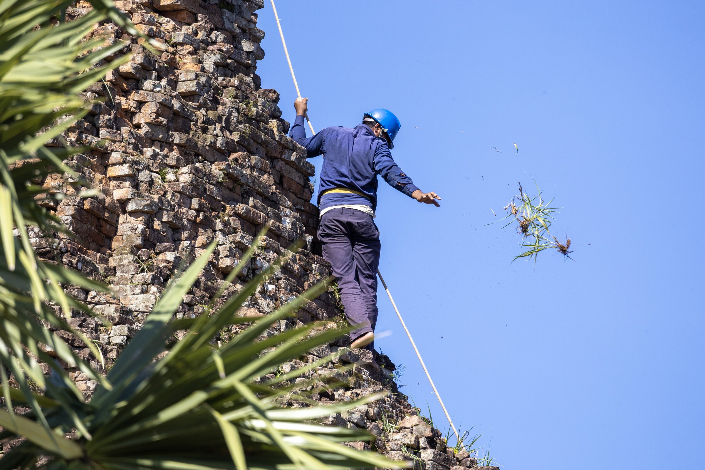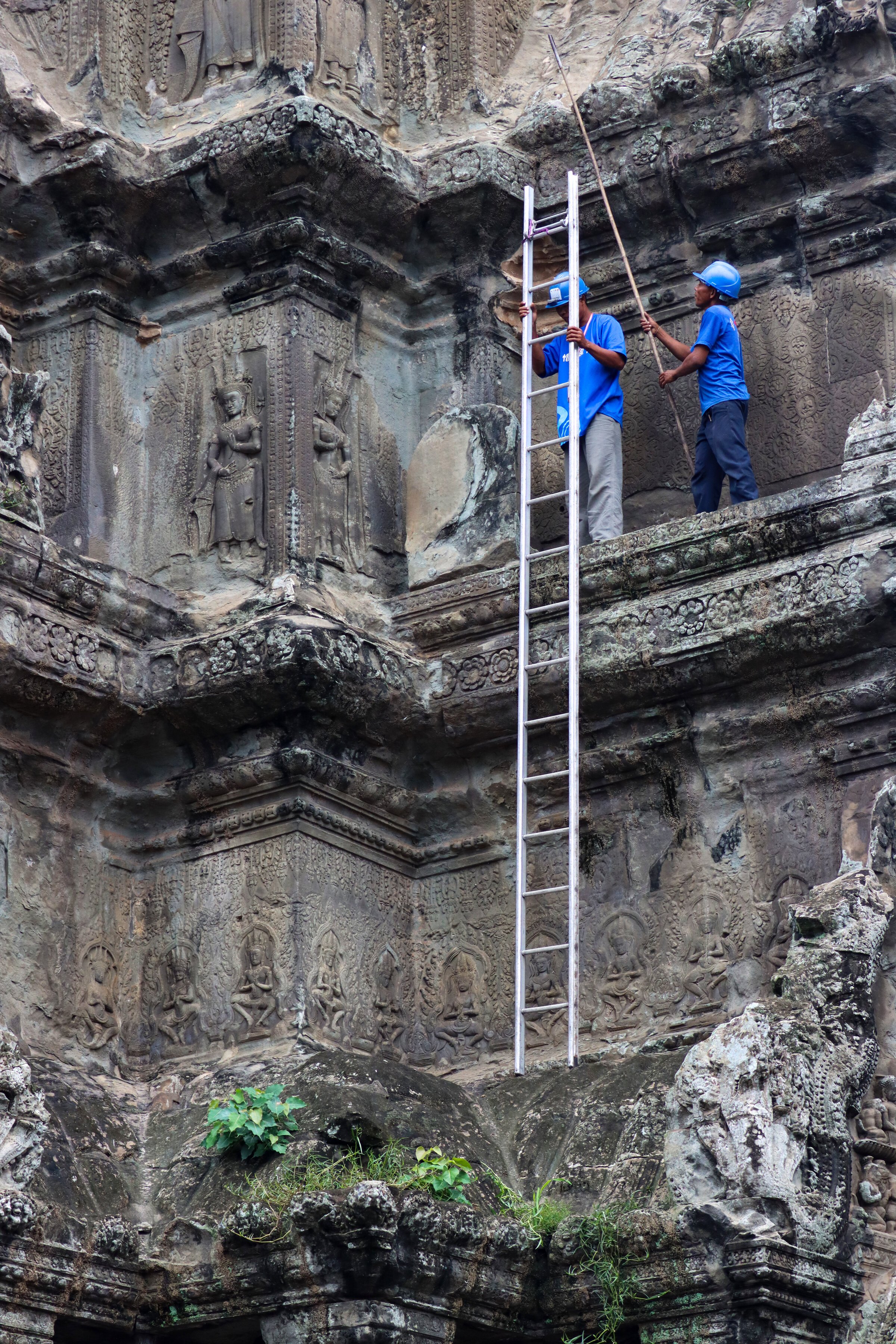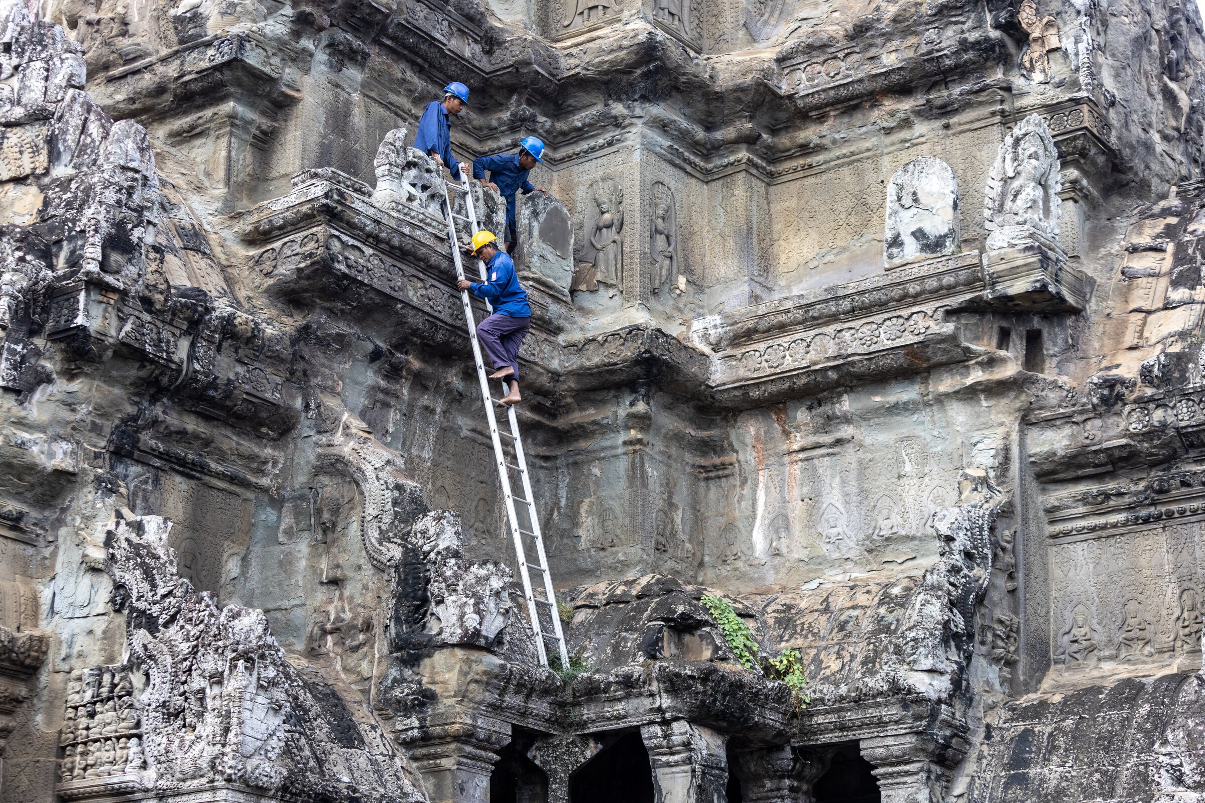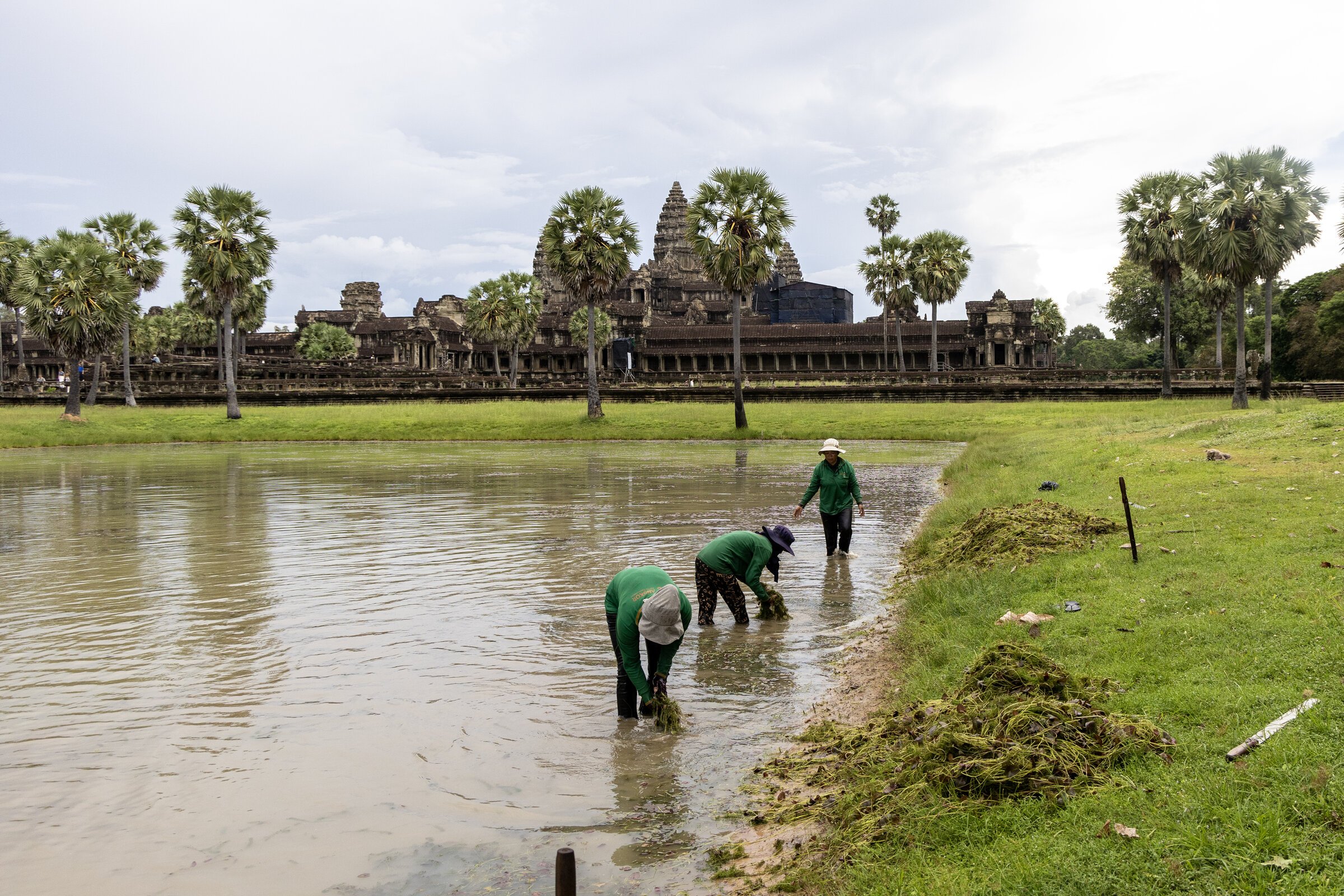 Across 400 square kilometers (about 154 square miles), the maintenance and preservations teams of APSARA Authority and, in the last decades, various service companies under contract, are each and every day at work to keep Nature at bay from hundreds of temples and monuments in a non-aggressive, eco-responsible way. Photographer Lim Bunhong has documented this effort for over two years, from acrobatic prowess when reaching the upper structures to the humble yet essential task of keeping the numerous bodies of water clear of invasive vegetation.