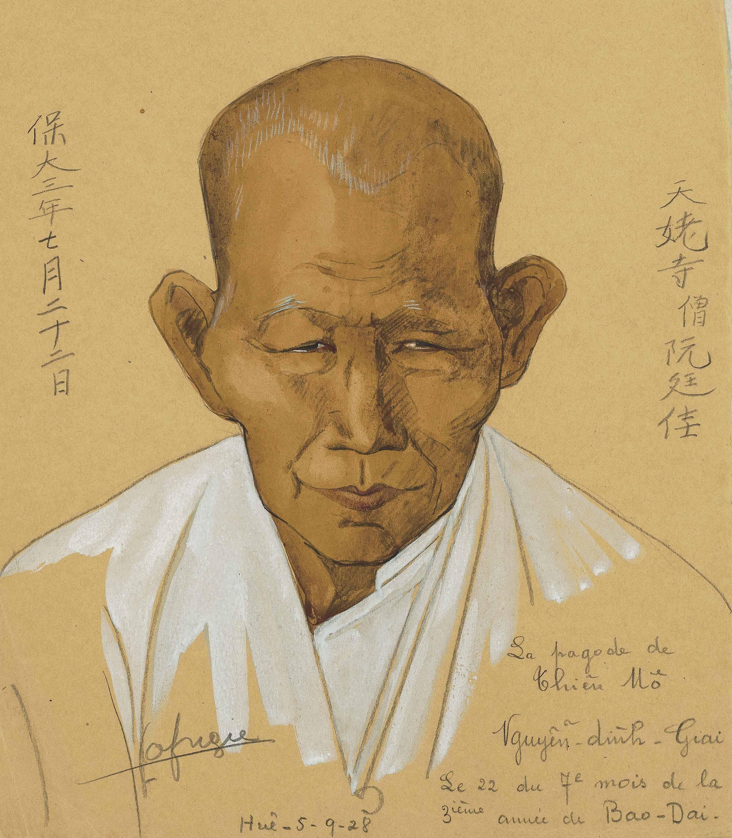 The Thiên Mụ Temple [vn Chùa Thiên Mụ “Temple of the Celestial Lady”], where Lafugie painted her Portrait de Nguyen Dinh Giai à la pagode de Thien Mo (Portrait of Nguyen Dinh Giai at the Thien Mo Pagoda) [LL-V-13] in 1928, is a historic temple built by the first emperor of the Nguyễn dynasty on the site of a pre-existing, on the northern bank of the Perfume River in Huế, Vietnam.