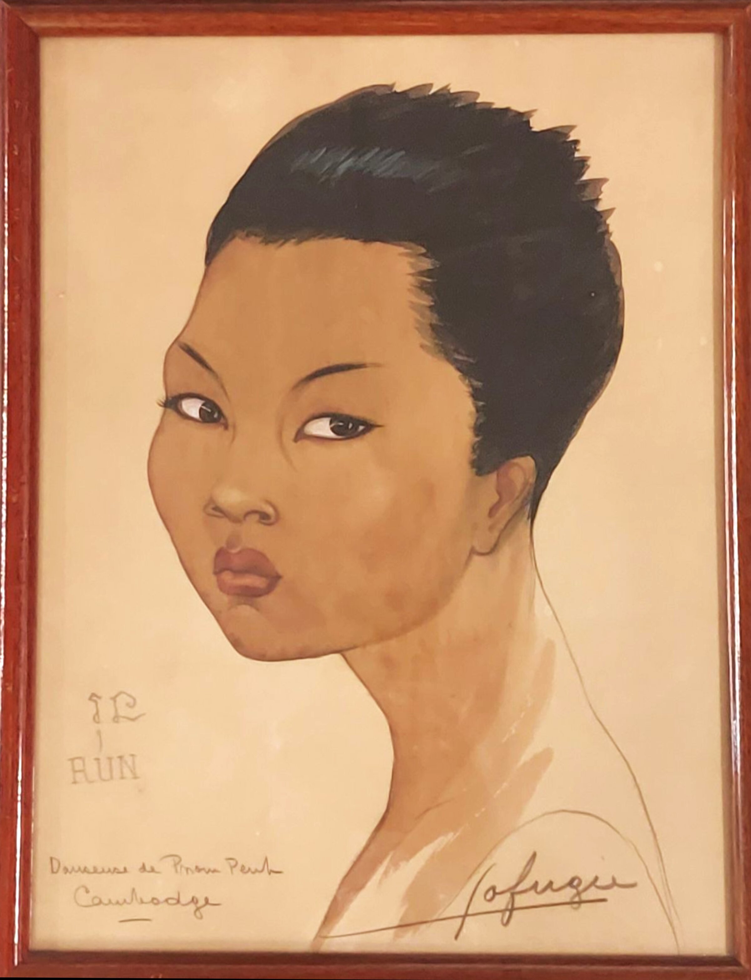“Run”, probably for Arun, might have been Saruong, another royal dancer remarked by Groslier. L.L. went to Angkor to witness the ceremonial dances for the new King in the ancient Khmer temples — for instance LL-C‑3, watercolor on paper dated ‘Angkor’ -, also painting at least 2 views of Angkor Wat and 2 of the Bayon, which we’ve been unable to find so far, and drawing Khmer villagers, men and women, in Siem Reap.