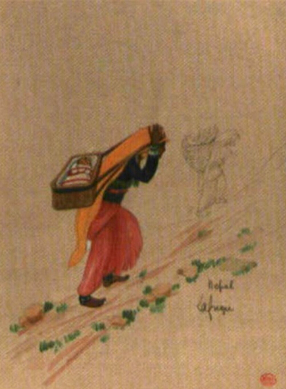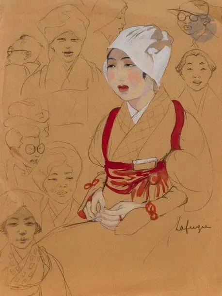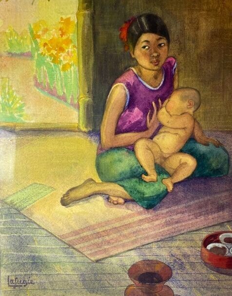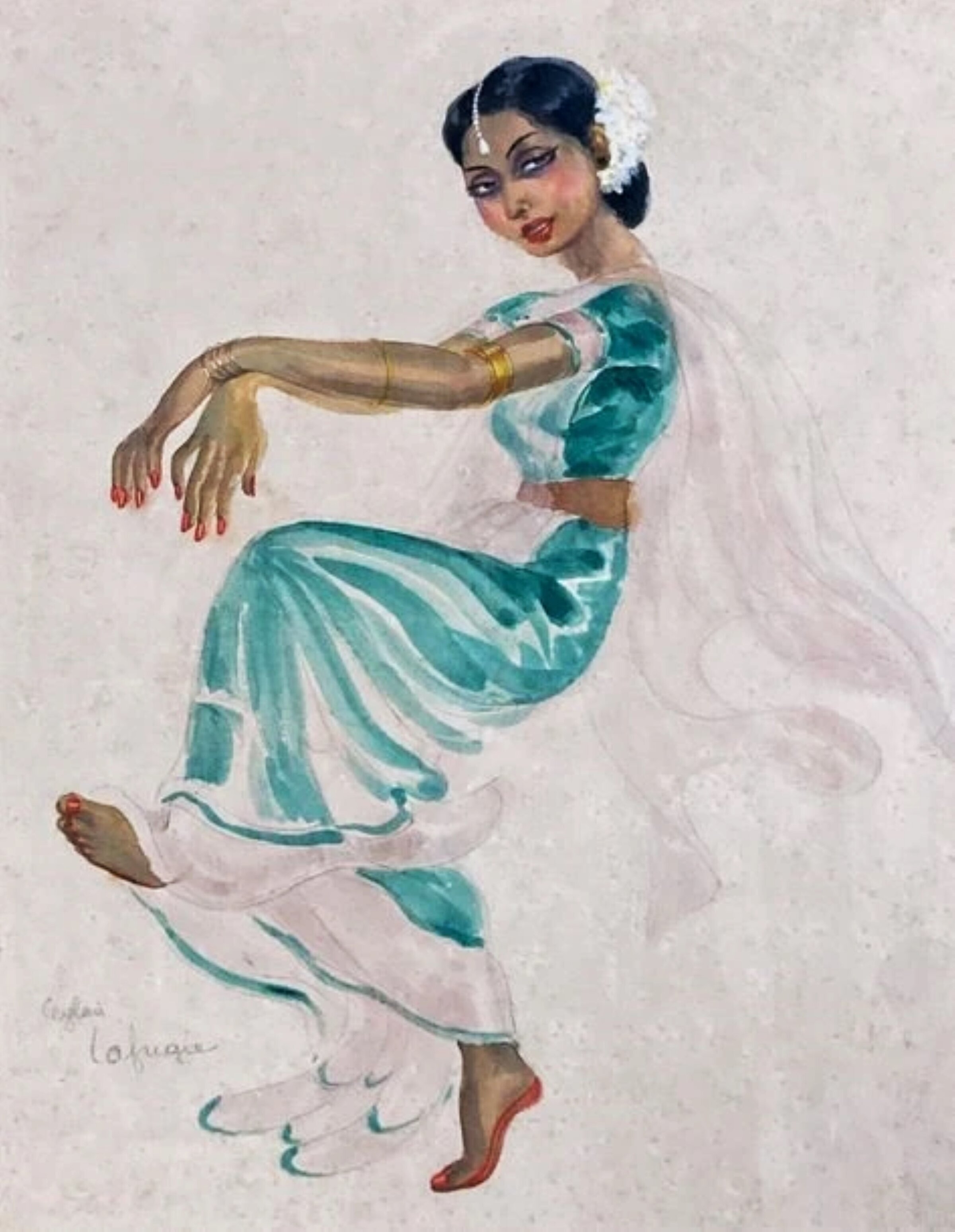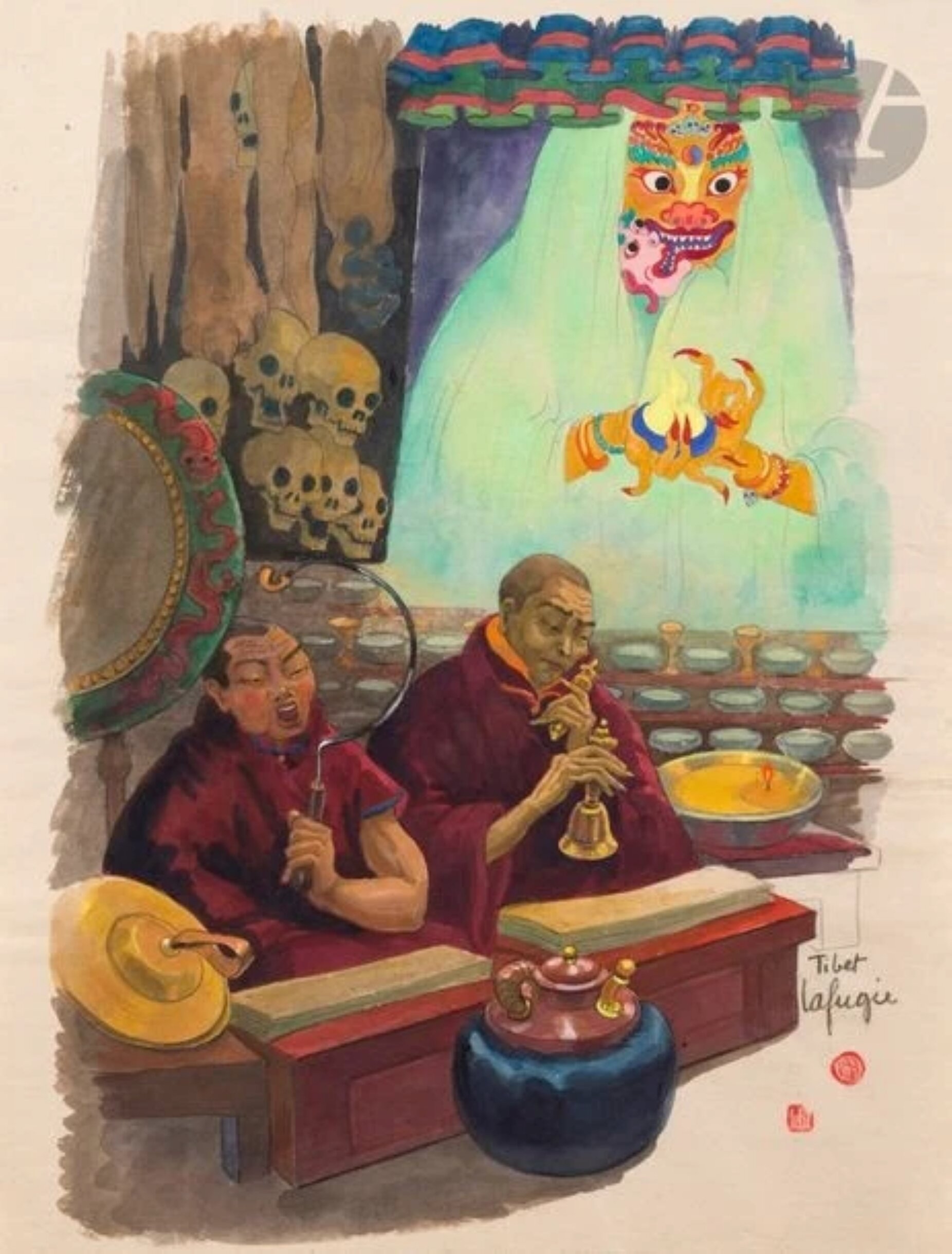 A prolific artist, she held in December 1927 an exhibition at the School of Fine Arts of Calcutta with no less than 280 works. She portrayed Tibetan monks, opium users in China — with notations pointing to the fact that she tried it more than once -, Cambodian, Javanese and Burmese dancers, and was also so well-connected that she could paint portraits of Mahatma Gandhi, Rabindranath Tagore - who had been portrayed by French artist Andrée Karpelès (Suzanne Karpelès’ sister) in 1920 -, or King Sisowath Monivong in Phnom Penh. She was known as Madame Lafugie, and before her marriage as Mademoiselle Lafugie, or simply Lafugie. A talented photographer, she often took photos of her subjects to document future paintings. As she recounted in her book Tibet, terre des buddha vivants (1963).