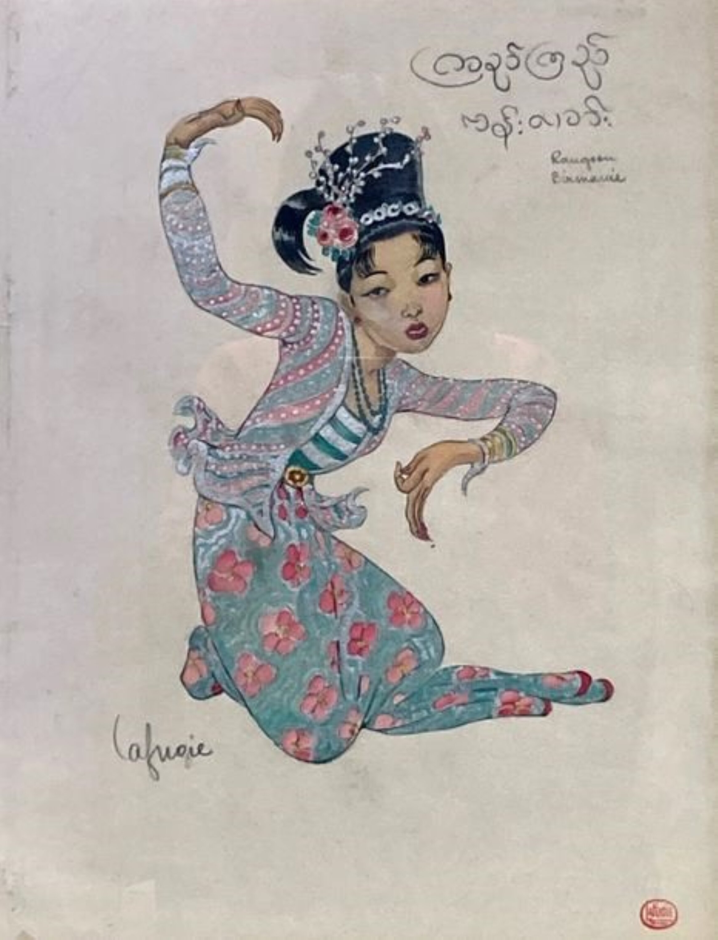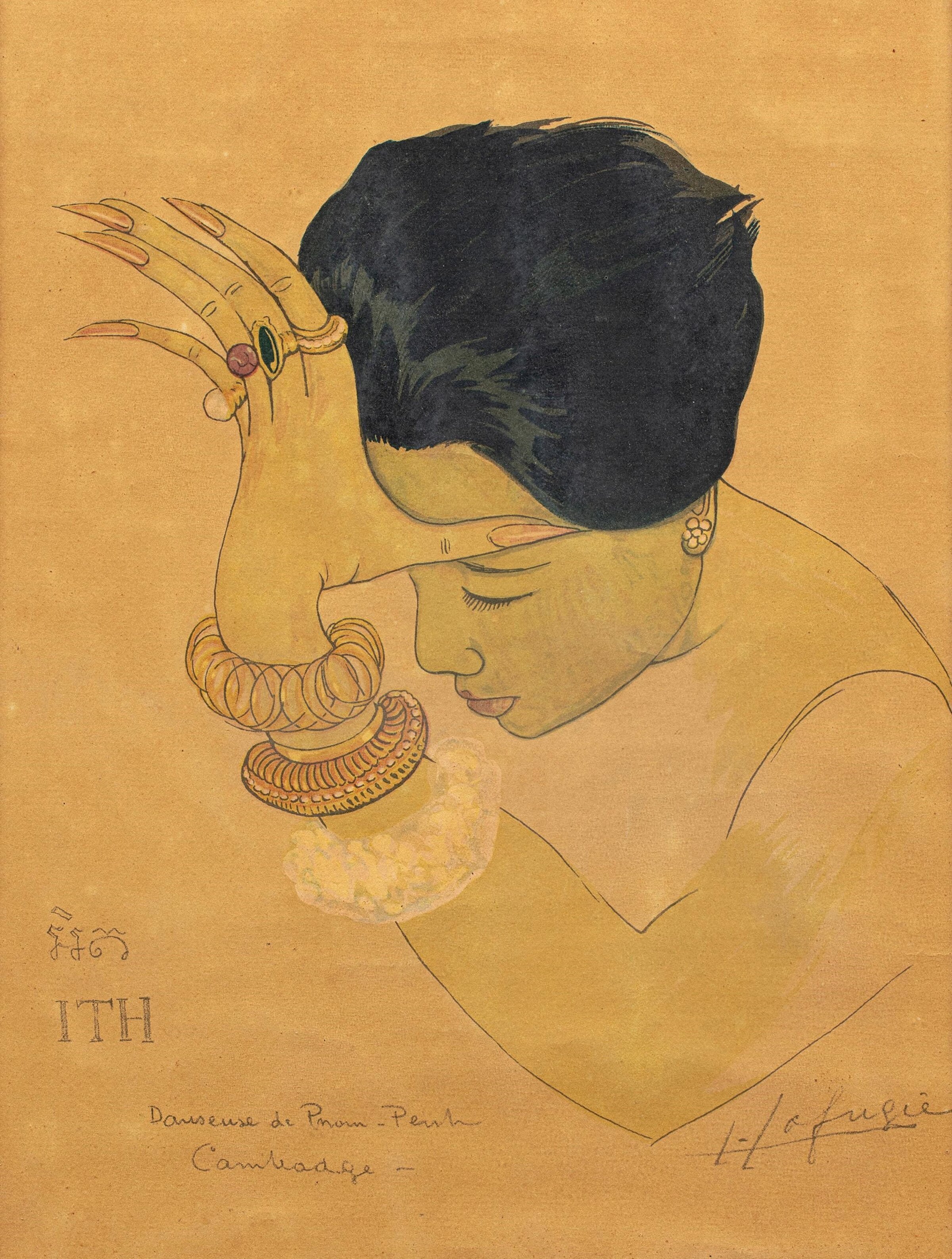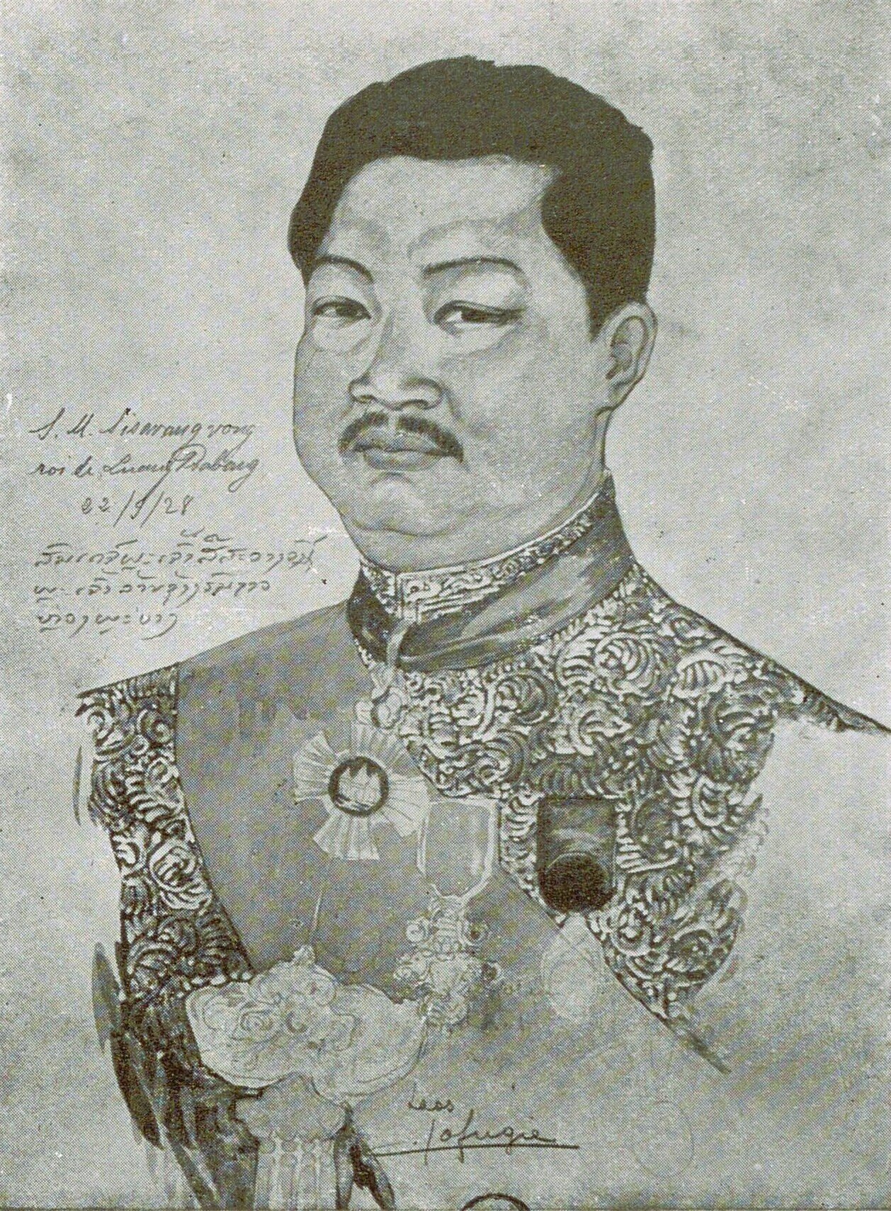 Portraits of Cambodian Royal Ballet dancers Ith (written អិត in Khmer by the artist) and Run (រុន)open this gallery and the Cambodian series of Léa Lafugie’s works we were able to find in reproduction (LL‑C), along with the portrait of King Sisowath Monivong ស៊ីសុវត្ថិ មុនីវង្ស (27 December 1875 – 24 April 1941. r. 1927 – 1941). Lafugie had come to Phnom Penh to attend the ceremonies for the coronation of King Monivong in July 1928, and since she was used to ask royalties and dignitaries to autograph her work — often in their own language’s script — it seems the Cambodian sovereign complied to sign in his own hand, the same way King Sisavangvong of the Kingdom of Luang Prabang, who was a royal guest at the Phnom Penh coronation, would do it for her three months later in Laos (LL-L-13). King Sisavangvong (14 July 1885 – 29 October 1959, r. 1905 – 1945, and as sovereign of the Kingdom of Laos 1946 – 1959), was the last ruler of the Lao Kingdom of Luang Prabang and the founding king of the Kingdom of Laos.