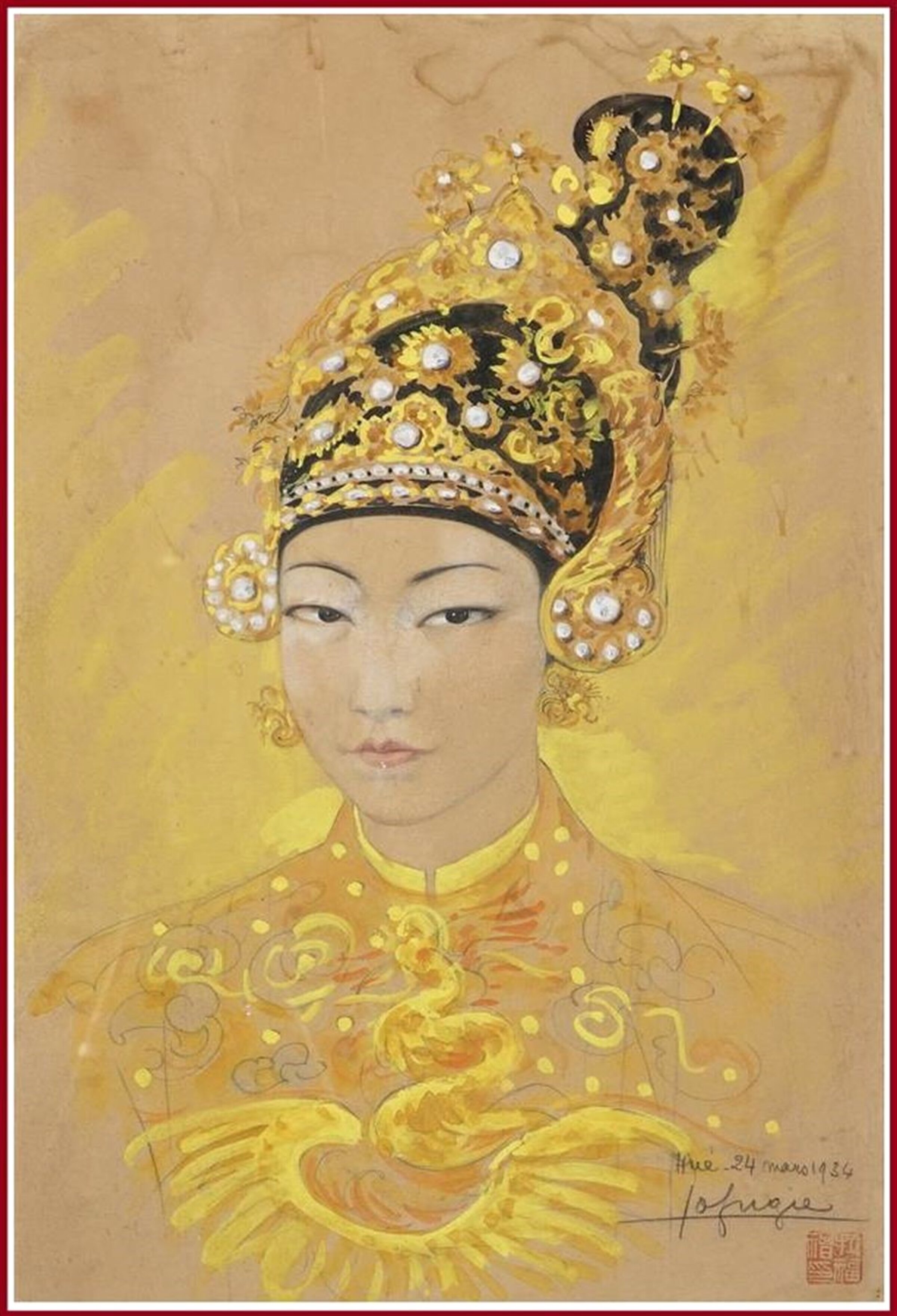 In September 1928, back from Laos in a daring river journey, the artist was introduced to the Imperial Court of Hue, Đại Nam (the name of Vietnam before 1945) and six years later, on 24 March 1934, the exact day of her wedding and coronation, she painted a magnificent portrait of the last empress consort (hoàng hậu) of the Nguyễn dynasty, Nam Phương, née Jeanne Marie-Thérèse Nguyen Huu Thi Lan (4 Nov.1913 or 14 Nov. 1914, Gò Công, Cochinchina — 16 Sept. 1963, Chabrignac, France), the wife of Emperor Bảo Đại (r. 1926 – 1945) [portrait LL-V-14 dated on that day, ink and watercolor].