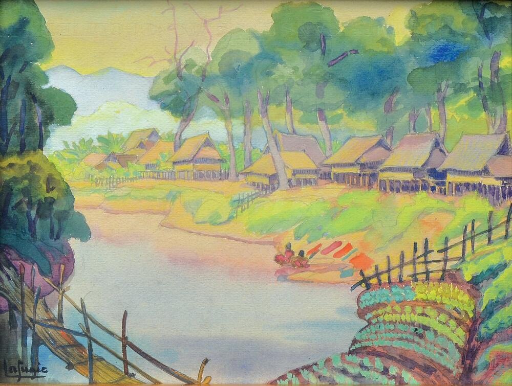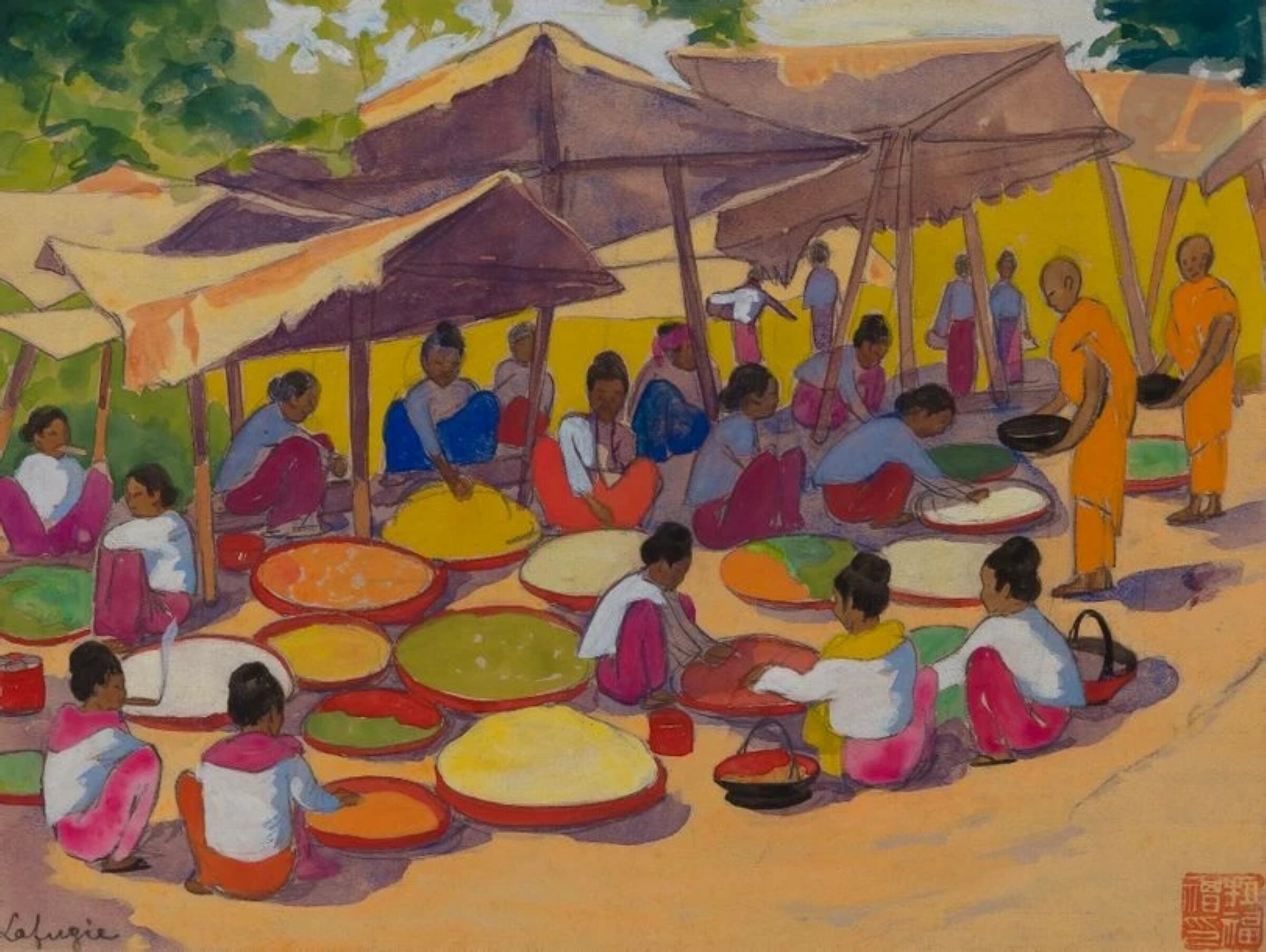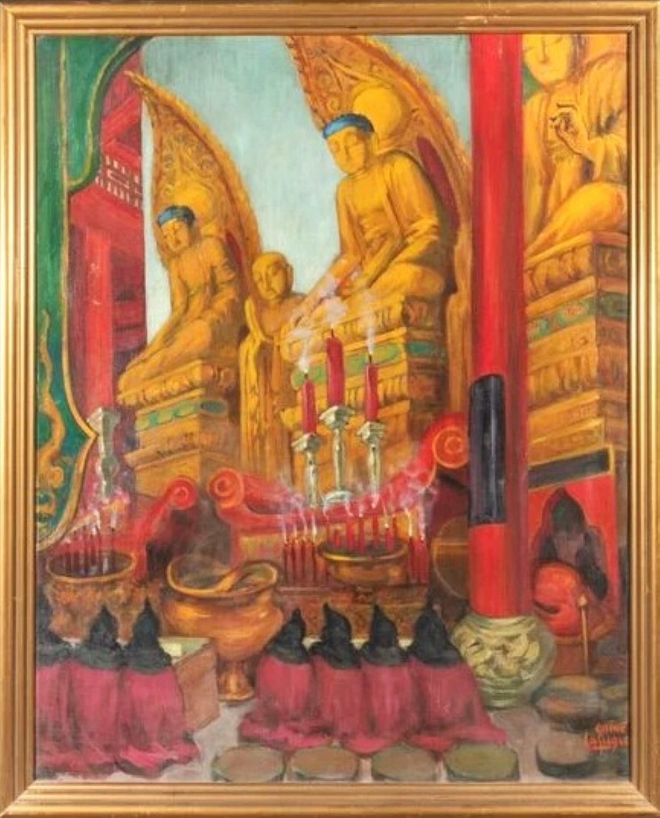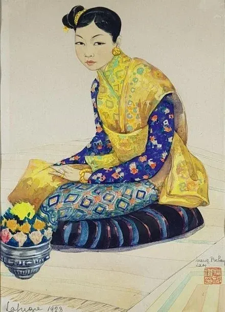 From 1928, Léa Lafugie explored Burma via mountain trails, Cambodia, Laos, Tonkin, Annam and Cochinchina. She painted the portrait of the King of Cambodia Sisowath Monivong, depicted the dancers of the royal ballet and drew the temples of Angkor. She crossed the virgin forests of Northern Siam to Bangkok. Her landscapes and portraits were exhibited the same year in Bangkok, then in Calcutta. In Laos, she reached Luang Prabang by navigating the tumultuous currents of the Mekong on a bamboo raft. On August 8, 1928, she met Alix Aymé (then Alix Fautereau), who had come to study for the decoration of the King’s palace. A few days later, Léa Lafugie painted the portrait of the King of Laos in Paklay. In Hue, on September 3, 1928, she met up with her old classmate from the Decorative Arts School, Marie-Antoinette Boullard-Devé, married to the resident-mayor of Hue. Through her connections, Léa Lafugie painted the Regent of the Empire and the Queen Mother of Emperor Khaï-Dinh, both in richly embroidered, colorful brocade costumes. Her “adventures” were widely disseminated.