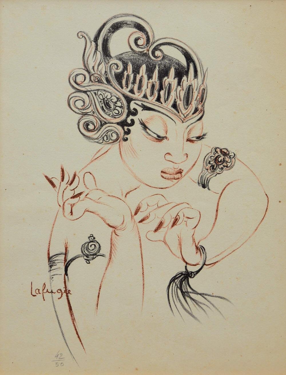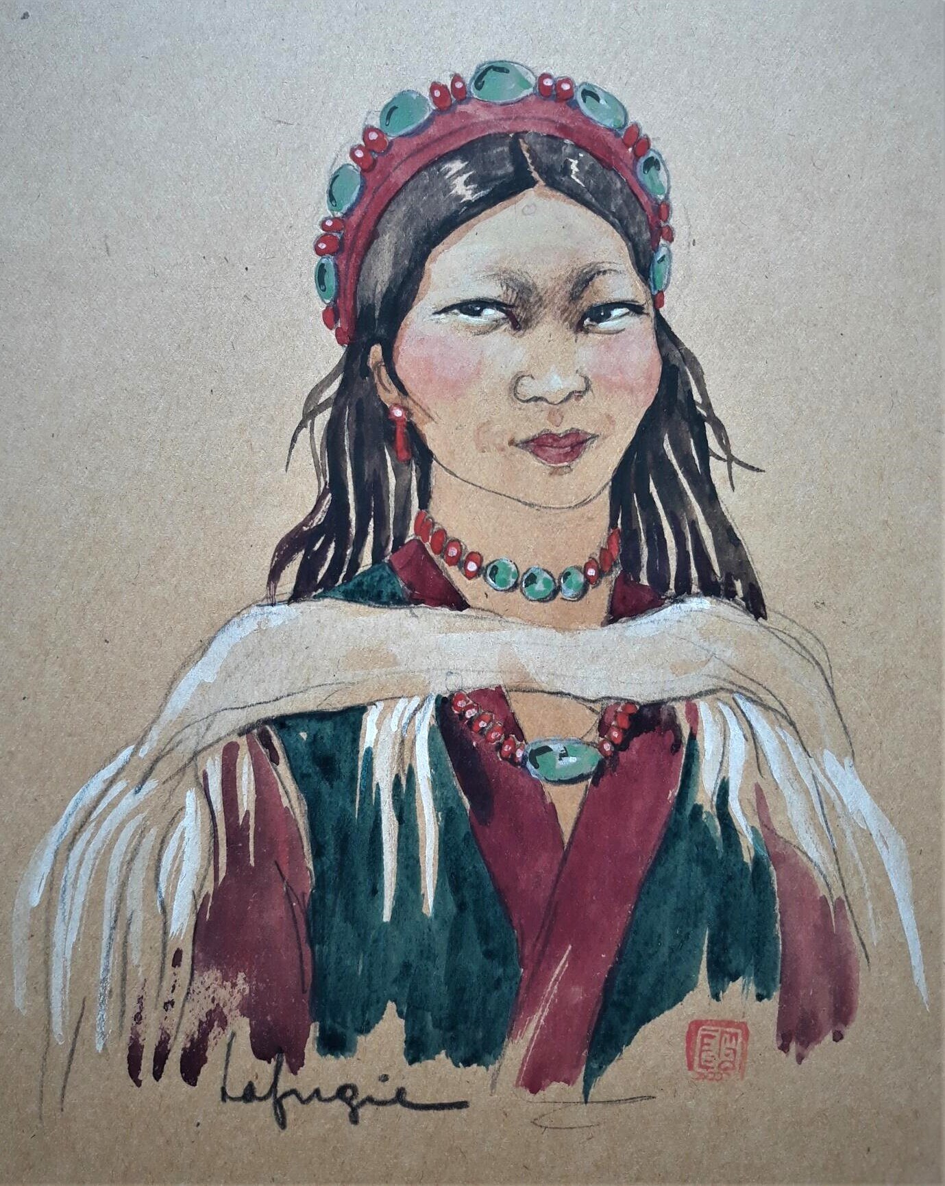 A fearless woman traveler who went alone to Tibet in 1926, 1927 and 1931, Léa Lafugie was above all an artist with a rare talent for sketching landscapes, landmarks and people. While a comprehensive study of her impressive artistic production is still to be done, we have gathered here some of her works by cultural areas, roughly corresponding to modern States in Southeast Asia. From Indian maharajahs to opium smokers in China and Vietnam to hill tribe women in Laos, Burma or Vietnam, from dancers at Phnom Penh Royal Palace to women in Japan and Bali, we get here an intimate, empathic and almost ethnographic vision of the Asia of yore, obviously beloved yet not idealized.