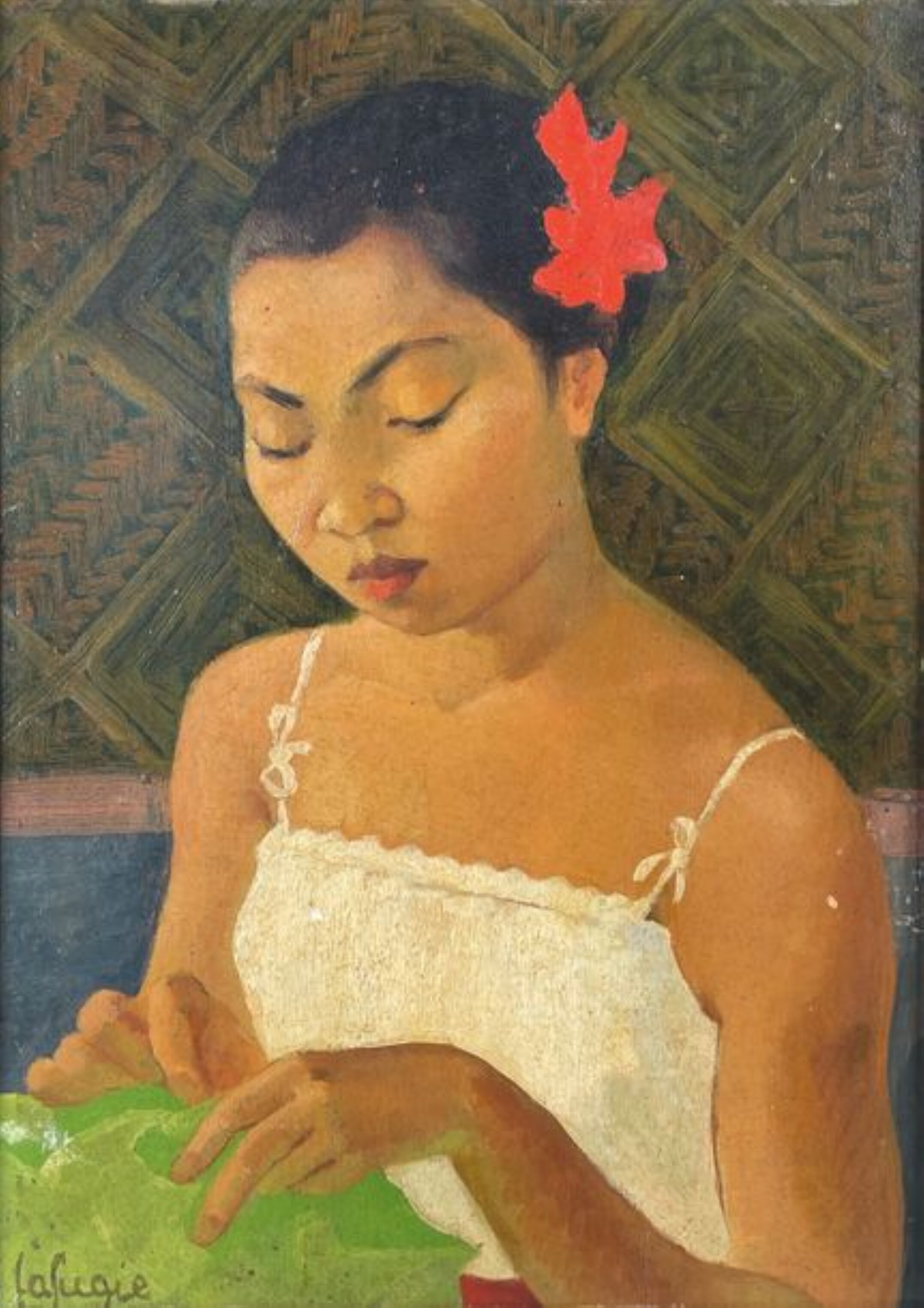 Following an interview with Alfred Meynard (1881−1951) in Hanoi, her travel accounts of Tibet, India, and other regions of Southeast Asia were published. Back in France, she organized a major exhibition of 187 paintings and watercolors at the Galerie Pleyel in June 1930[see below], entitled “Five Years of Expeditions in Asia,” inaugurated by the Undersecretary of State for Fine Arts. She completed the exhibition with four lectures on her expeditions. On this occasion, the French government purchased an oil on canvas, The Living Buddha of Tibet (Tournus, Hôtel-Dieu-Musée Greuze). In the autumn of that same year, she left for Indonesia, an expedition to the interior of Borneo, where she painted the Dayaks, the last “headhunters.” She traveled through the Sunda Islands and returned to India to prepare for a horseback crossing through Persia. She brought back unique portraits. Paris rediscovered her in late 1932 for an exhibition at the Galerie Charpentier, which featured fifty-nine watercolors, supplemented by a dozen portraits of Syrian and Arab leaders. The Paris Townhall then purchased her Koto Player and Japanese Woman from Kyoto, two works on paper that have since disappeared. [Sandrine Dapsens, ‘Léa Lafugie: Du Tibet à l’Indochine’, in Arielle Pélenc (dir.), Artistes-voyageuses 1880 – 1944: L’appel des lointains, Evian, 2023, p 232 – 44.]