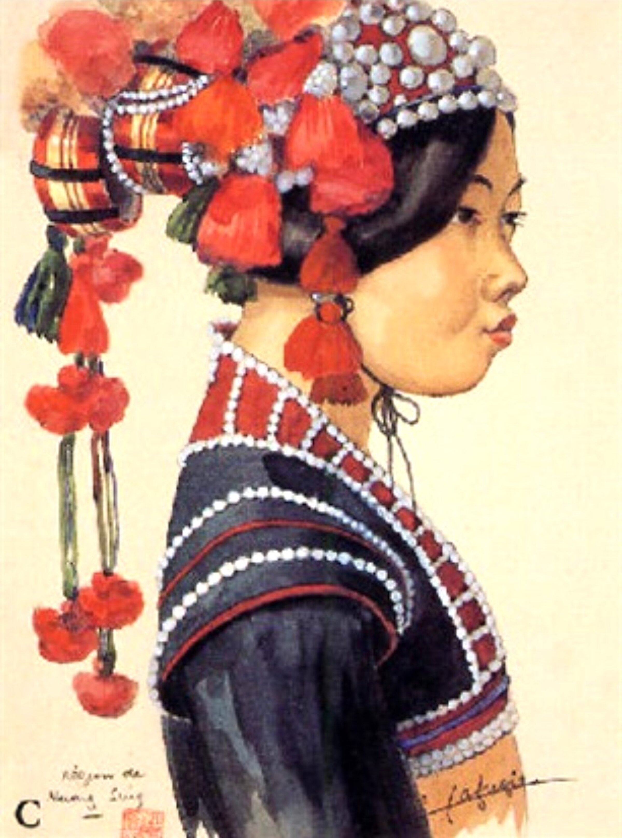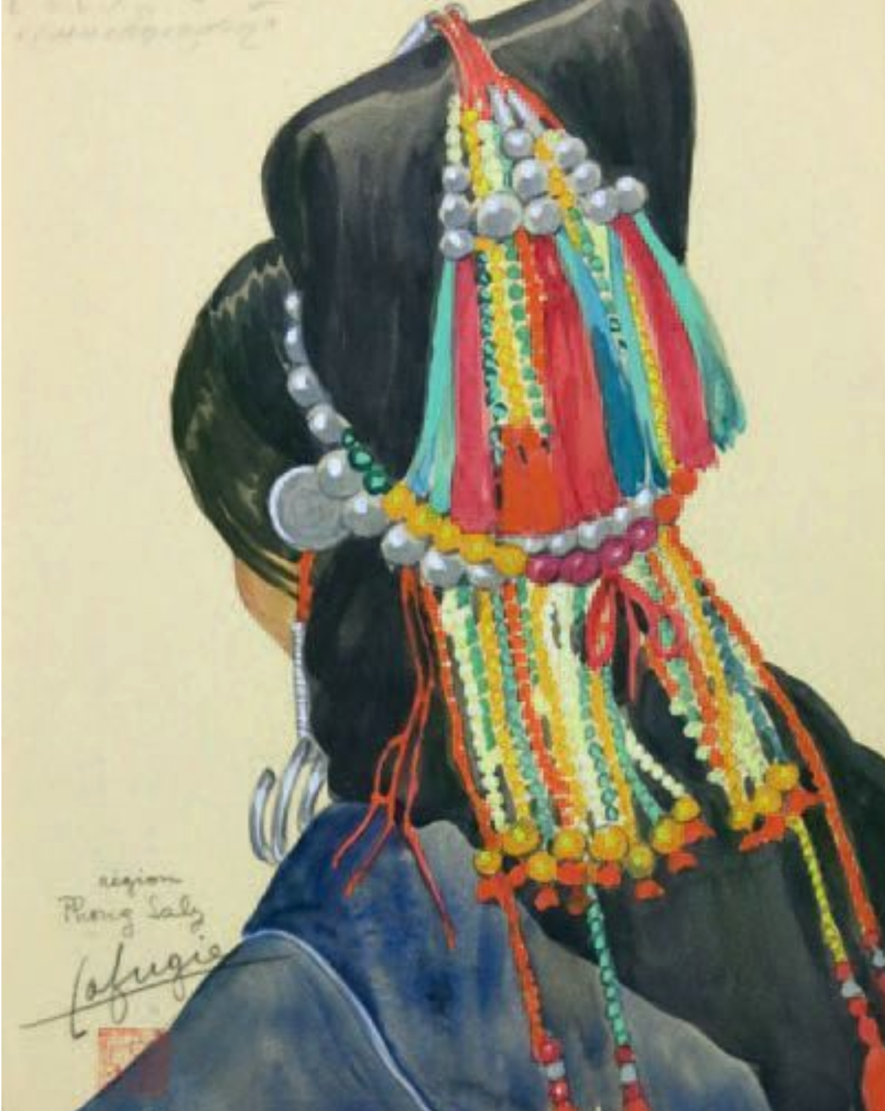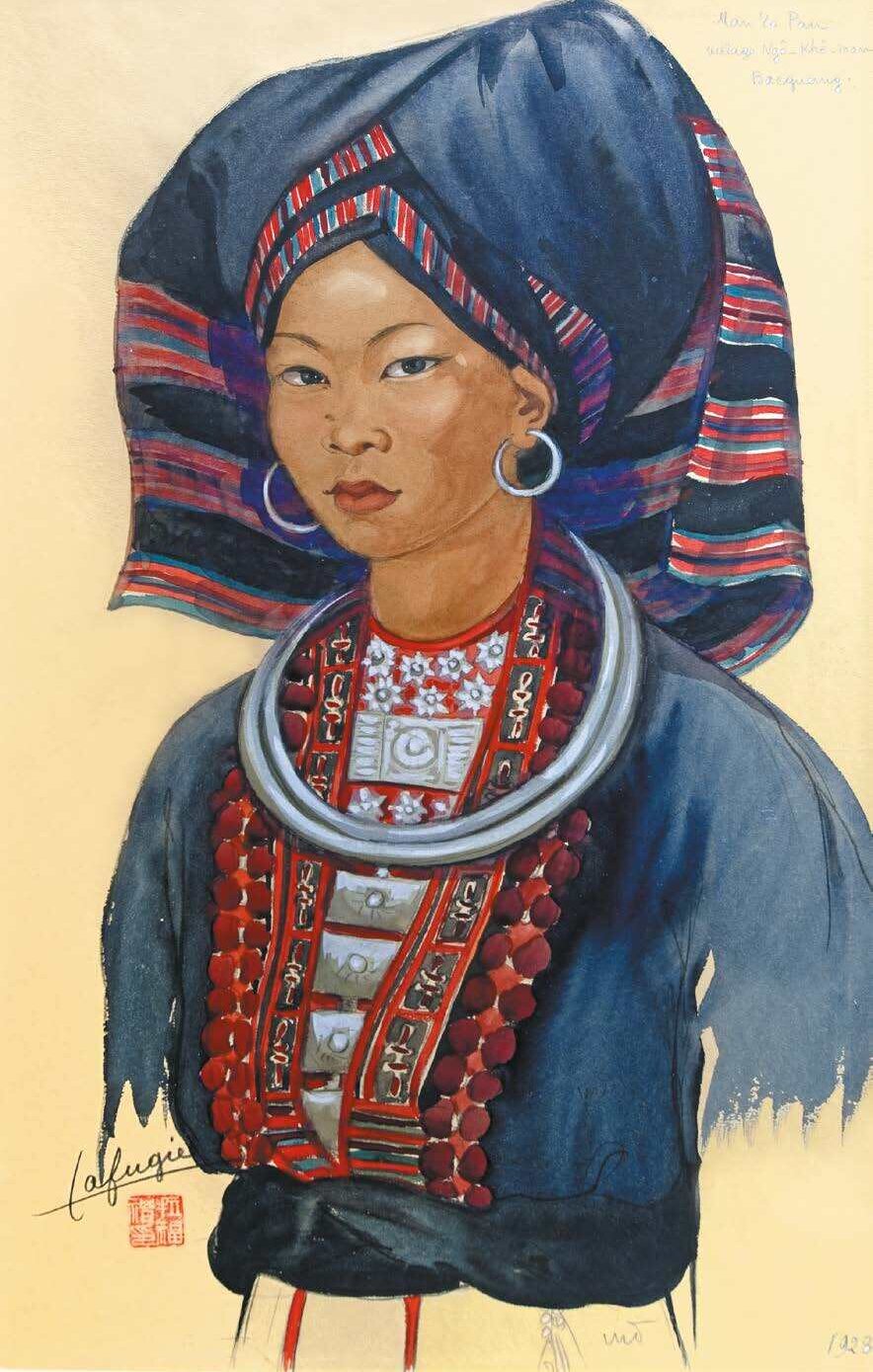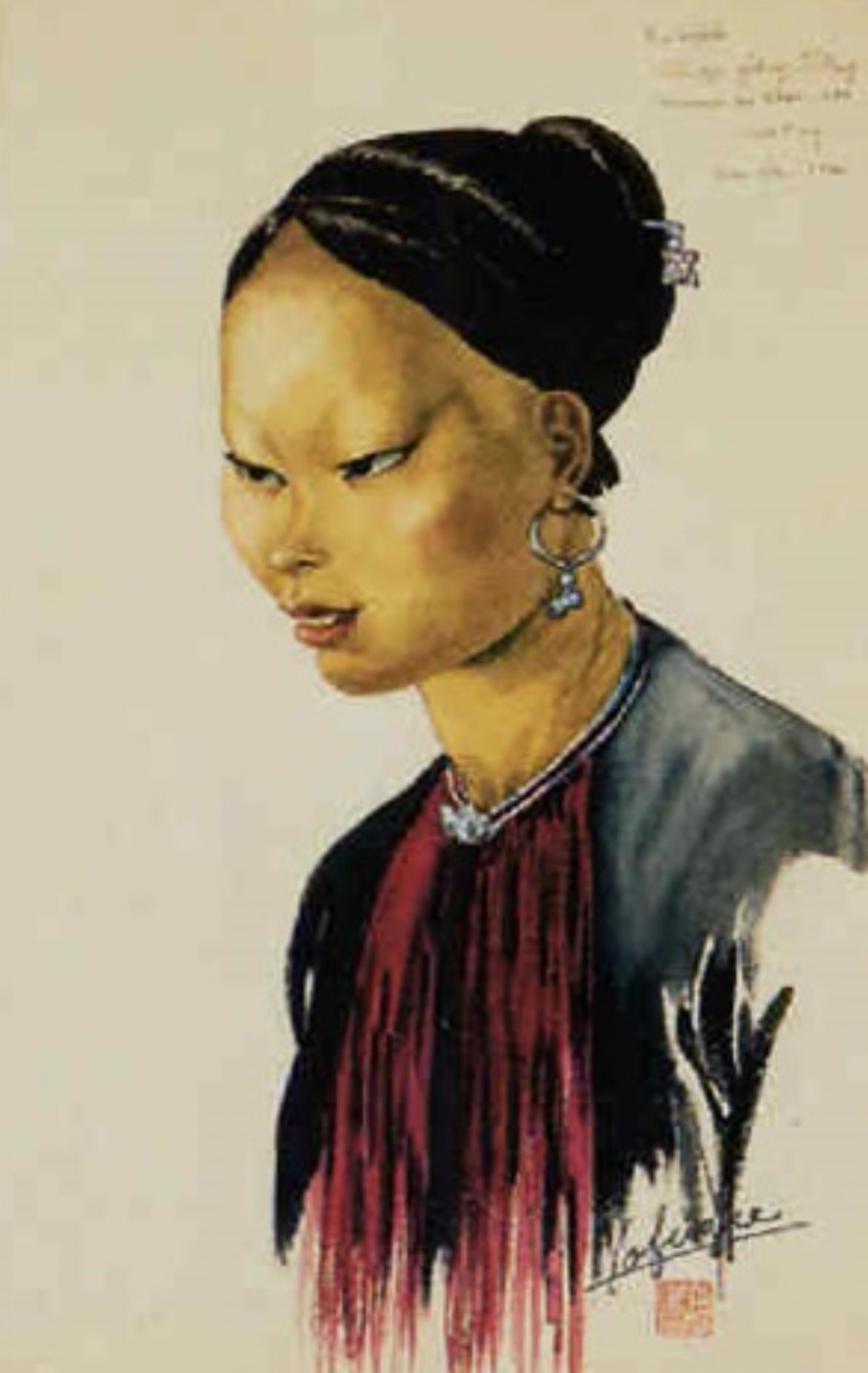 Far from traveling through Asia as some snobbish jet-setter, Léa Lafugie consistently directed her artistic attention to indigenous women. As a fashion illustrator in her earlier years, she was naturally enthralled by elaborate headdresses and garments since her first trip to the Himalayas. She also sensed women’s attire profundly reflected poorly documented minority cultures in the ethnic mosaic of Southeast Asia, and made a point in correctlynaming the ethnic groups her artistic subjects were belonging to, writing down toponyms in the local languages whenever possible.