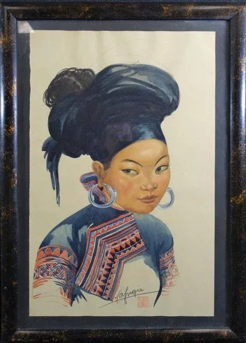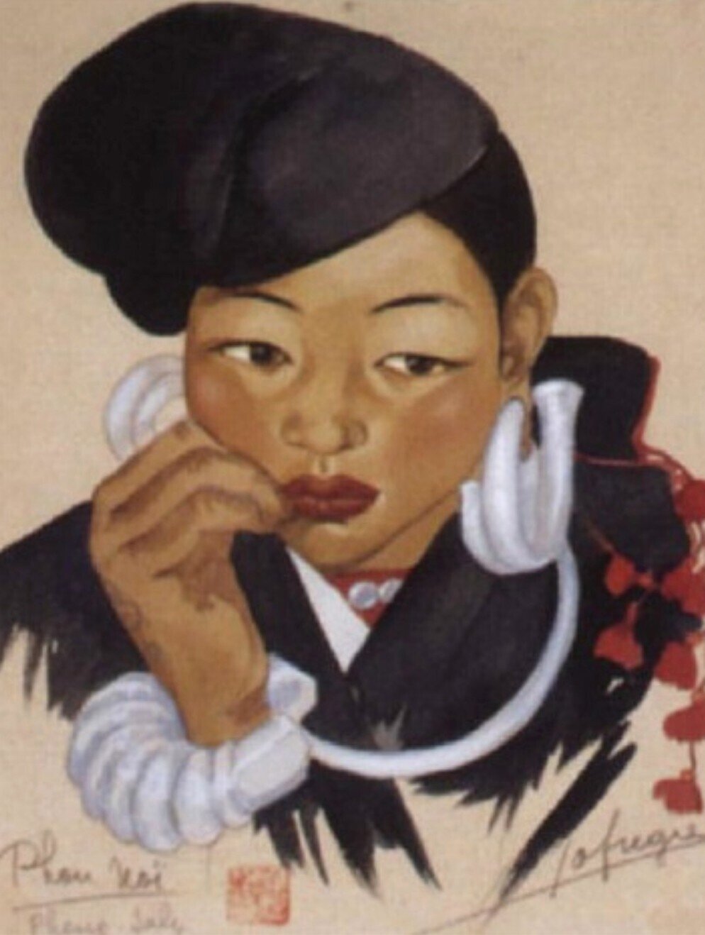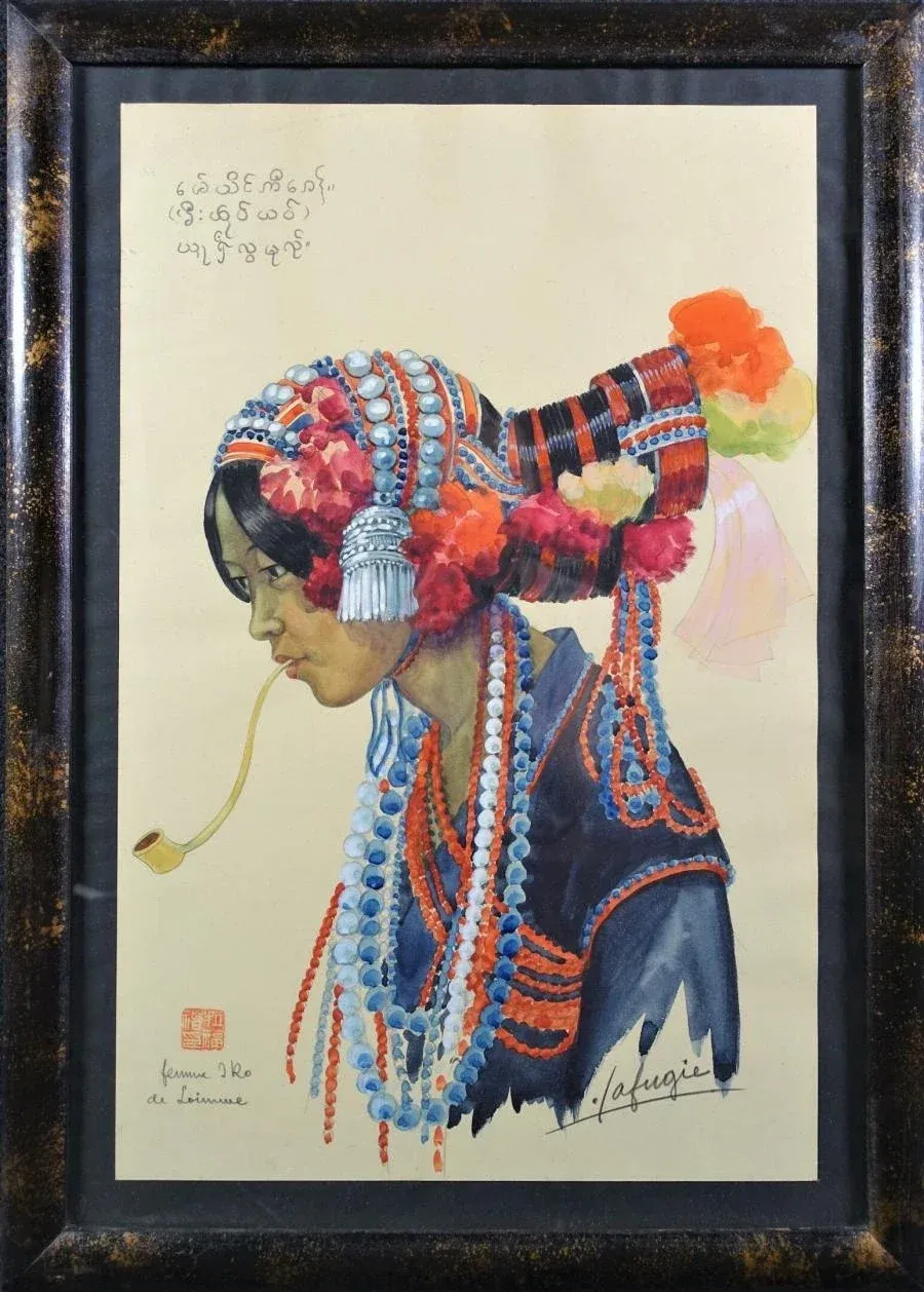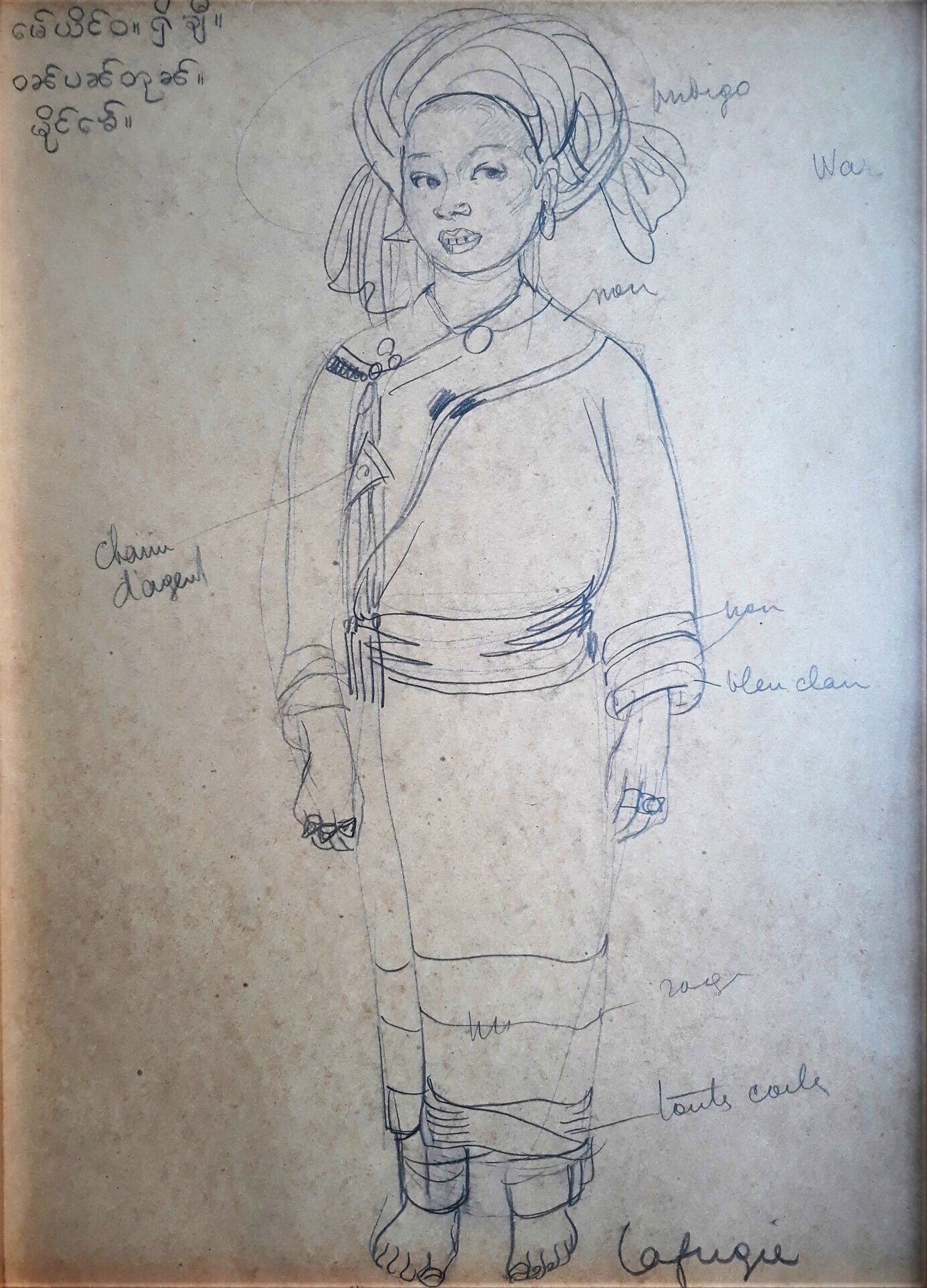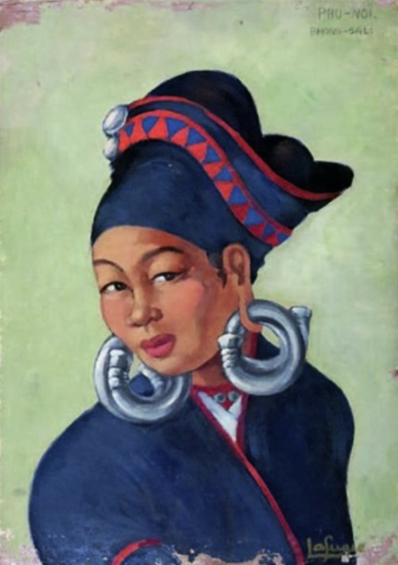 Far from traveling through Asia as some snobbish jet-setter, Léa Lafugie consistently directed her artistic attention to indigenous women. As a fashion illustrator in her earlier years, she was naturally enthralled by elaborate headdresses and garments since her first trip to the Himalayas. She also sensed women’s attire profundly reflected poorly documented minority cultures in the ethnic mosaic of Southeast Asia, and made a point in correctlynaming the ethnic groups her artistic subjects were belonging to, writing down toponyms in the local languages whenever possible.